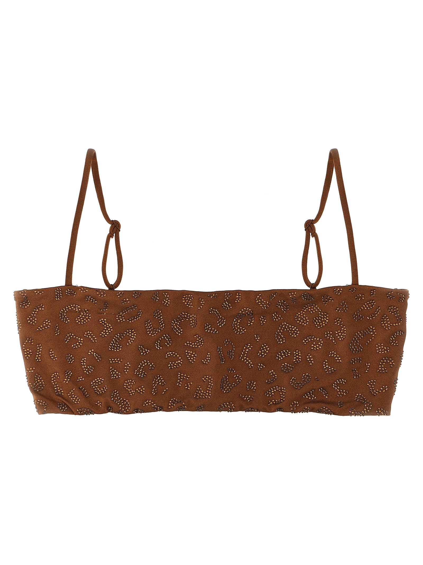 ‘Athena’ bikini top in stretch fabric with rhinestone appliqué, band model with front animal print and thin adjustable straps.