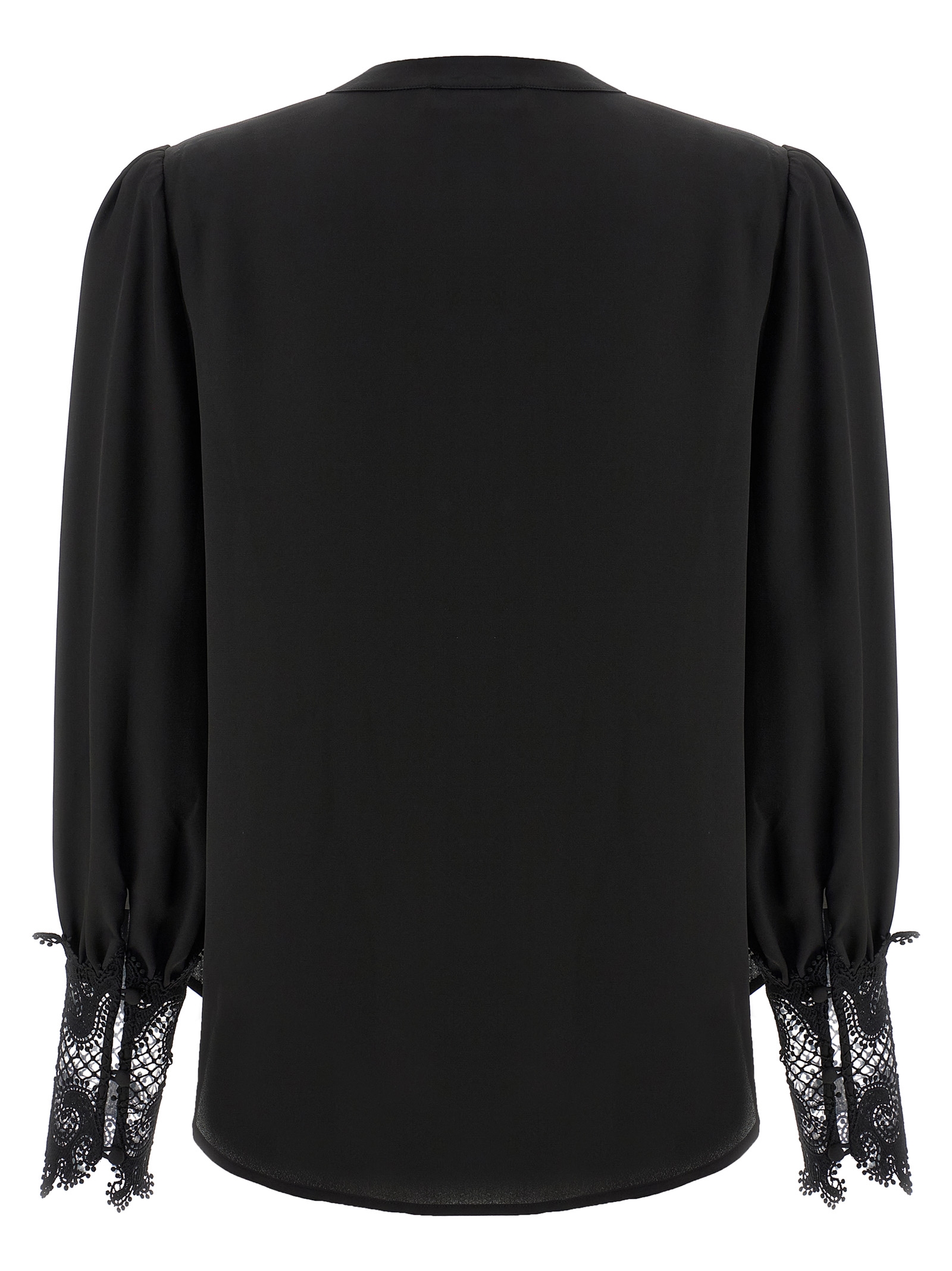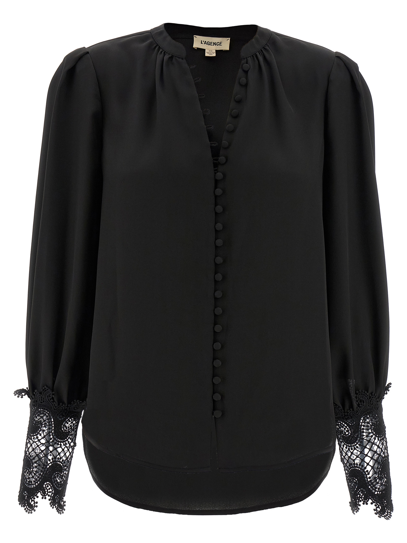 ‘Ava’ cady shirt, high neck, front button closure, long sleeves with elongated ruffled guipure lace cuffs and a slightly puff shoulder.