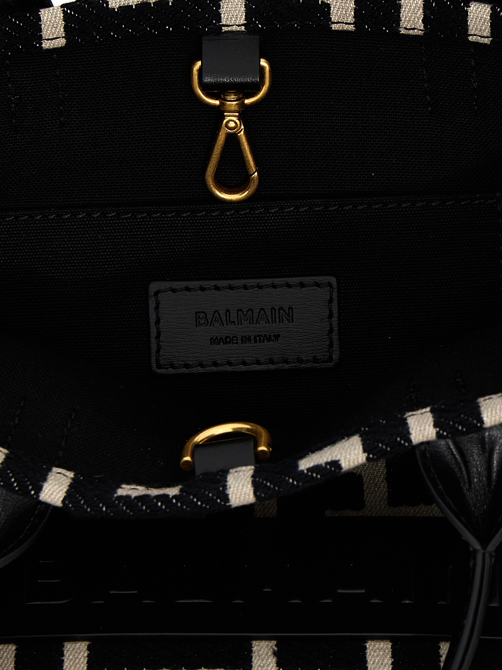 B-Army Small’ canvas shopping bag with all-over monogram logo, leather details, front leather logo patch, snap hook closure, double handle, adjustable shoulder strap.