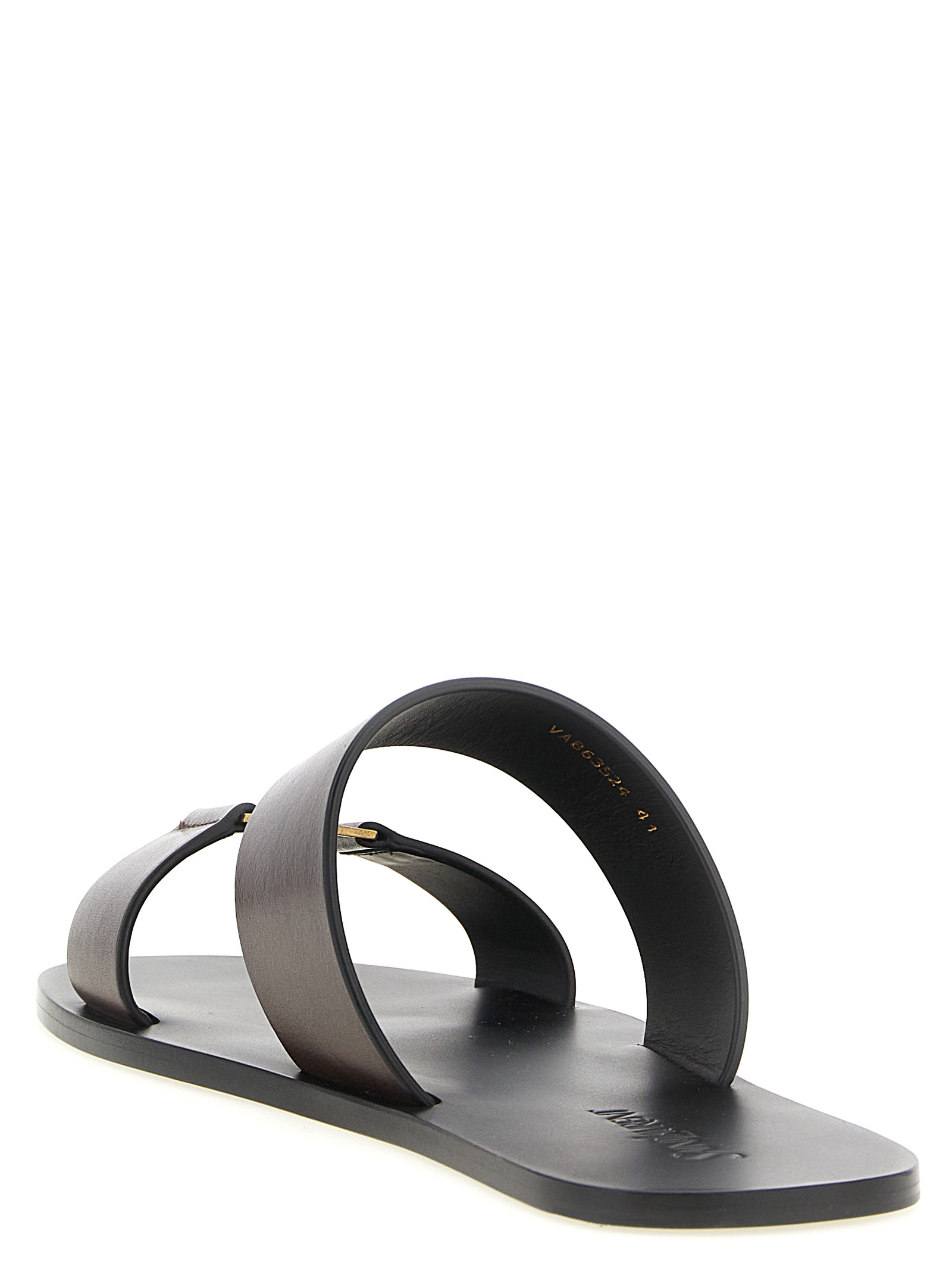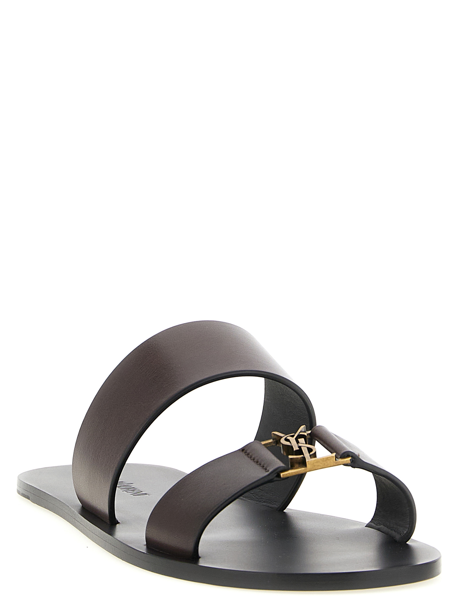 ‘Babylone’ leather flat sandals, two thick bands with antiqued effect metal ‘Cassandre’ logo on the front, leather sole.