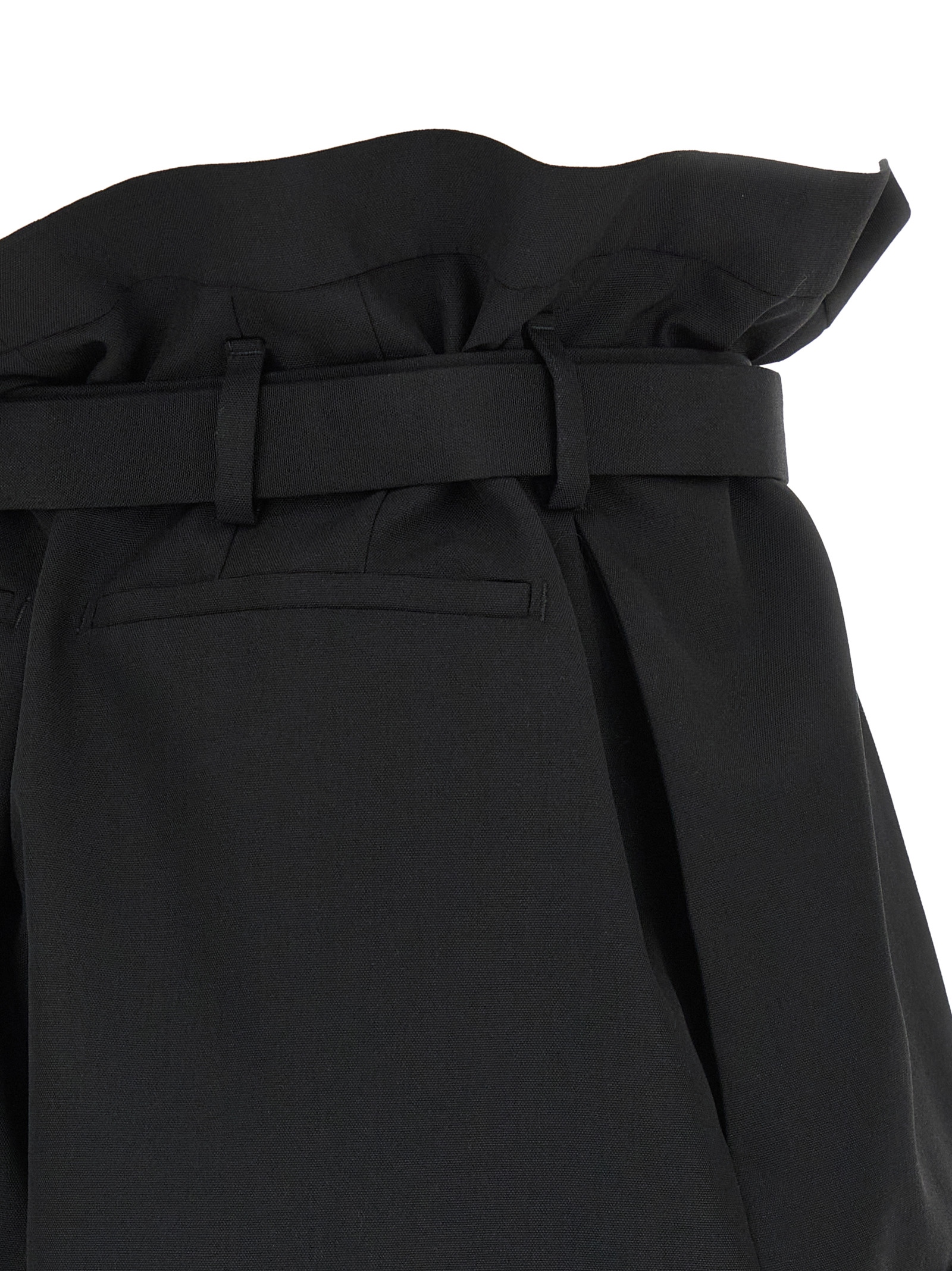 Wool and mohair blend shorts, pouch style, high waist, stretched pleat, button closure and front hook, pockets, turn-up hem, removable matching belt.