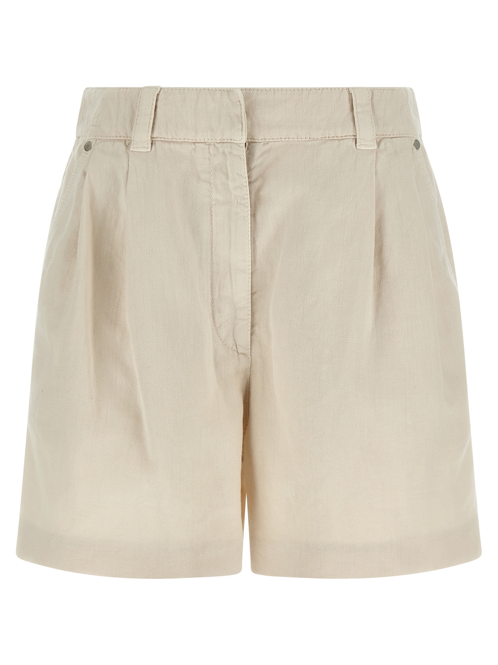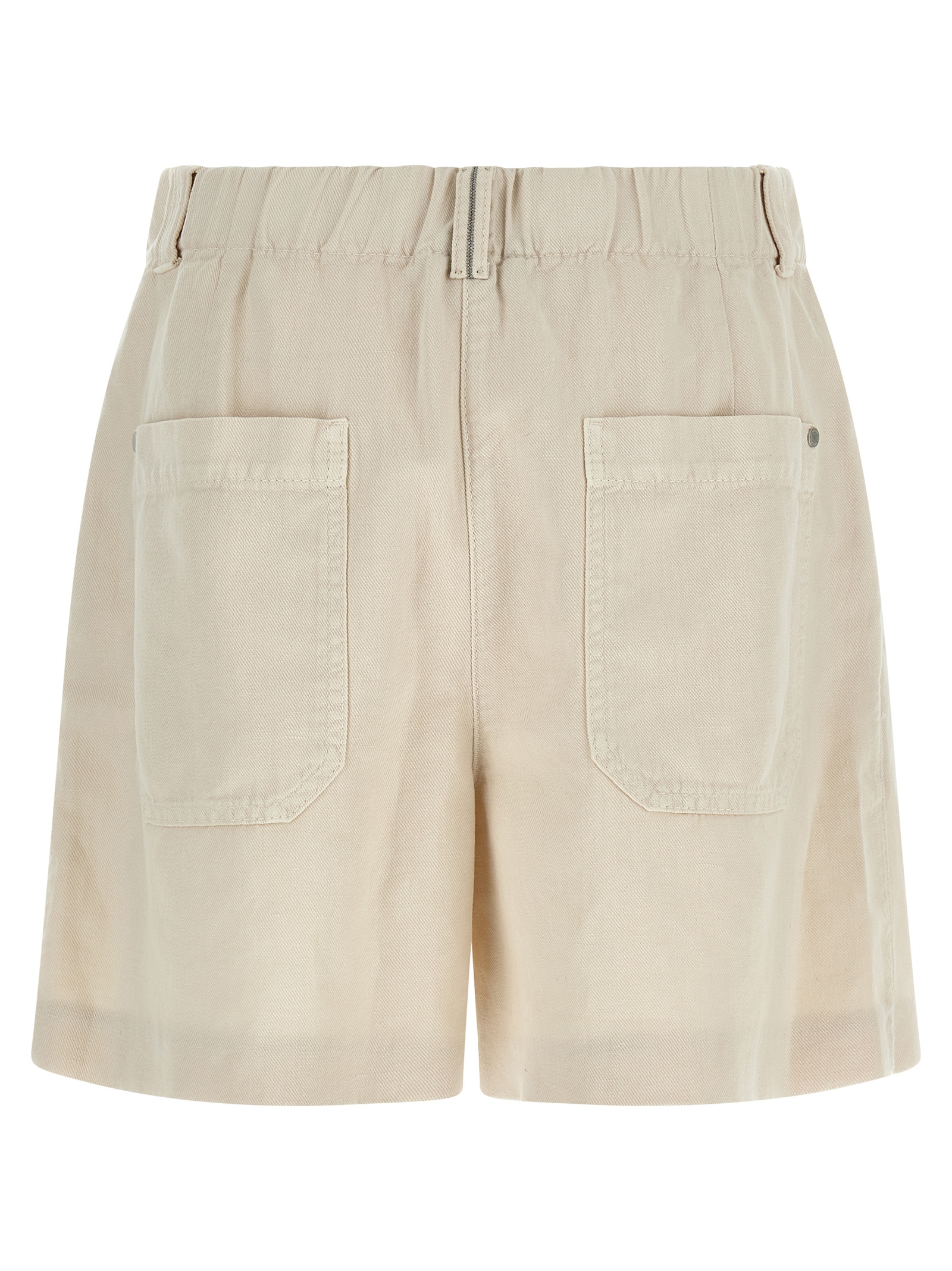 ‘Baggy’ shorts in garment-dyed cotton and linen cover, double pince, hook and front button zip closure, pockets, wide leg, back Monile detail.