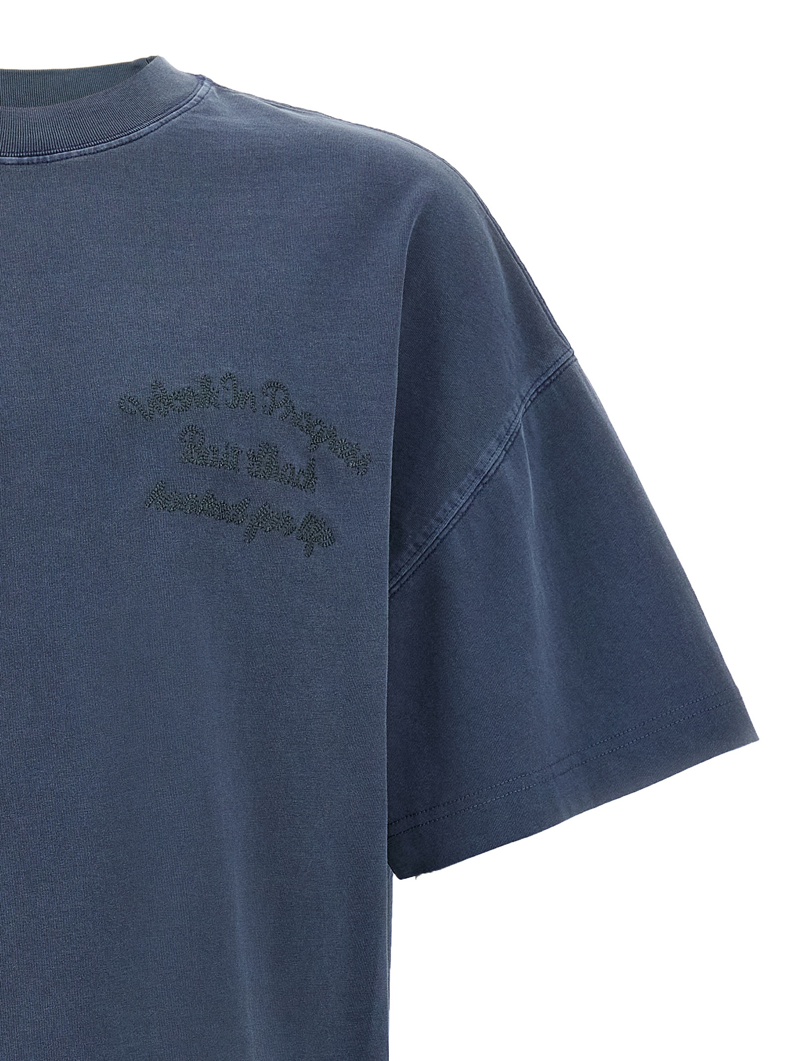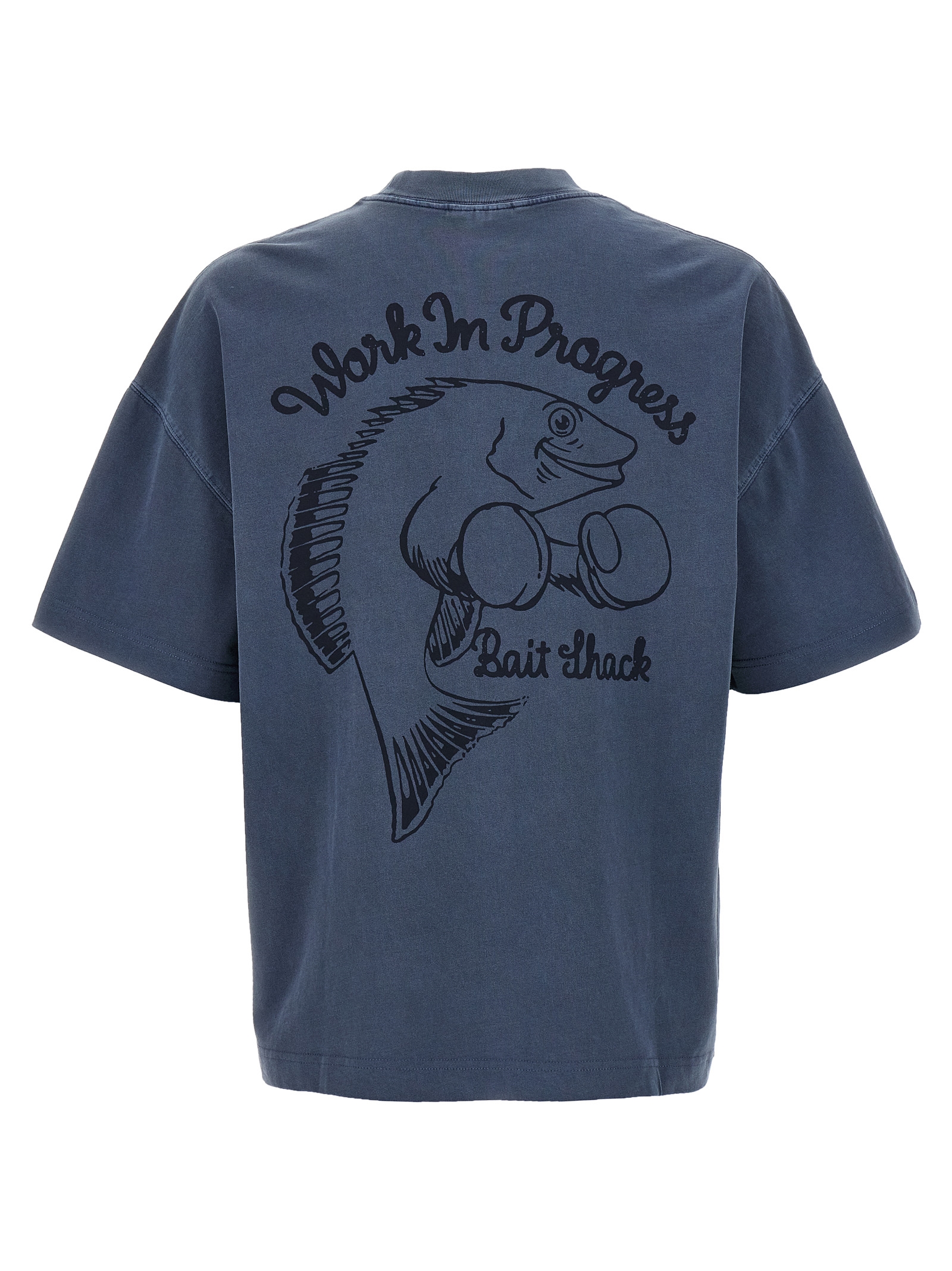 ‘Bait Shack’ medium weight cotton t-shirt dyed in melange effect garment, tone-on-tone embroidery on the front, crew neck, back print, short sleeves with dropped shoulders.
