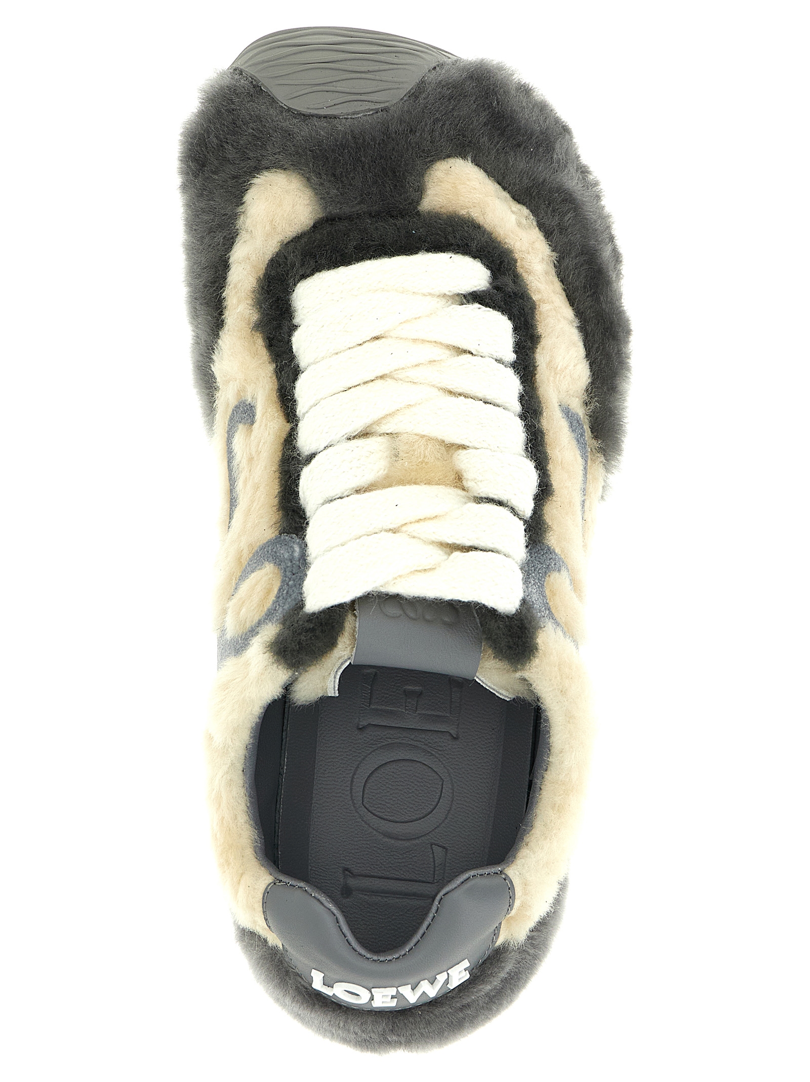 ‘Ballet Runner 2.0’ shearling sneakers with leather heel with contrasting lettering logo, asymmetrical rounded toe, side velvet logo, sock-style inner structure, lace-up closure, lightweight rubber sole and toe.