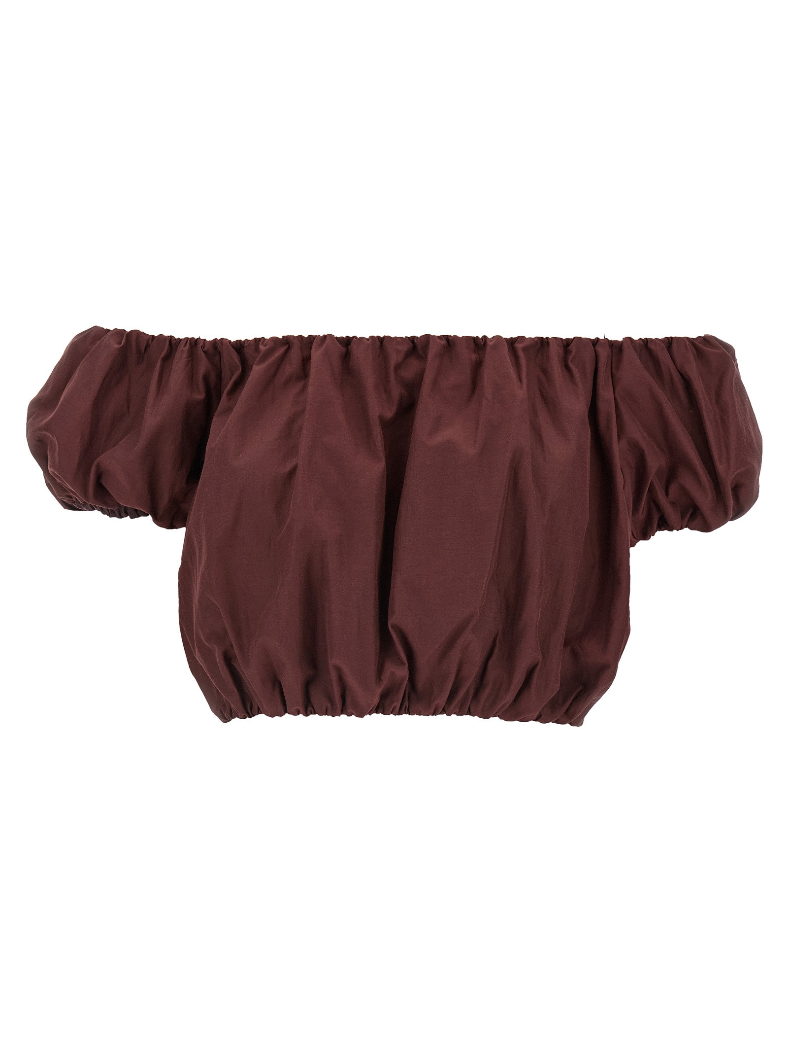 ‘Ballon’ crop top in cotton blend with curls, elastic above and bottom, off-the-shoulder crop style with short sleeves.