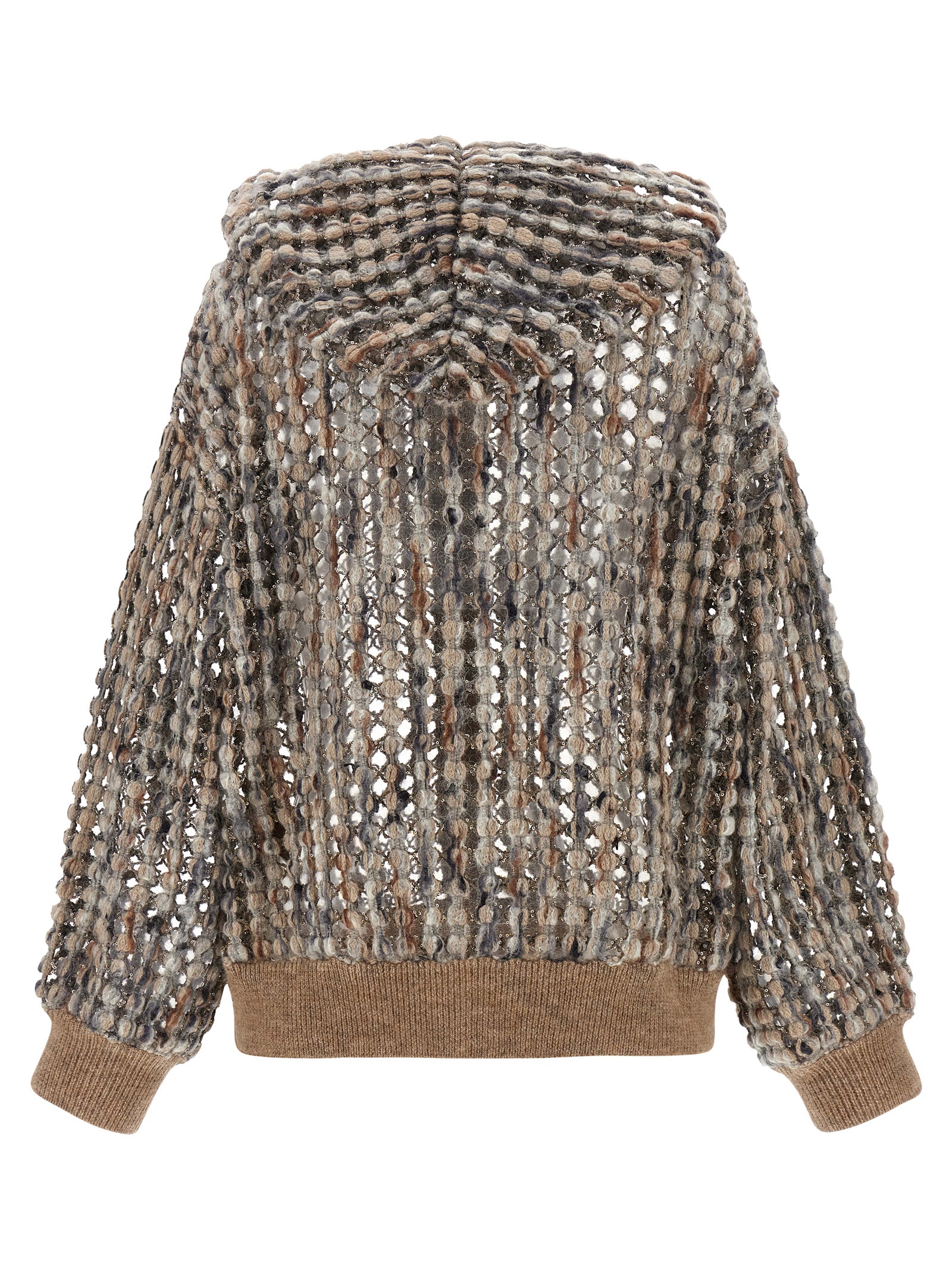 Balloon Net Embroidery’ knit cardigan in virgin wool, cashmere and mohair, mesh construction made with a thin thread of sequins, stretch ribbed knit details, hood, front zip closure, long sleeves with cuffs and dropped shoulder.
