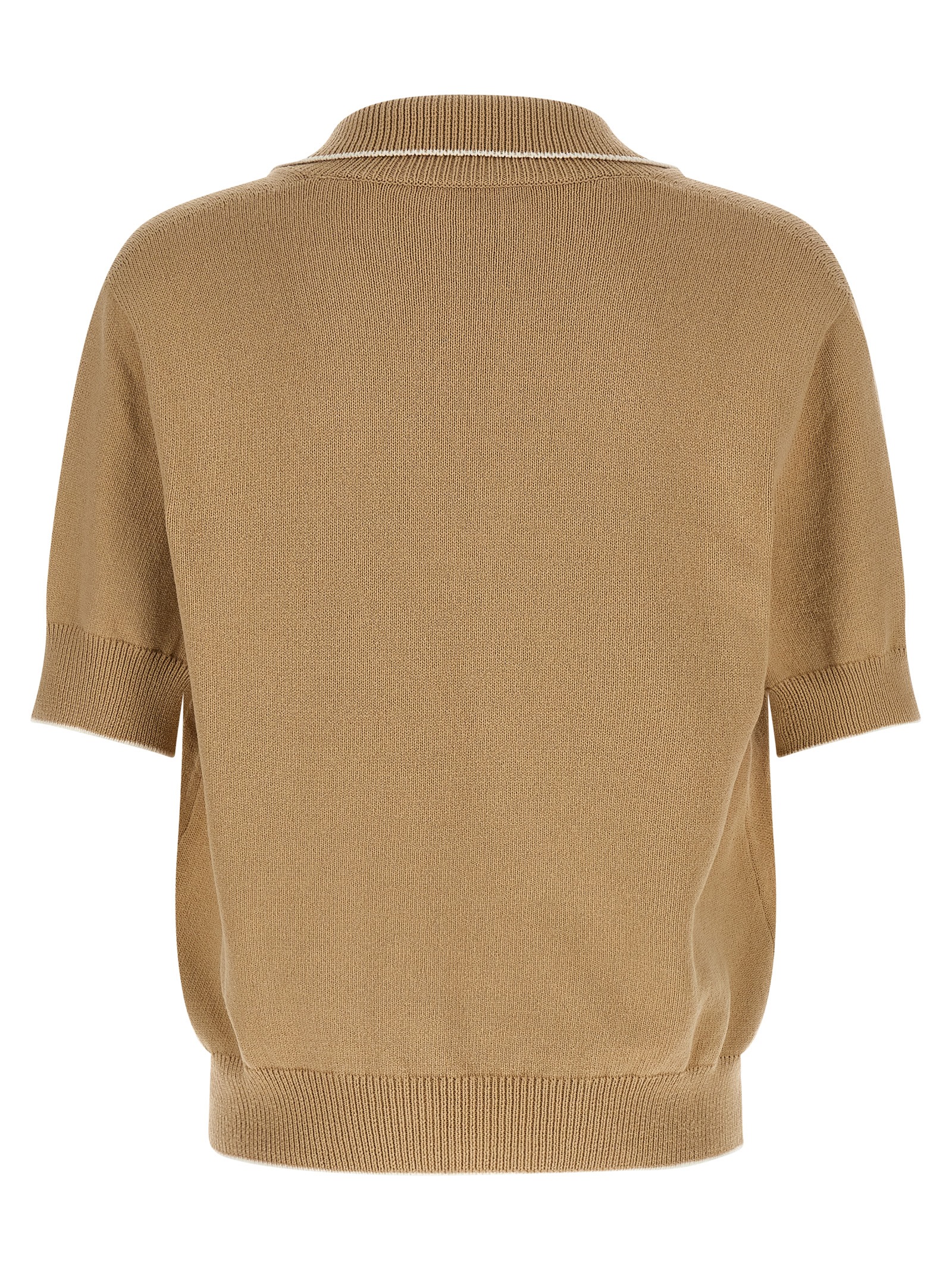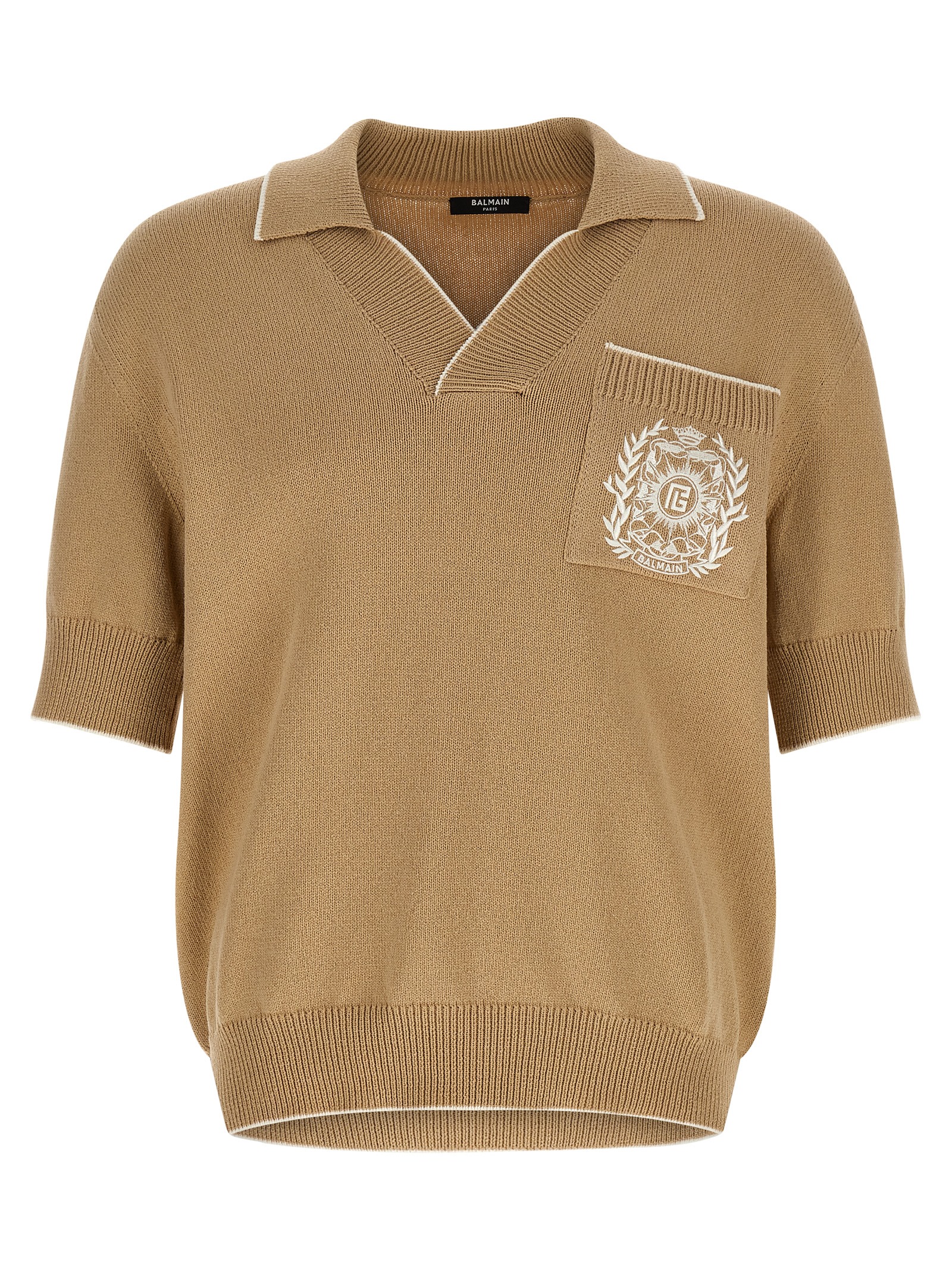 Cotton knit polo shirt with contrast piping, collar, V-neck, breast pocket with ‘Balmain Stemma’ embroidery, short sleeves with cuffs.