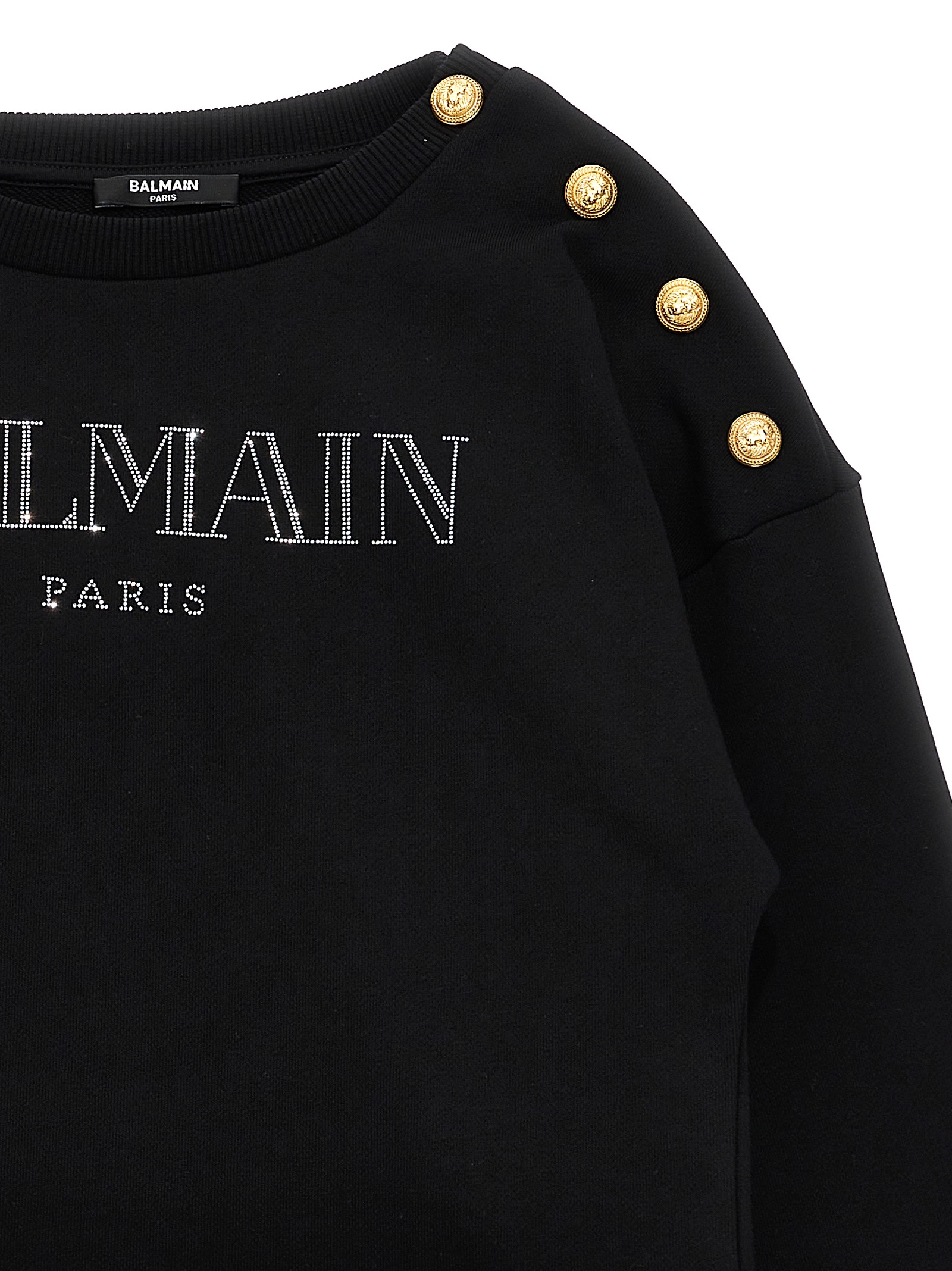 Brushed cotton sweatshirt with micro rhinestone ‘Balmain Vintage’ print, crewneck, long sleeves with ‘Leone Catena’ button detail on the shoulder.