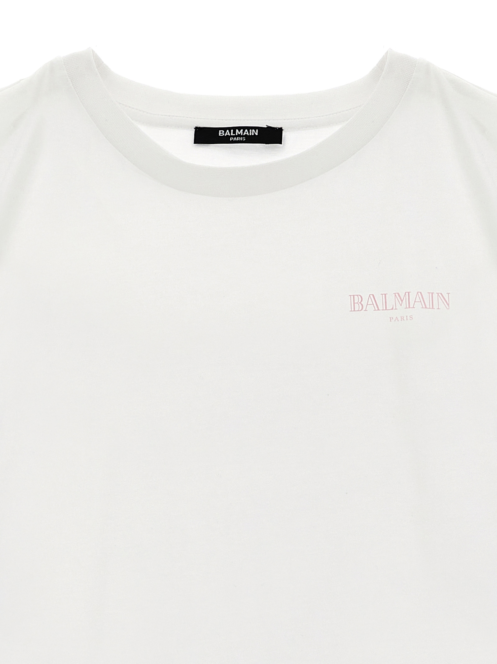 Cotton T-shirt with front ‘Balmain Vintage’ print, crop model, crew neck, short sleeves with dropped shoulders.
