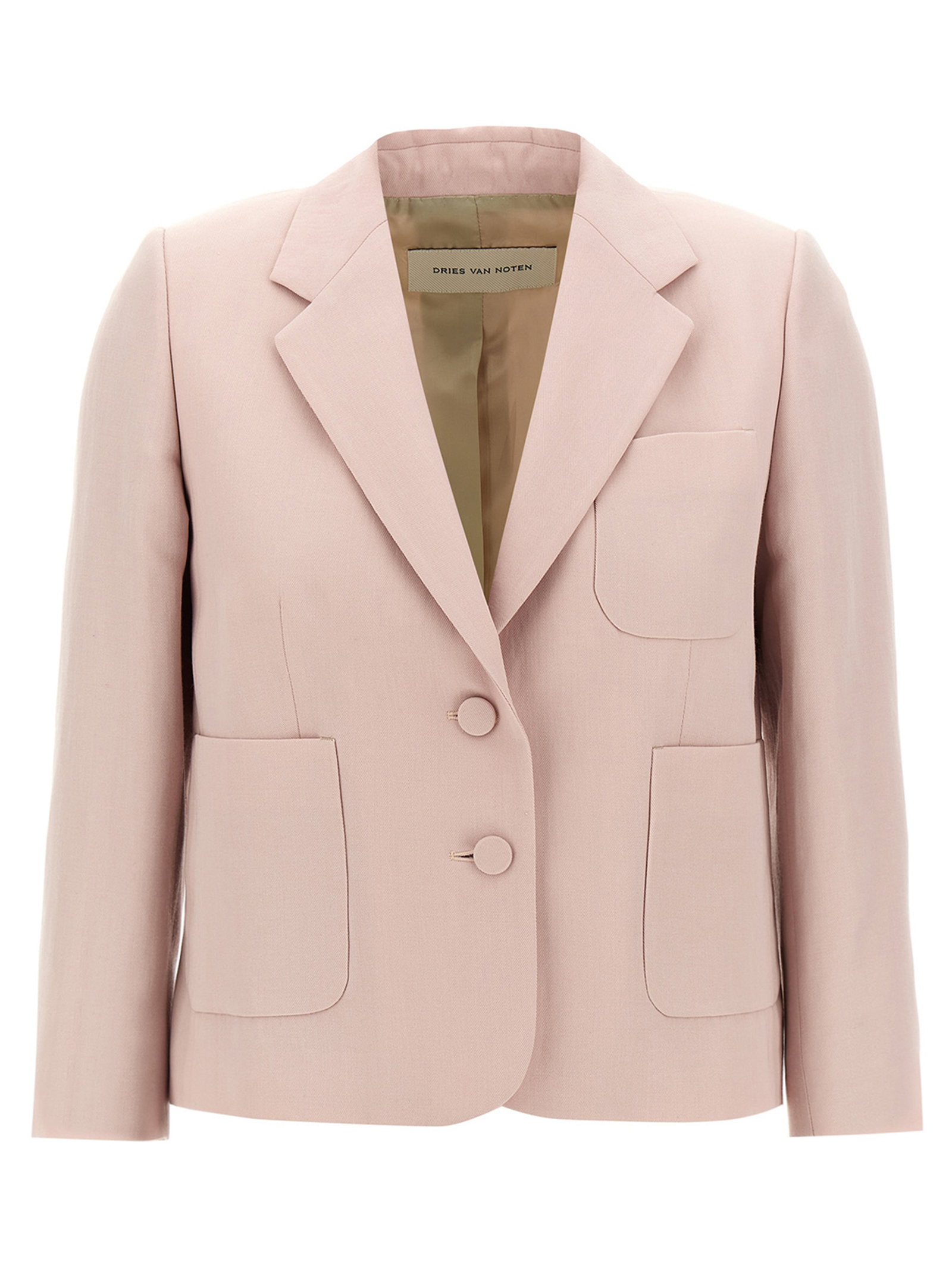 ‘Bamis’ single-breasted crop blazer in wool and paper yarn blend with front button closure, mirror lapels, pockets, long sleeves, slightly padded shoulders, back split, lining.