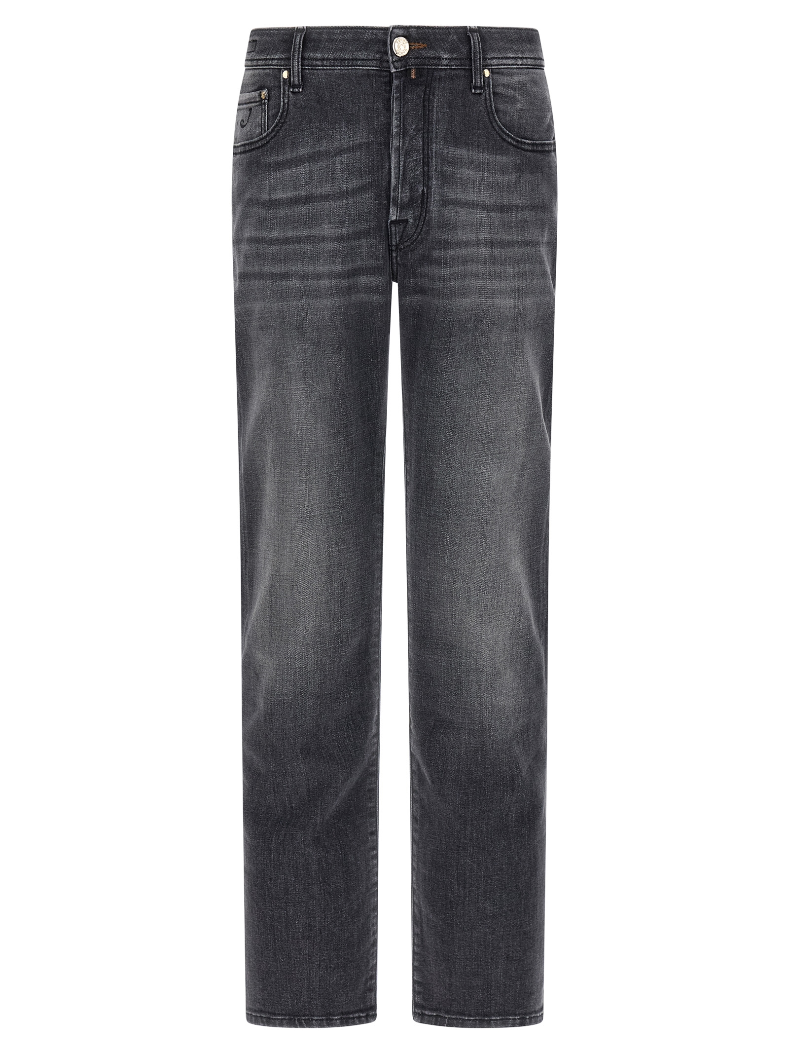 ‘Bard’ vintage effect stretch cotton denim jeans with rinse wash, mid waist, front button closure, five pockets, back leather logo tag.