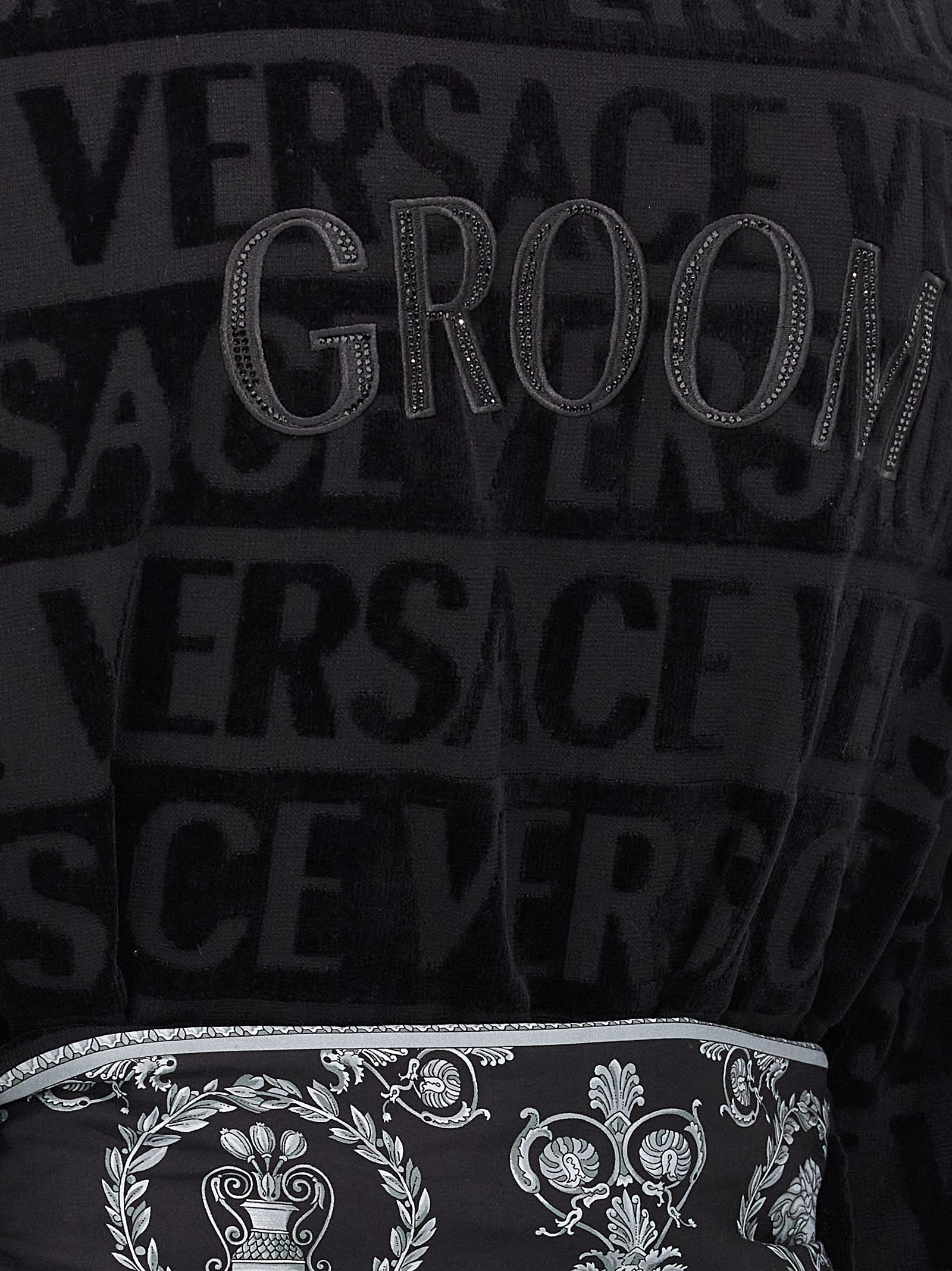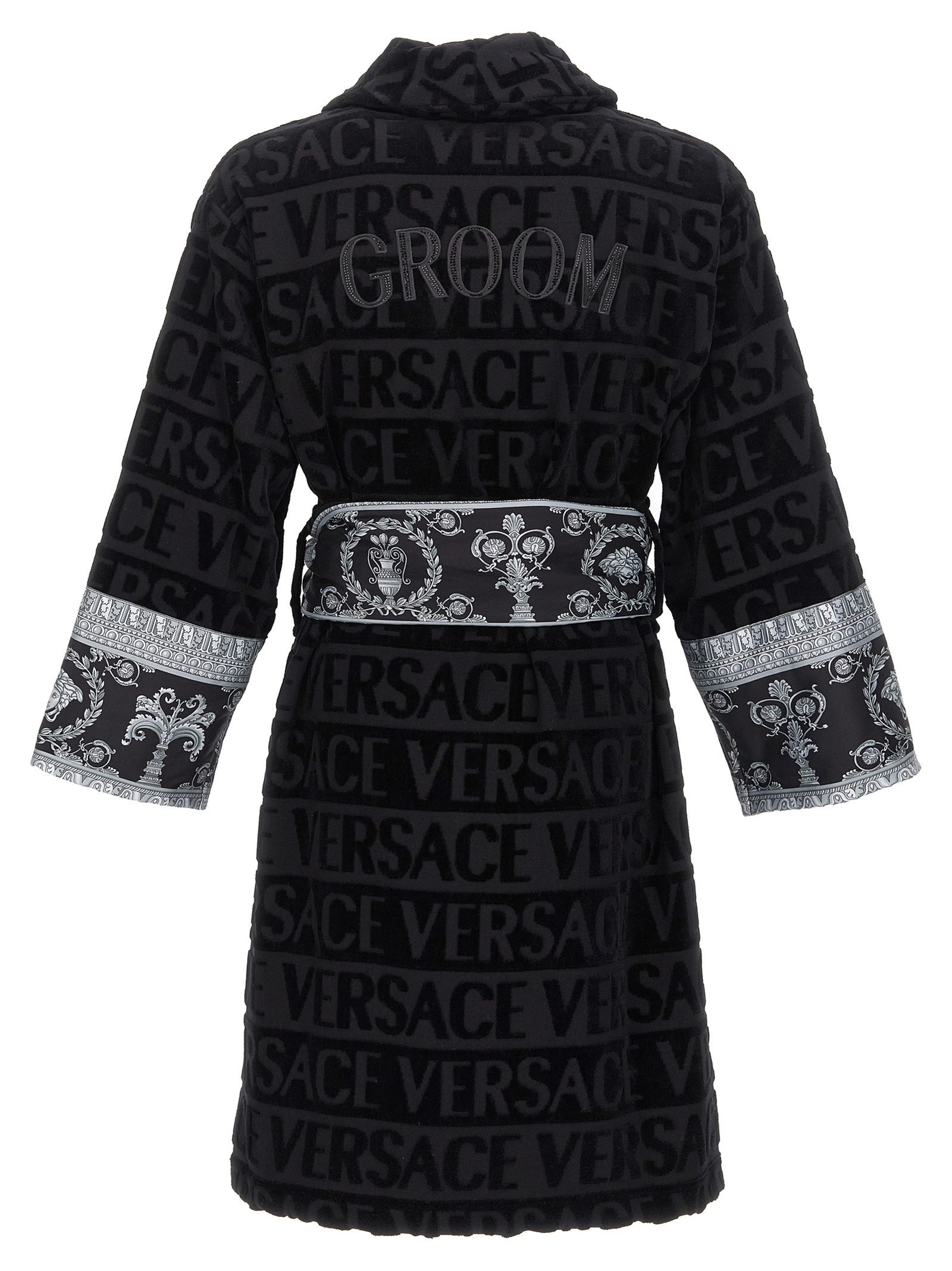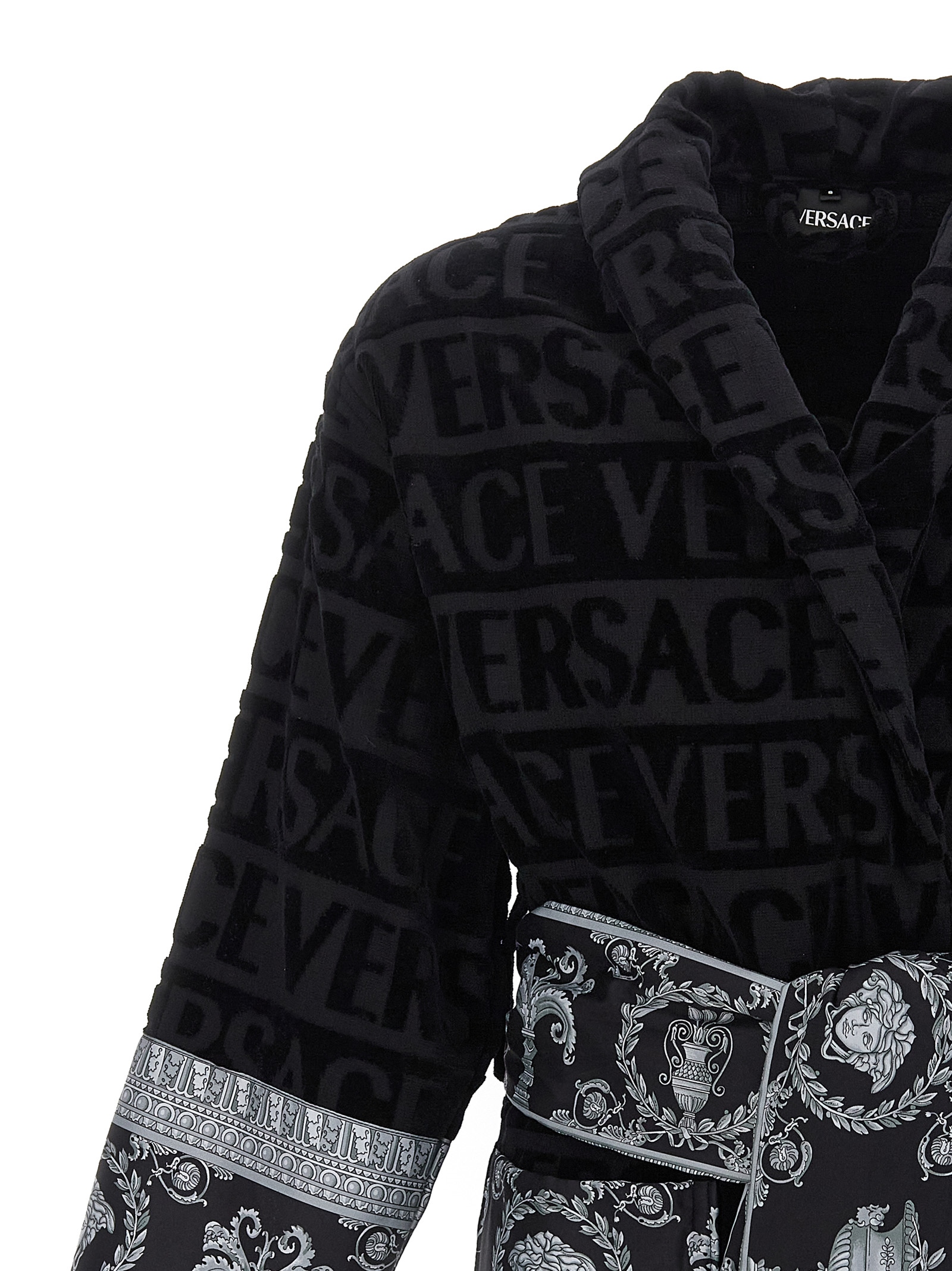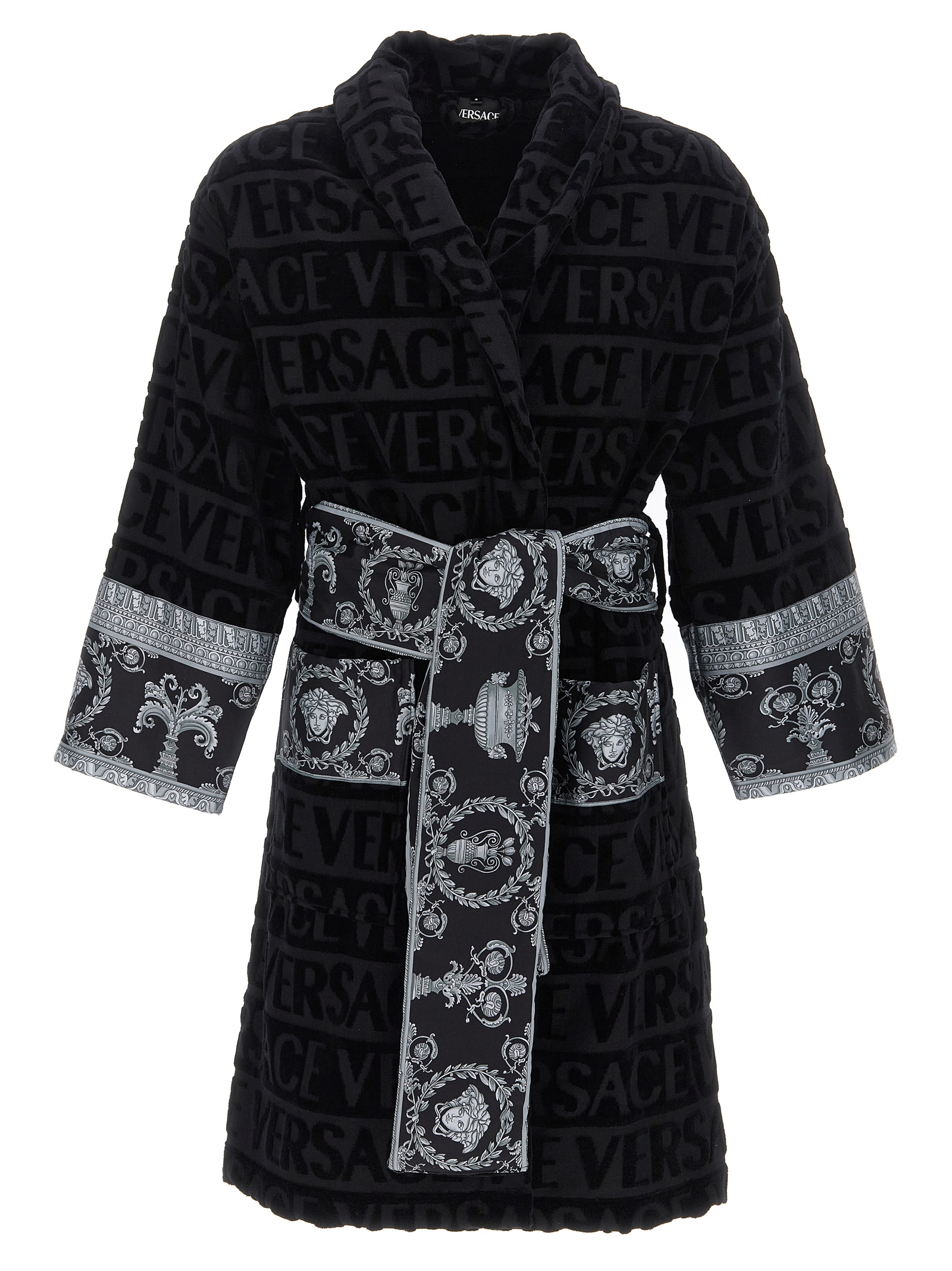 Cotton terry bathrobe with all-over embossed logo, ‘Barocco’ application detail, knotted belt closure at the waist, hood, pockets, long sleeves.