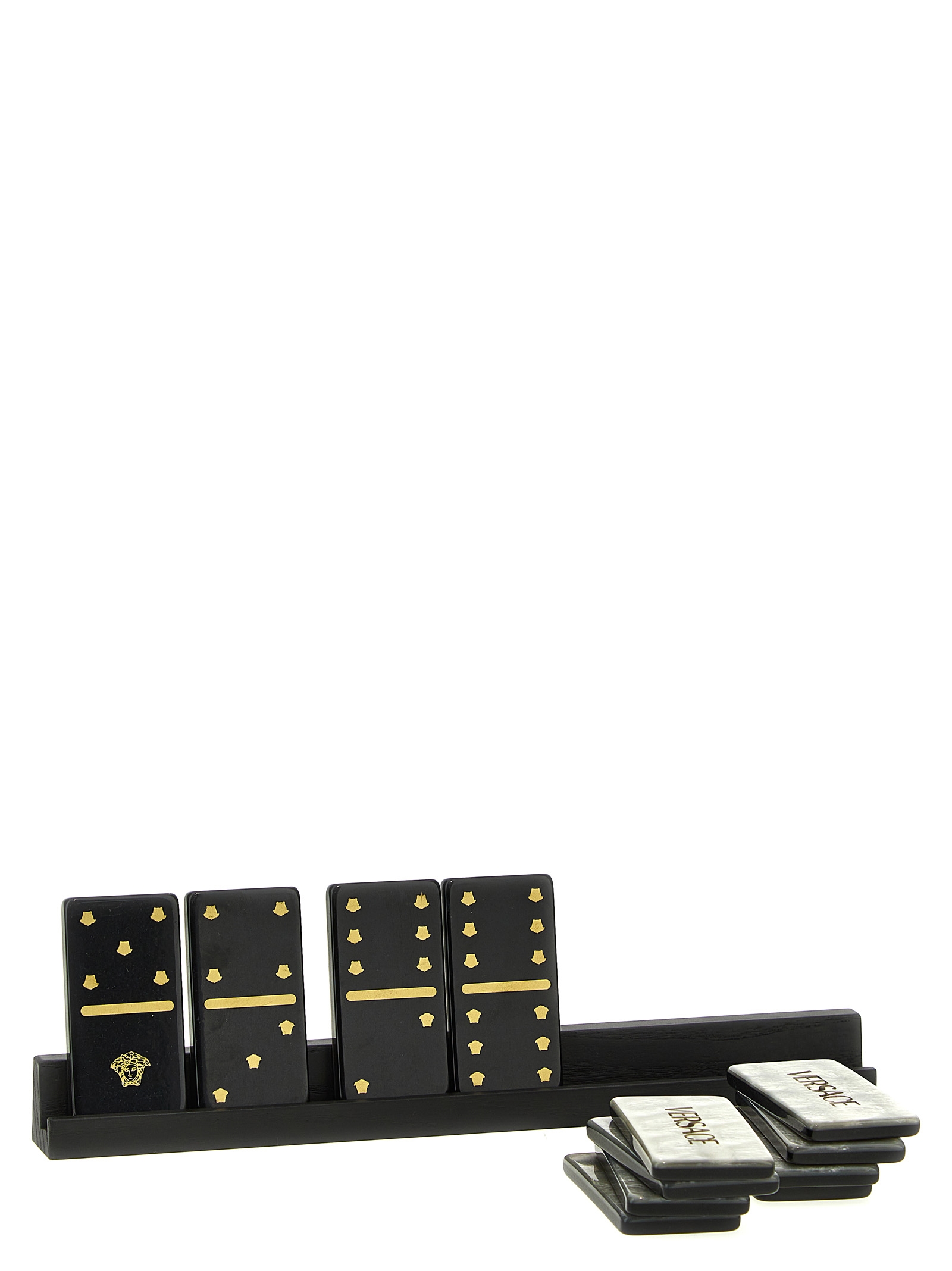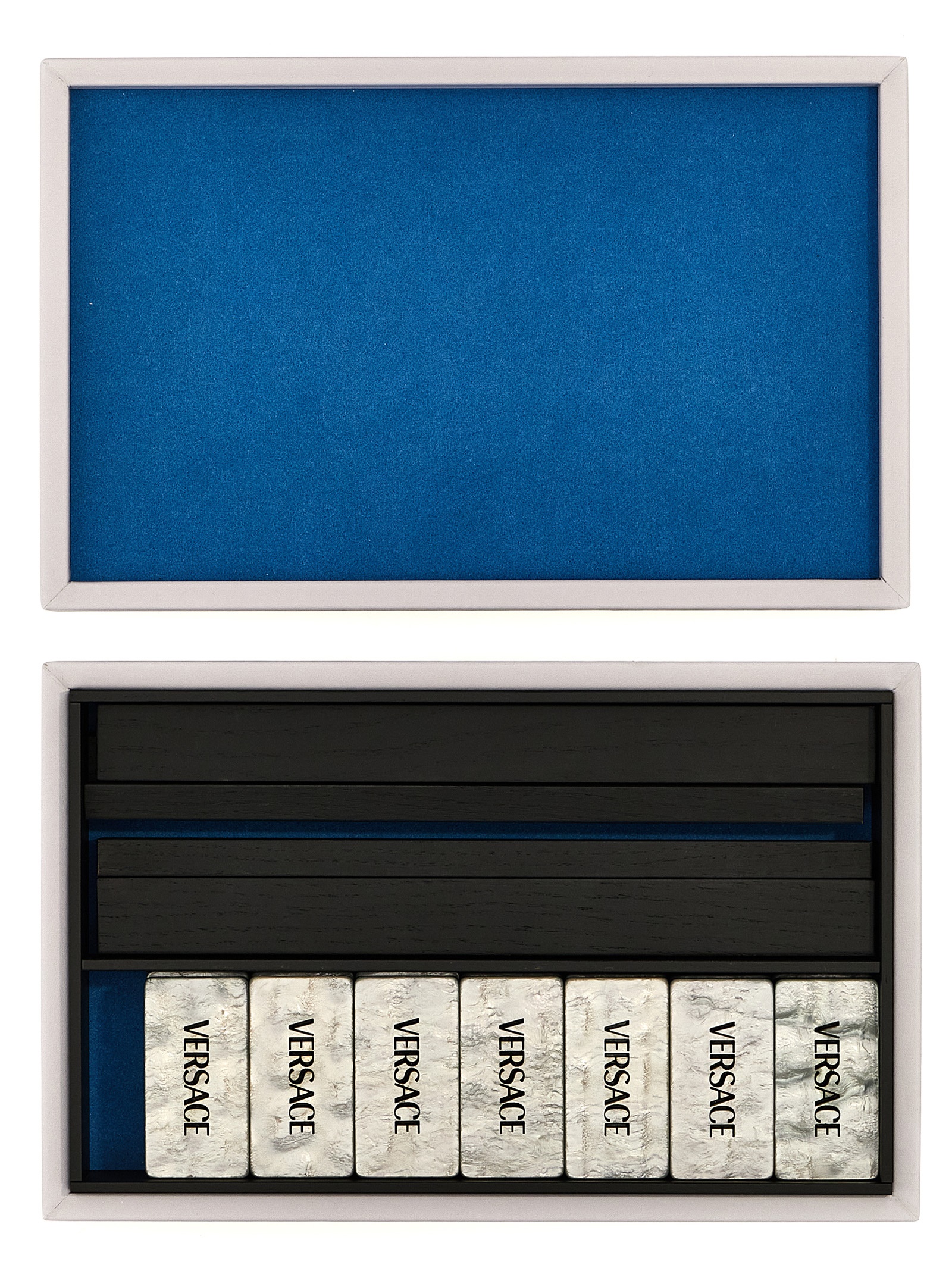 Domino board with Barocco print characterized by leather exterior and suede and wood interior. The pieces are embellished with a logo engraved on an iridescent background on one side and Medusa-shaped dots on the other.