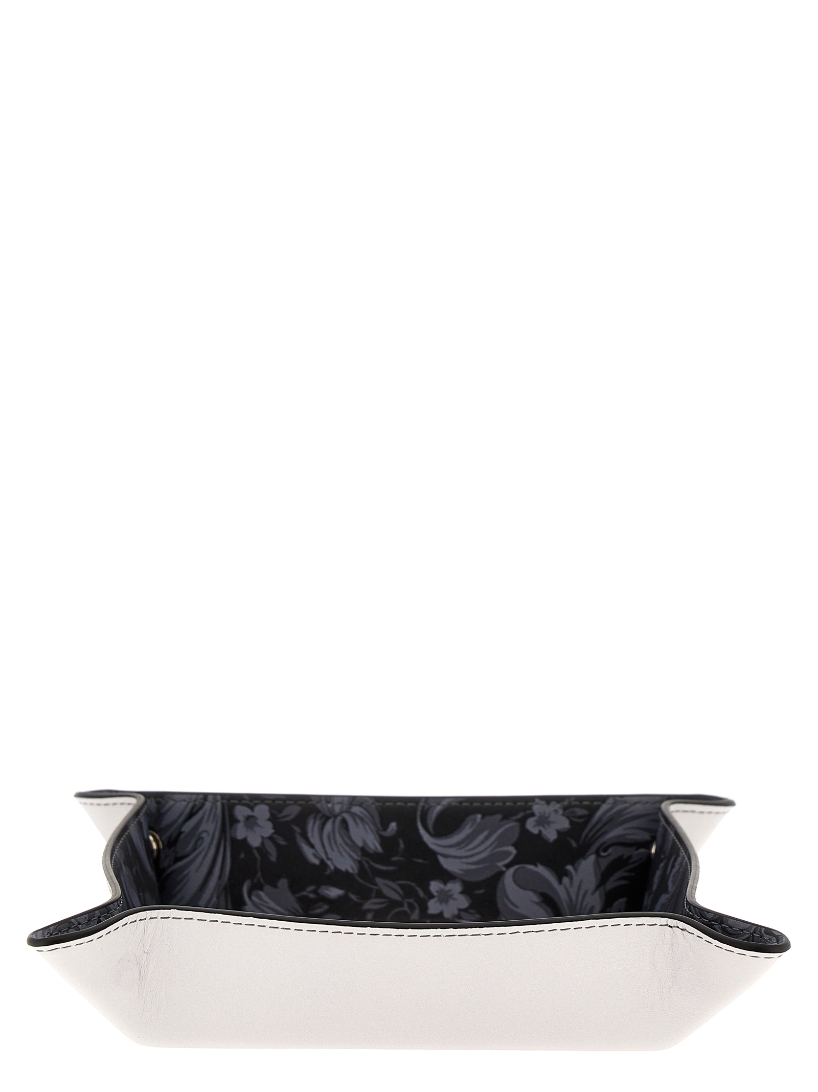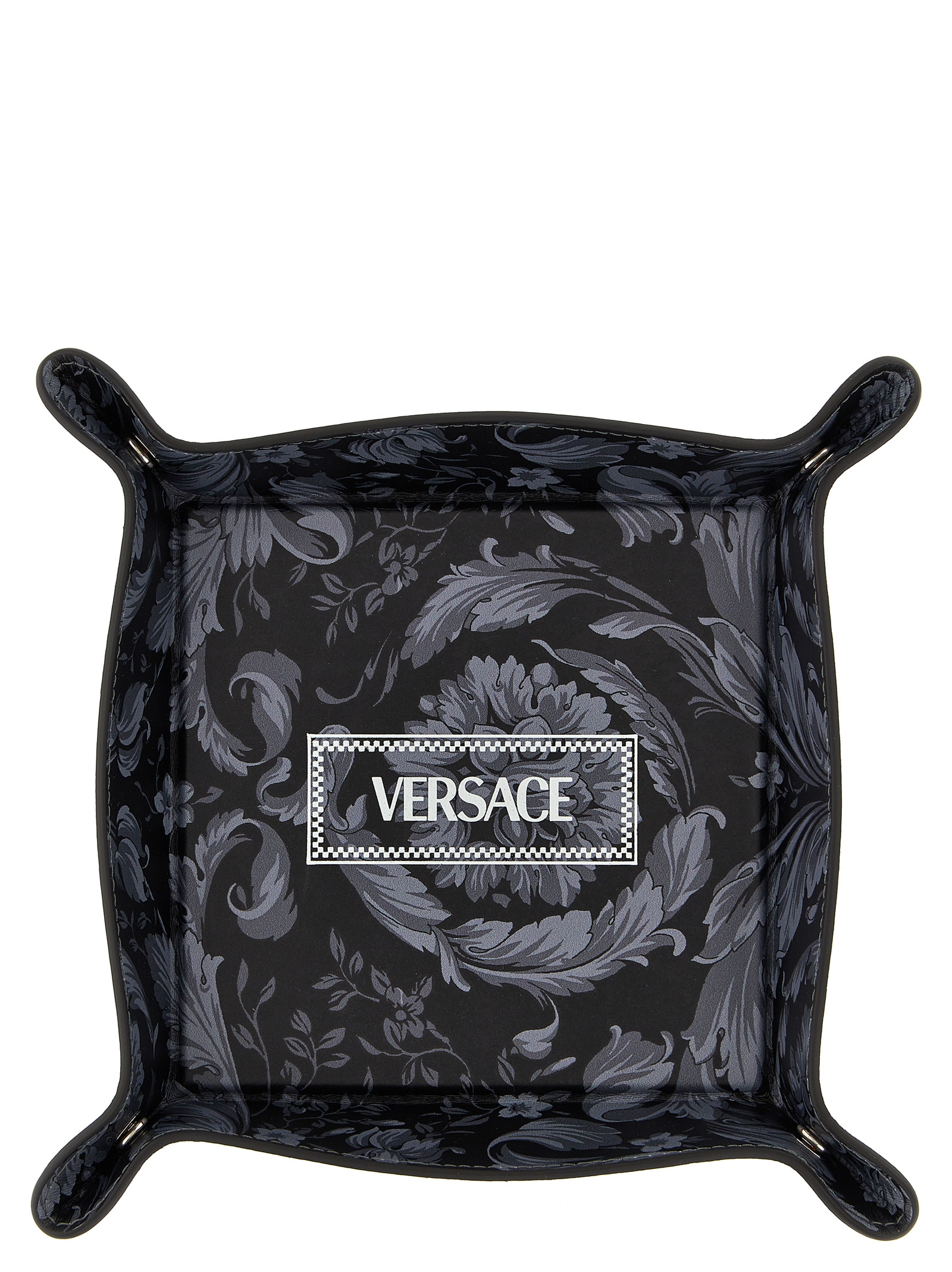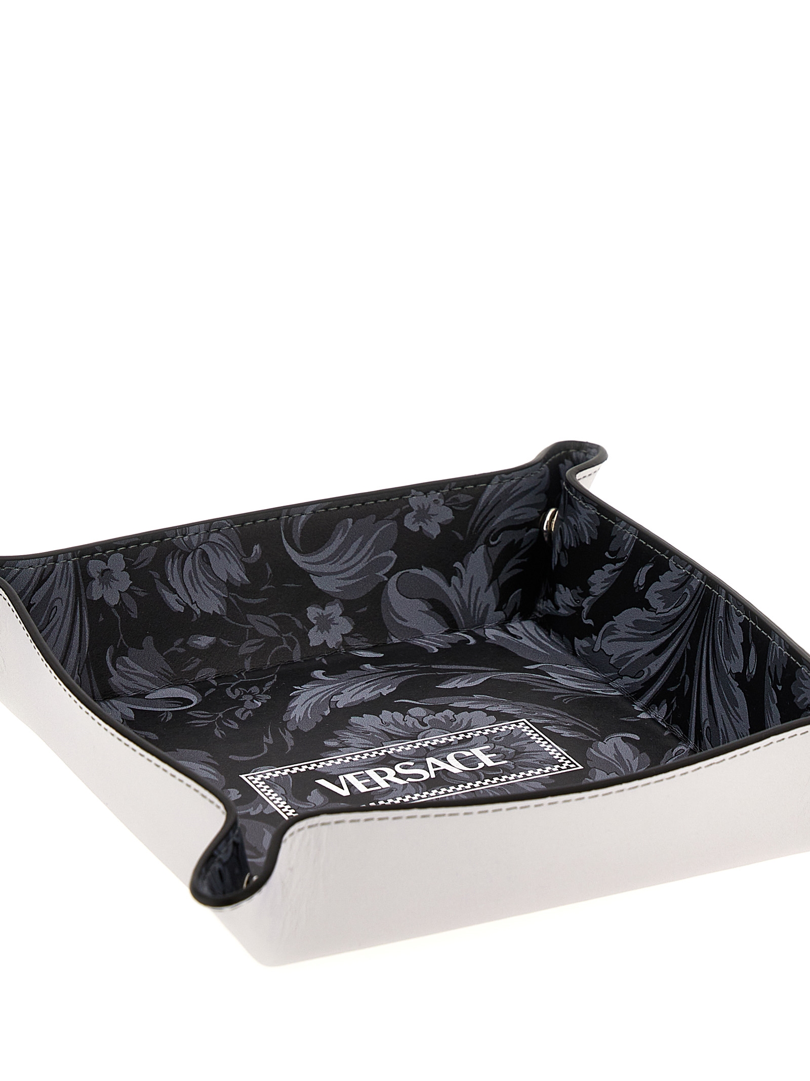 Leather valet tray with all-over ‘Barocco’ print, logo print, and button-up corners.