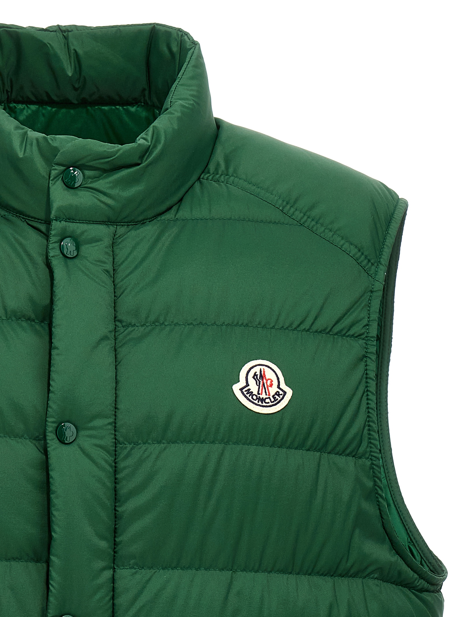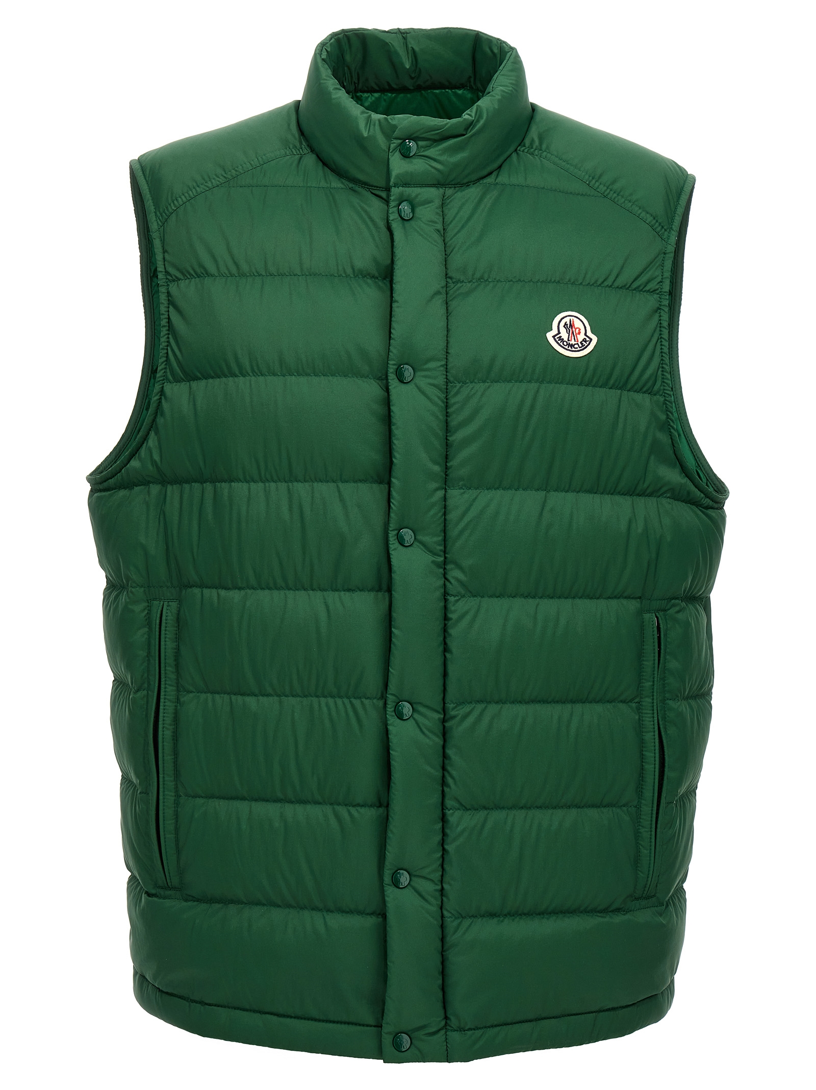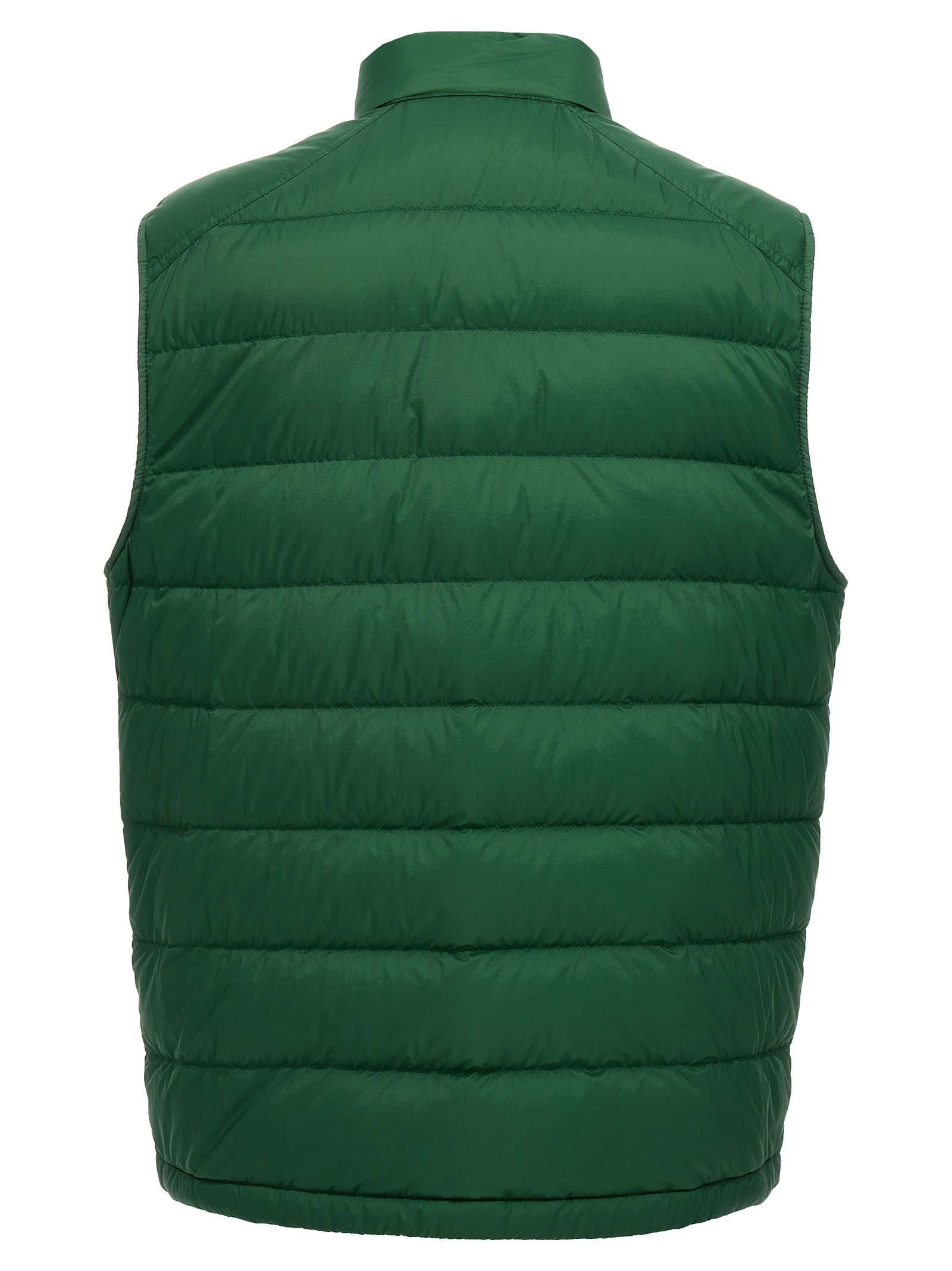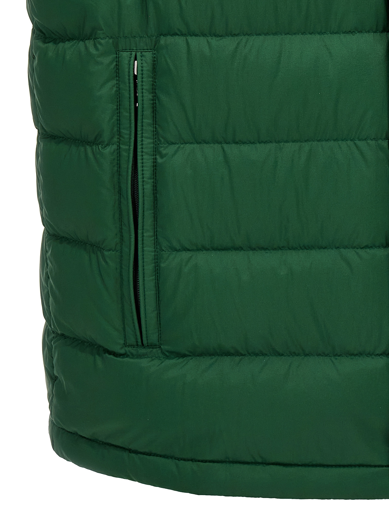 ‘Barthe’ vest in slightly recycled saison longue with feather padding, front logo patch, zip and snap button closure, pockets, drawstring on the hem.