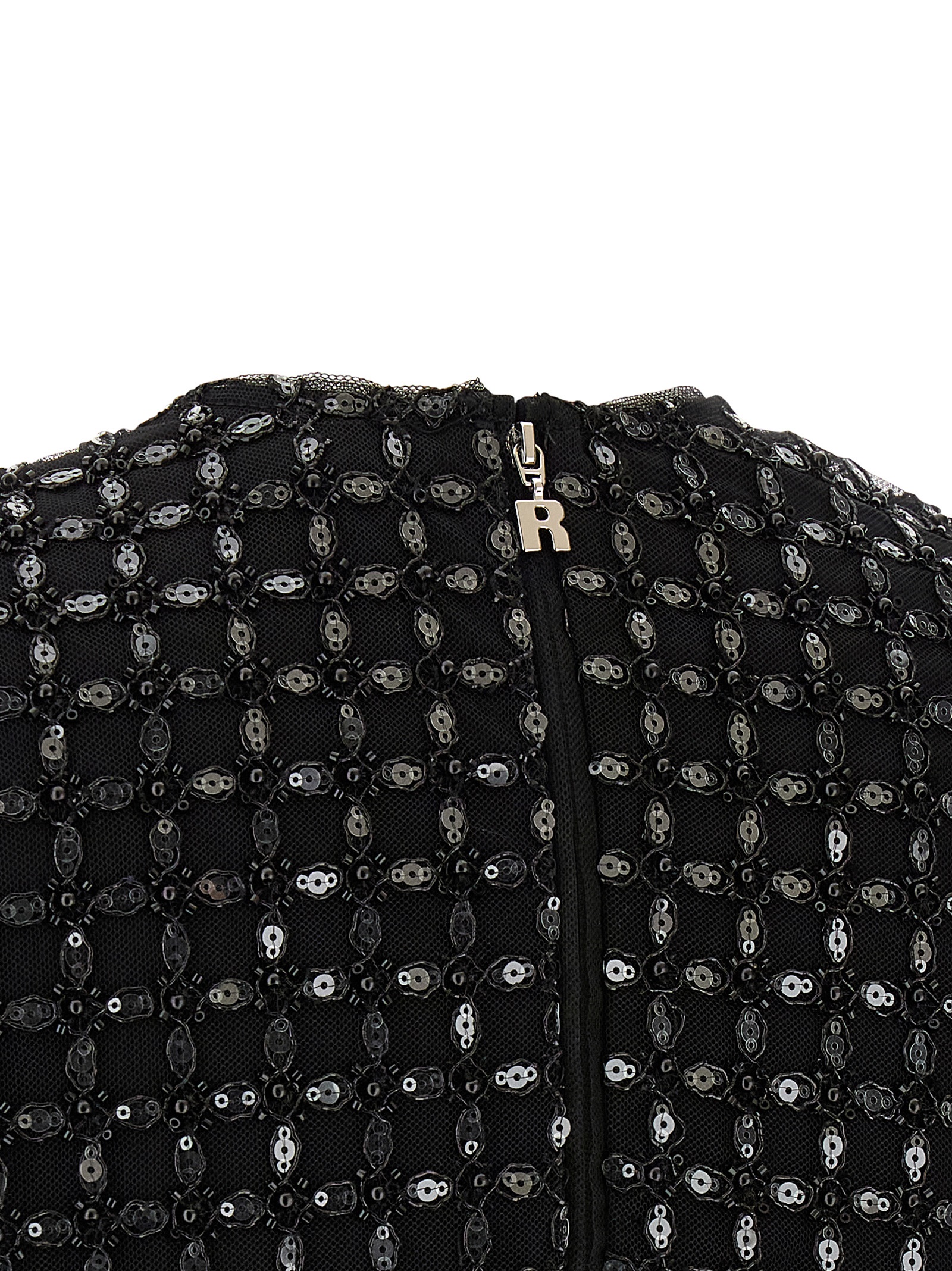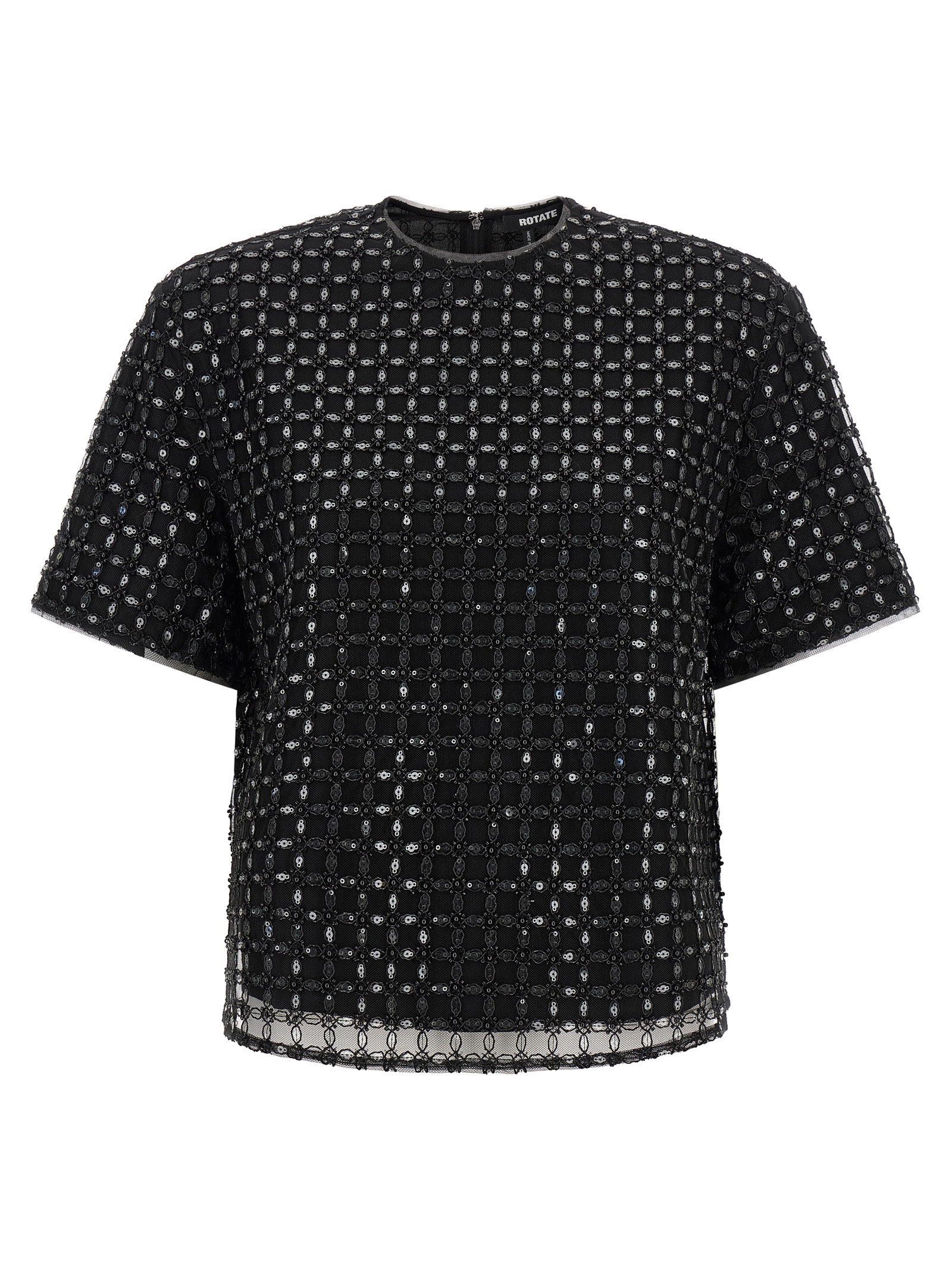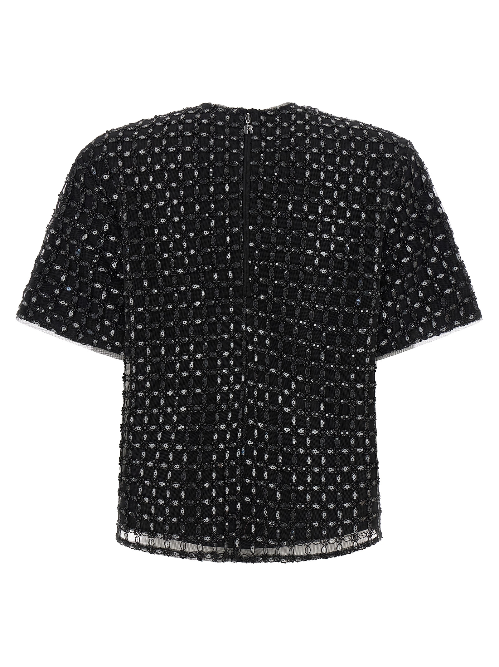 ‘Beaded Oversize’ tulle evening top embroidered with beads and all-over sequins, crew neck, back zip closure, short sleeves.