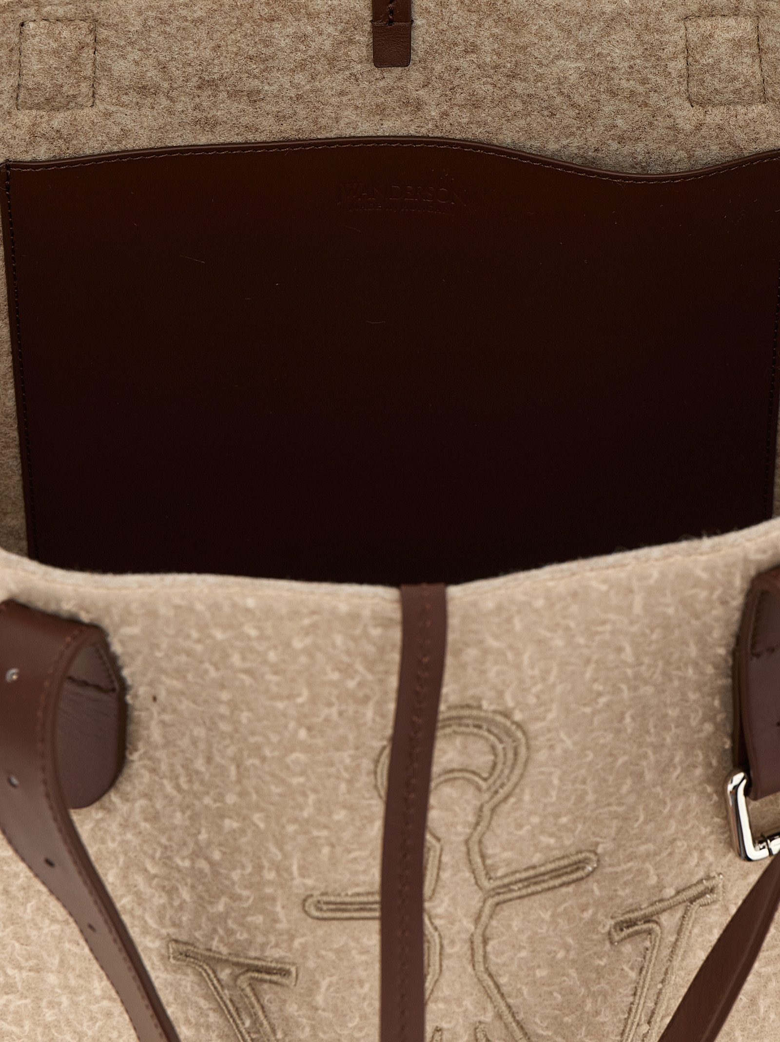 ‘Belt Tote’ textured felt fabric shopping bag with contrast leather details, tone-on-tone logo embroidery on the front, lacing closure, double fixed handle with metal buckle detail.