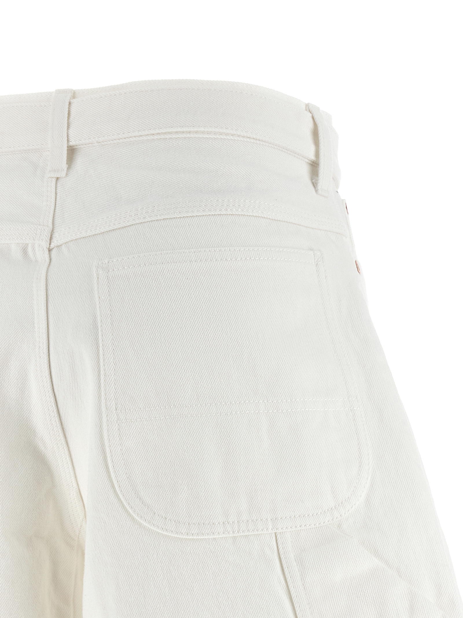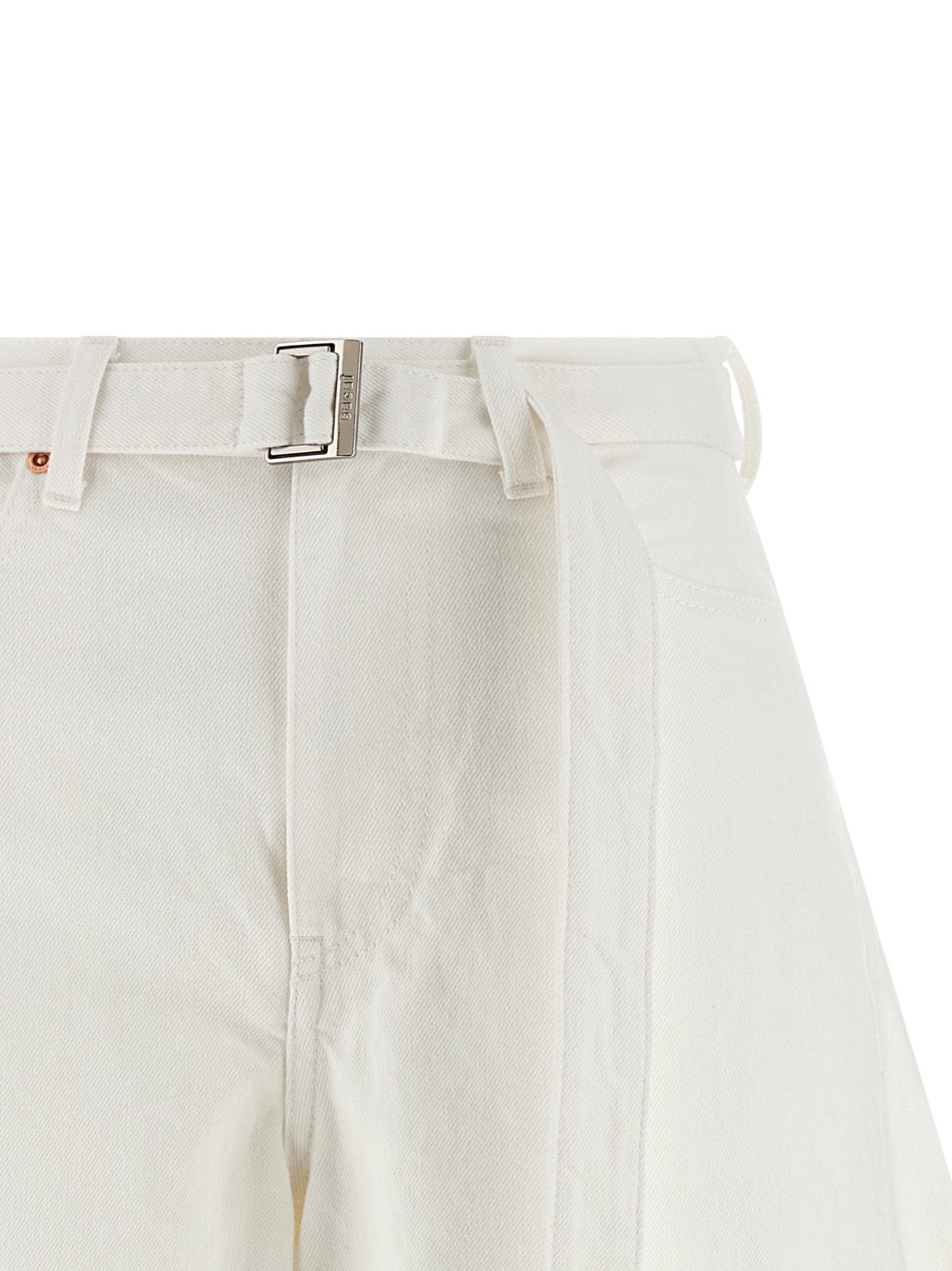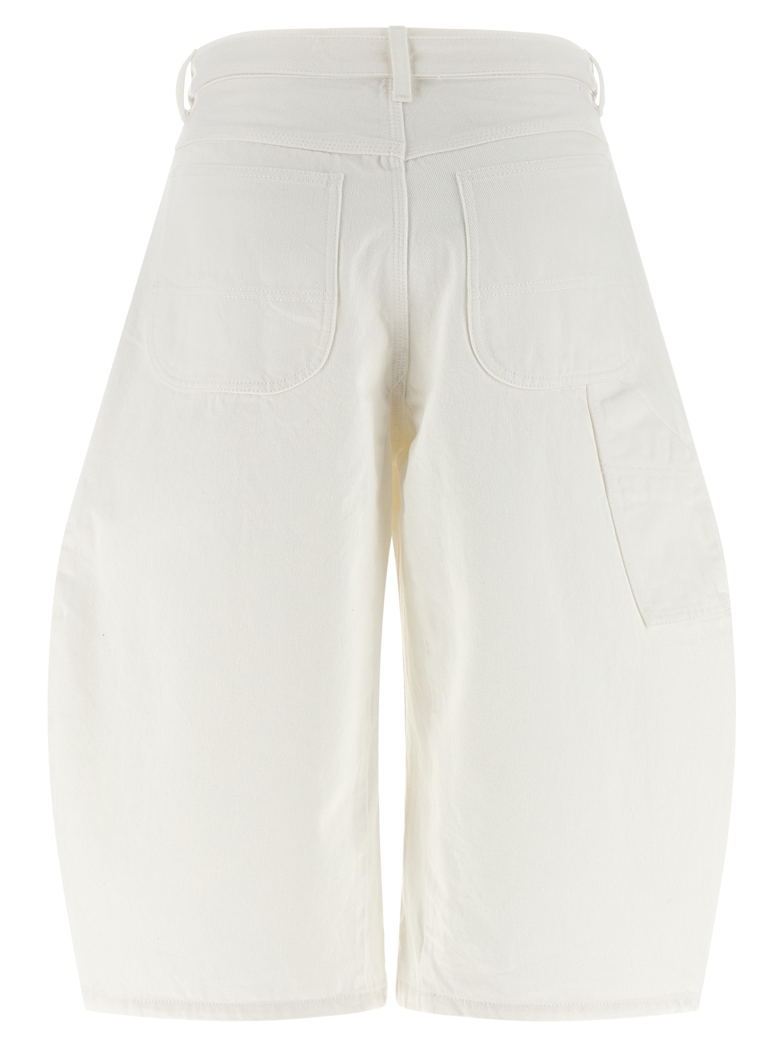 Garment-dyed cotton denim bermuda shorts with wide, curved leg, front zip and button closure, five pockets, and removable belt.