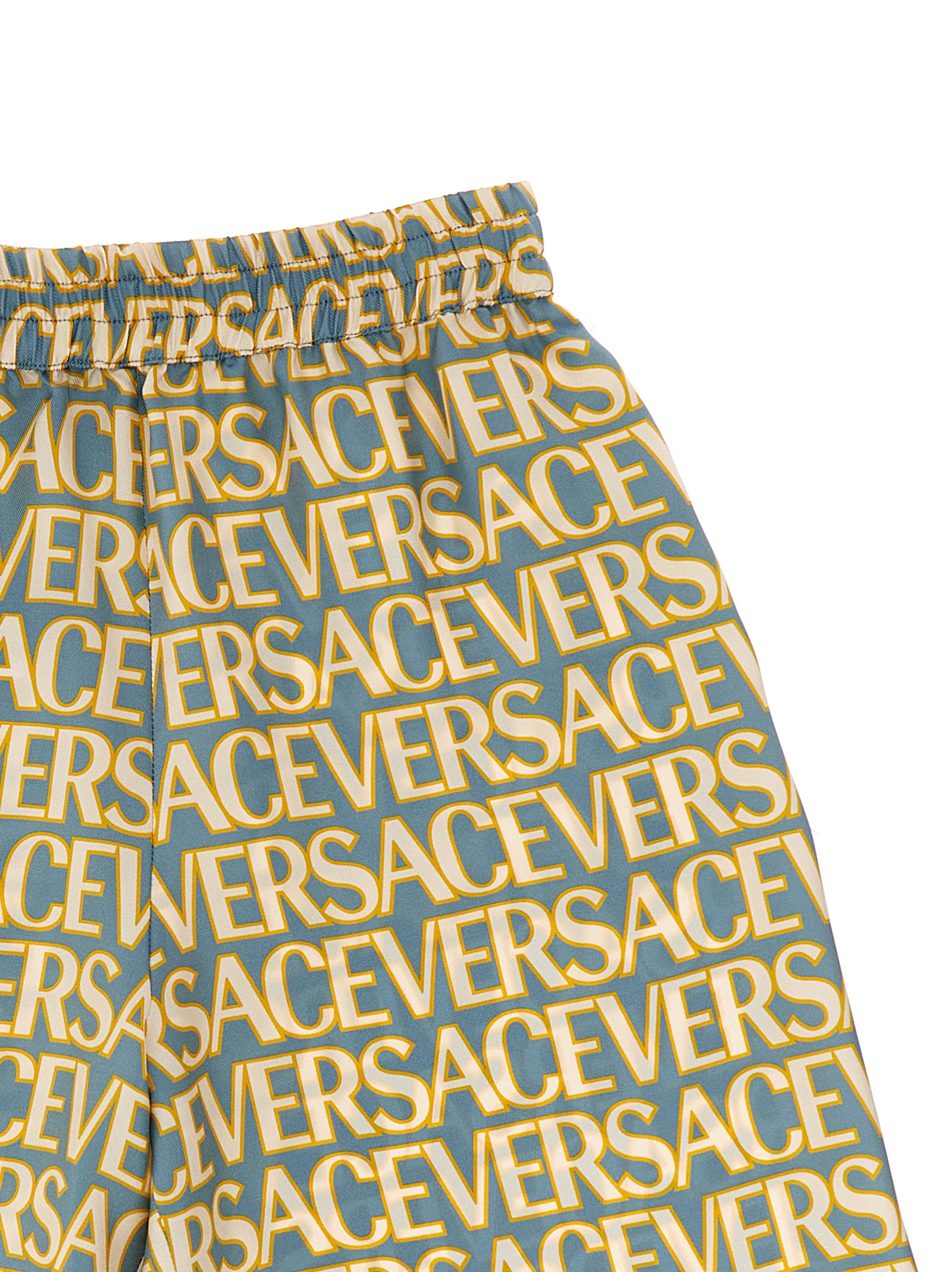 La Vacanza capsule bermuda shorts in silk twill with ‘Versace Allover’ print and elastic waistband.stband.