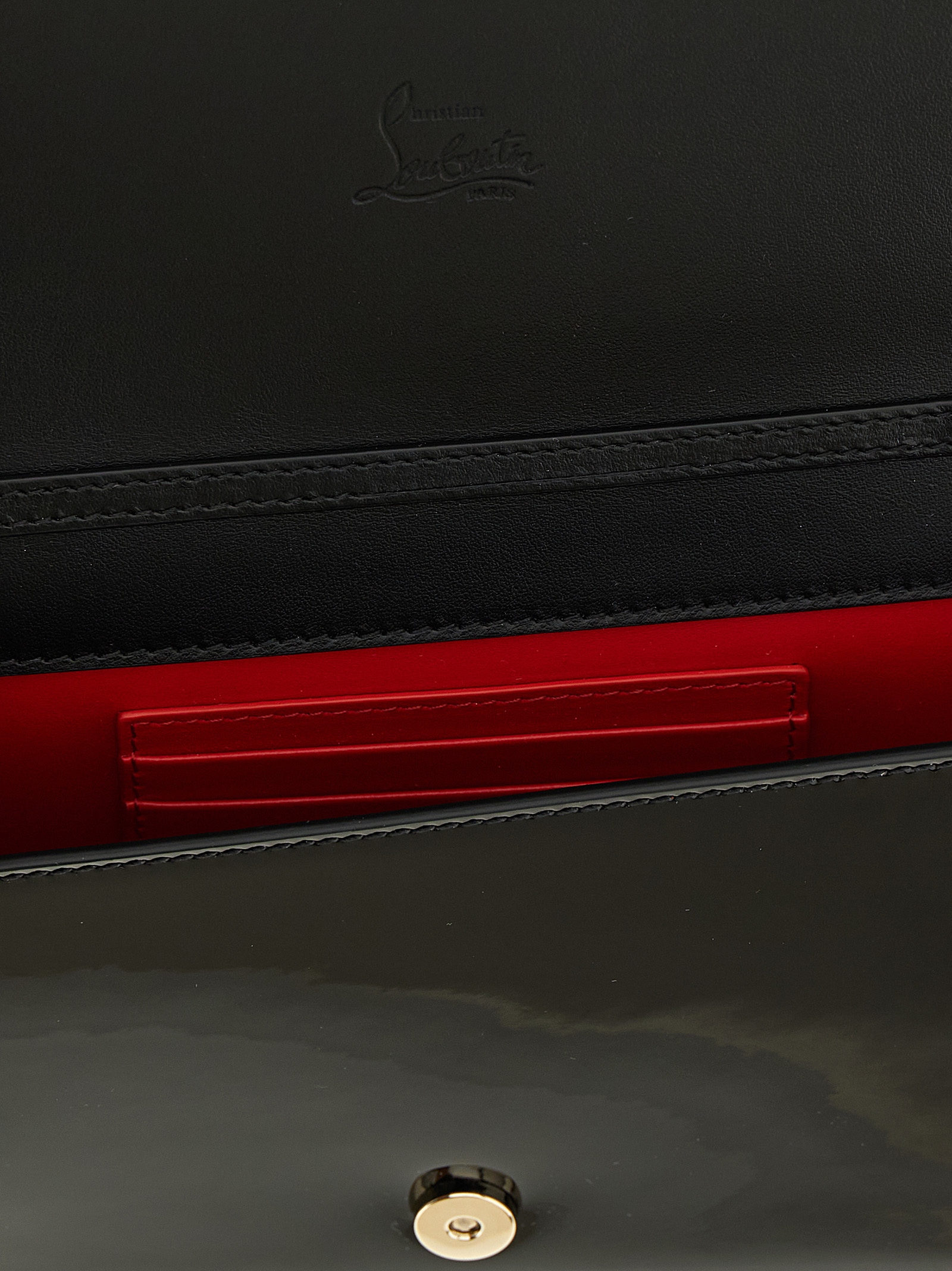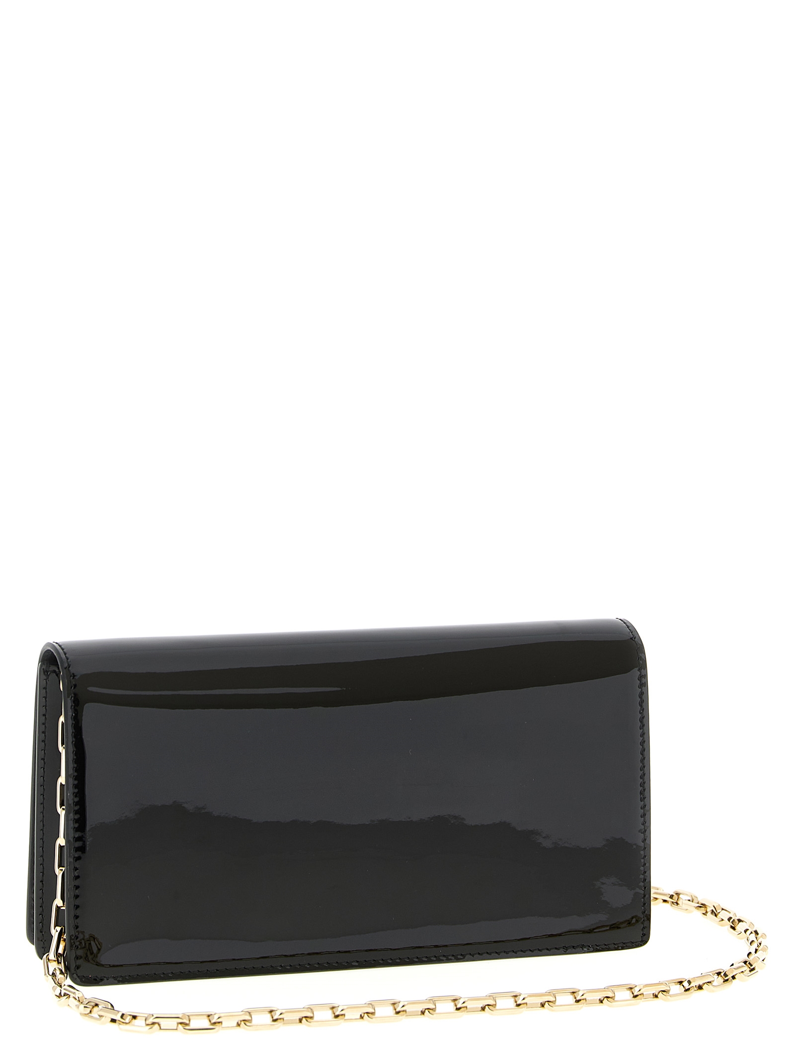 ‘Bettina’ patent calf leather clutch, magnetic flap closure with front metal detail that evokes the silhouette of the iconic sole, removable chain shoulder strap.