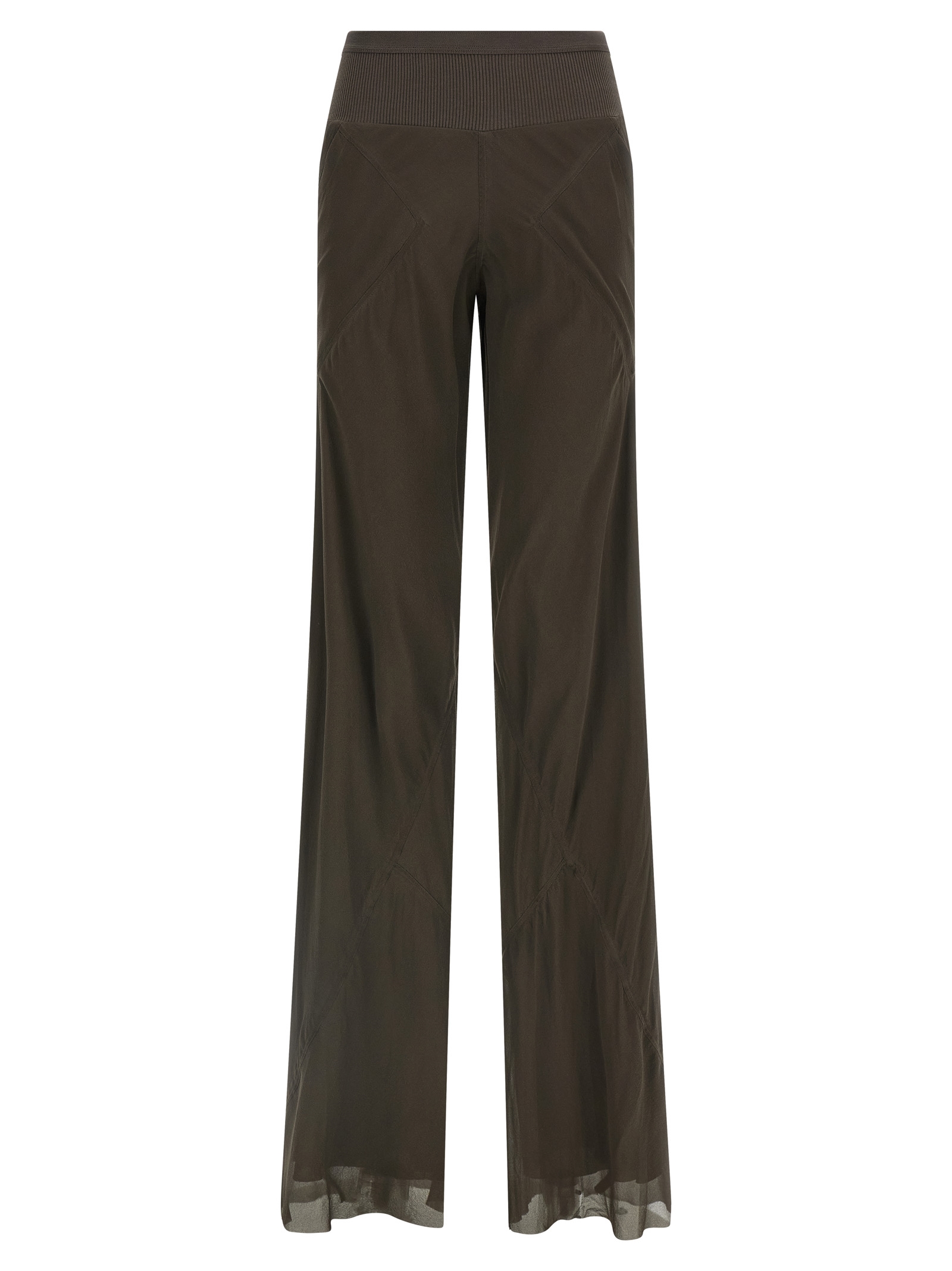 ‘Bias’ silk trousers, lining, ribbed elastic waistband, pockets, flared wide leg, raw cut hem on the leg bottom.