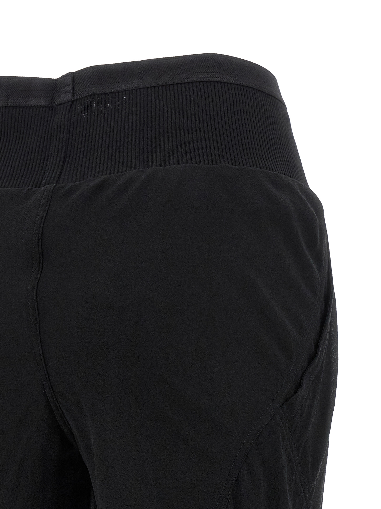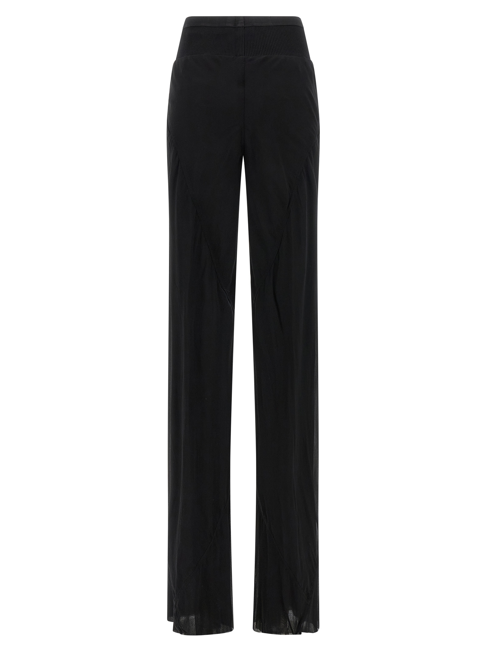 ‘Bias’ semi-transparent light silk georgette trousers with washed finish, extra long flared wide leg, diagonal stitching, ribbed elastic waistband, pockets, raw cut hem on the leg bottoms.
