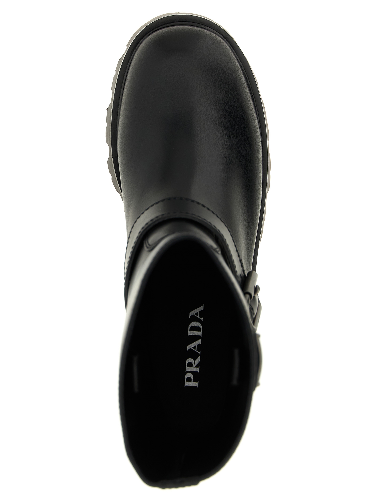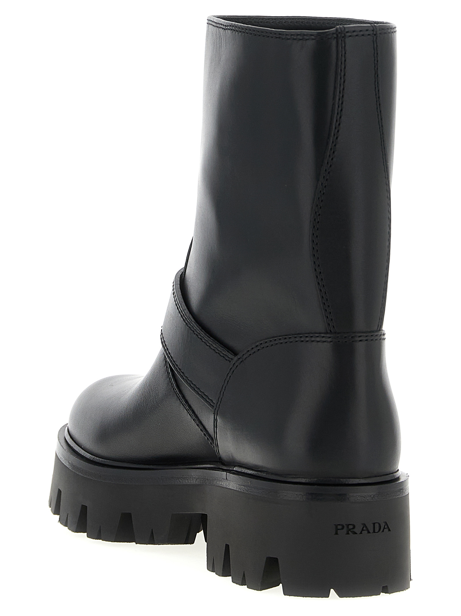 Leather ankle boots, biker model, triangle logo in enameled metal on the side, rounded toe, tubular leg, adjustable strap on the instep, oversized rubber sole with tread pattern with gussets.