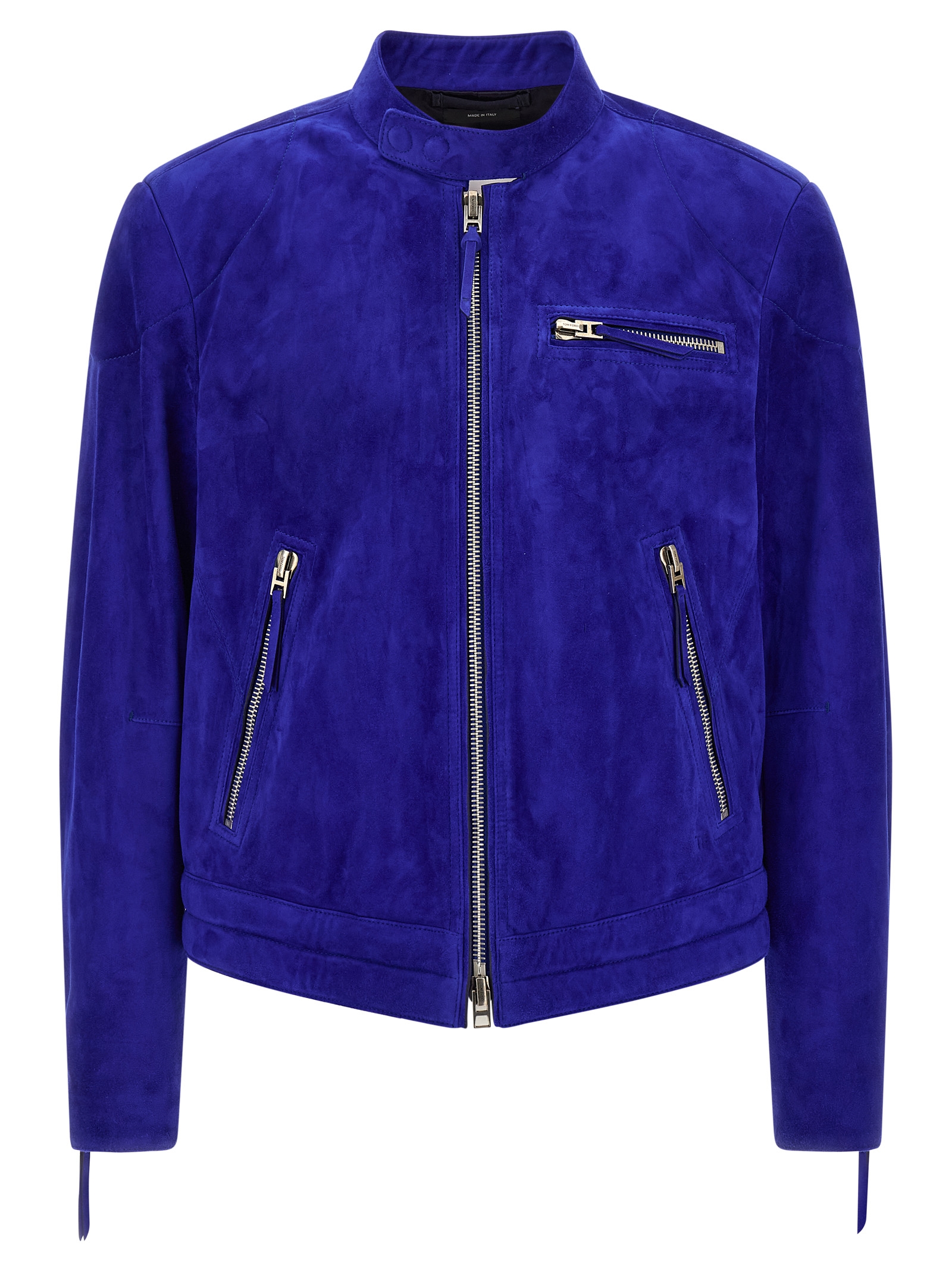 Suede cashmere jacket with slightly padded details, biker style, high neck with snap button closure, front zip closure, pockets, long sleeves with zip on the cuffs, lining.
