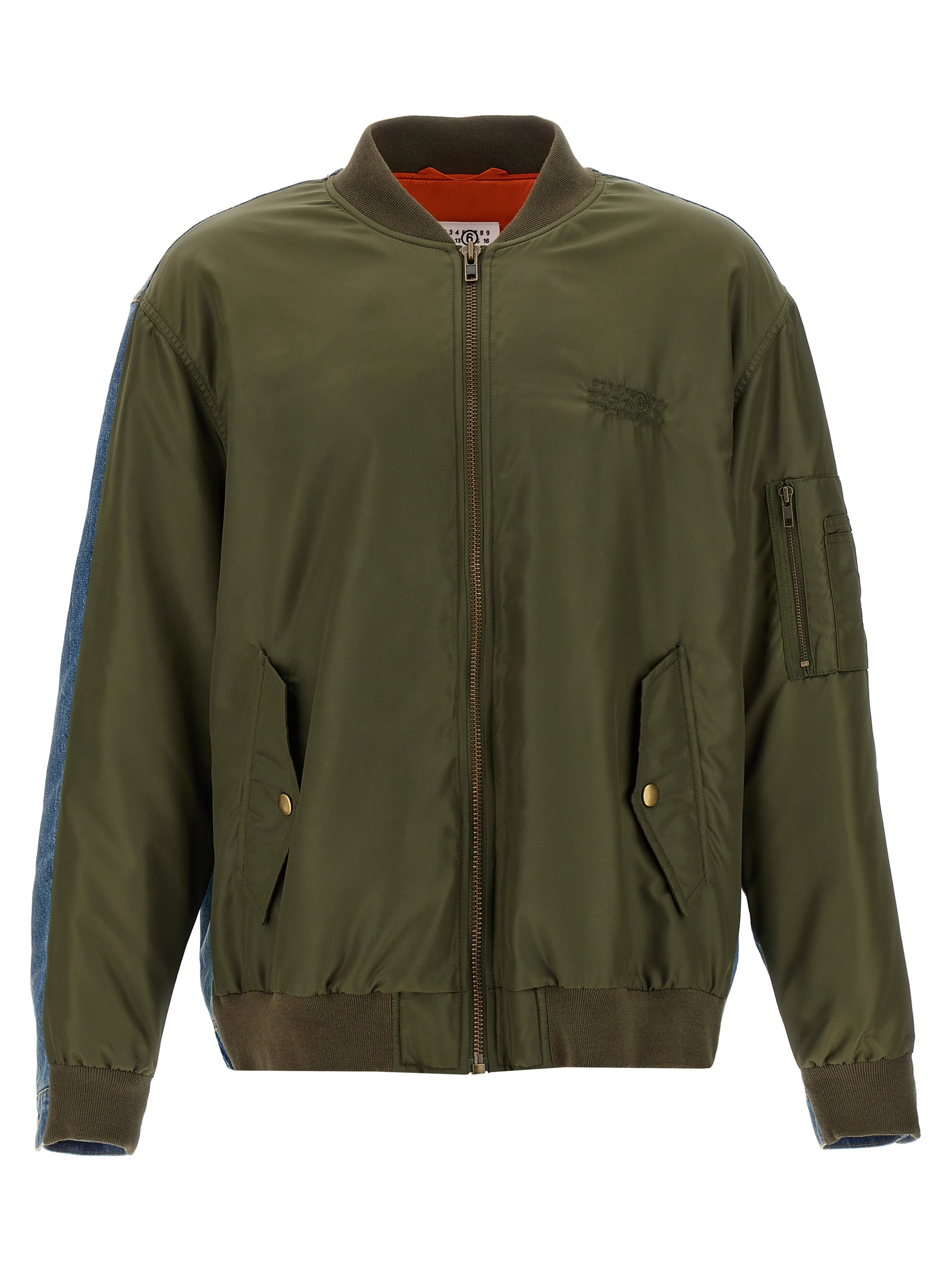 Two-material bomber jacket in nylon and used-effect cotton denim with lining, front ‘Numeric signature MM6’ embroidery, zip closure, pockets, back ‘White stitch line’, long sleeves with cuffs.