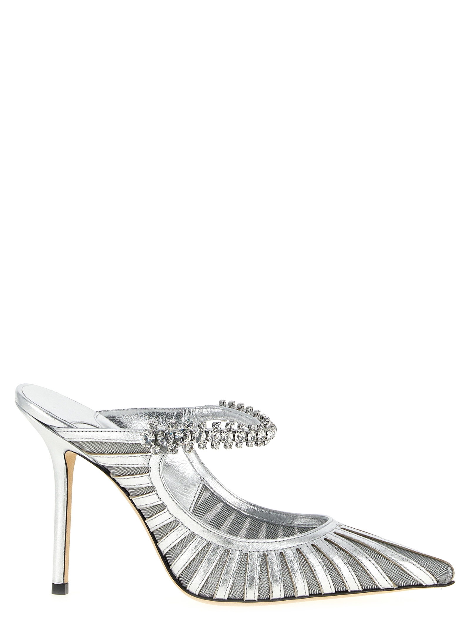 ‘Bing’ mules in laminated leather and transparent tulle, jewel strap on the instep, pointed toe, stiletto heel, leather sole.