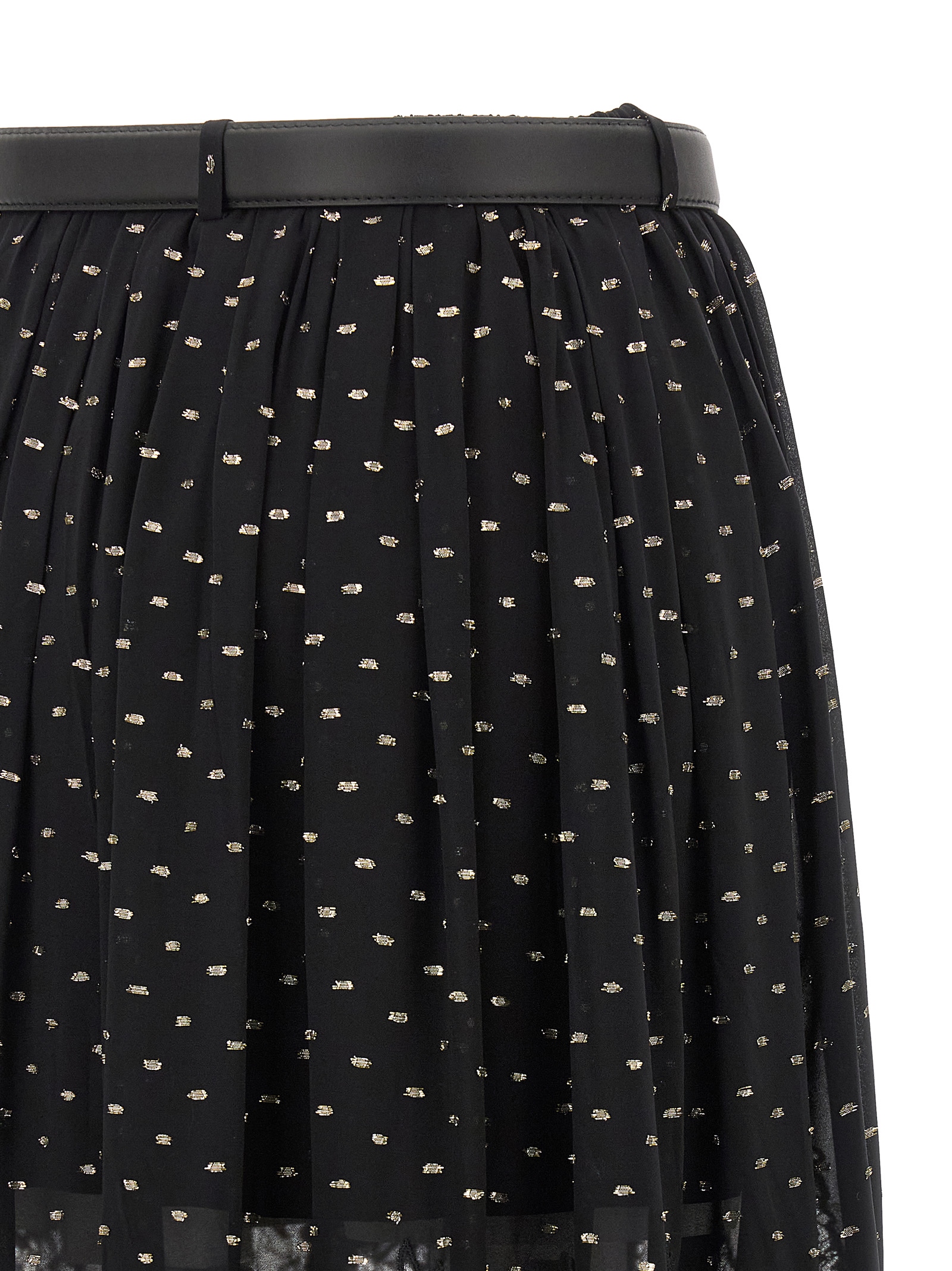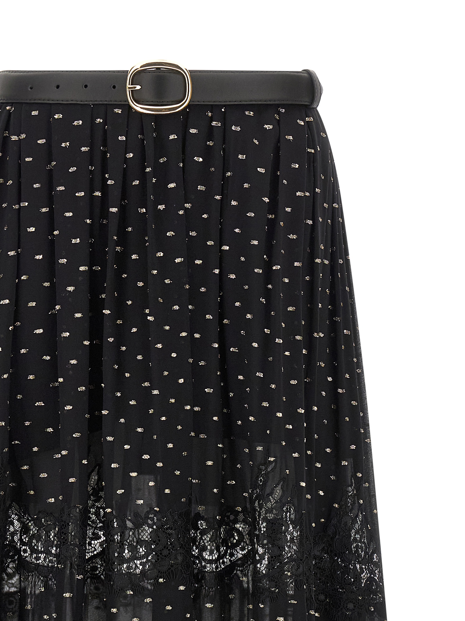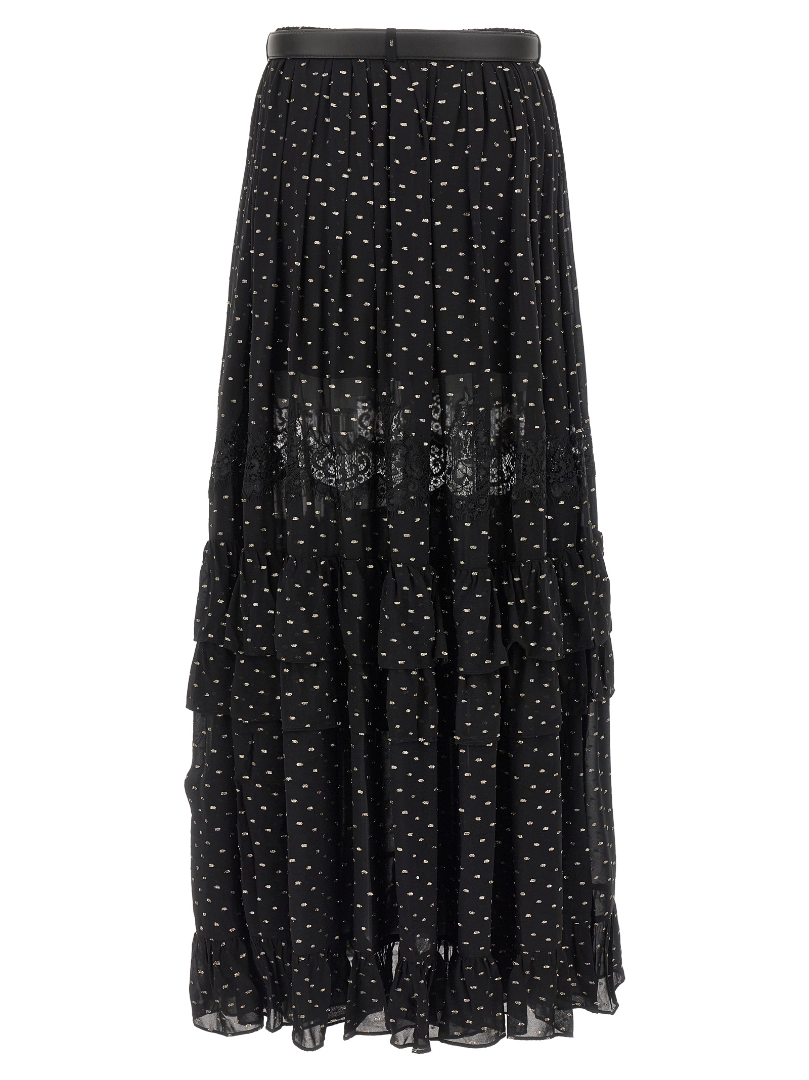 ‘Black And Gold Chiffon Lace Maxi’ metallic fil coupรฉ skirt with semi-transparent lace insert, flared flounces model, elastic waistband, partially lined, removable leather belt.