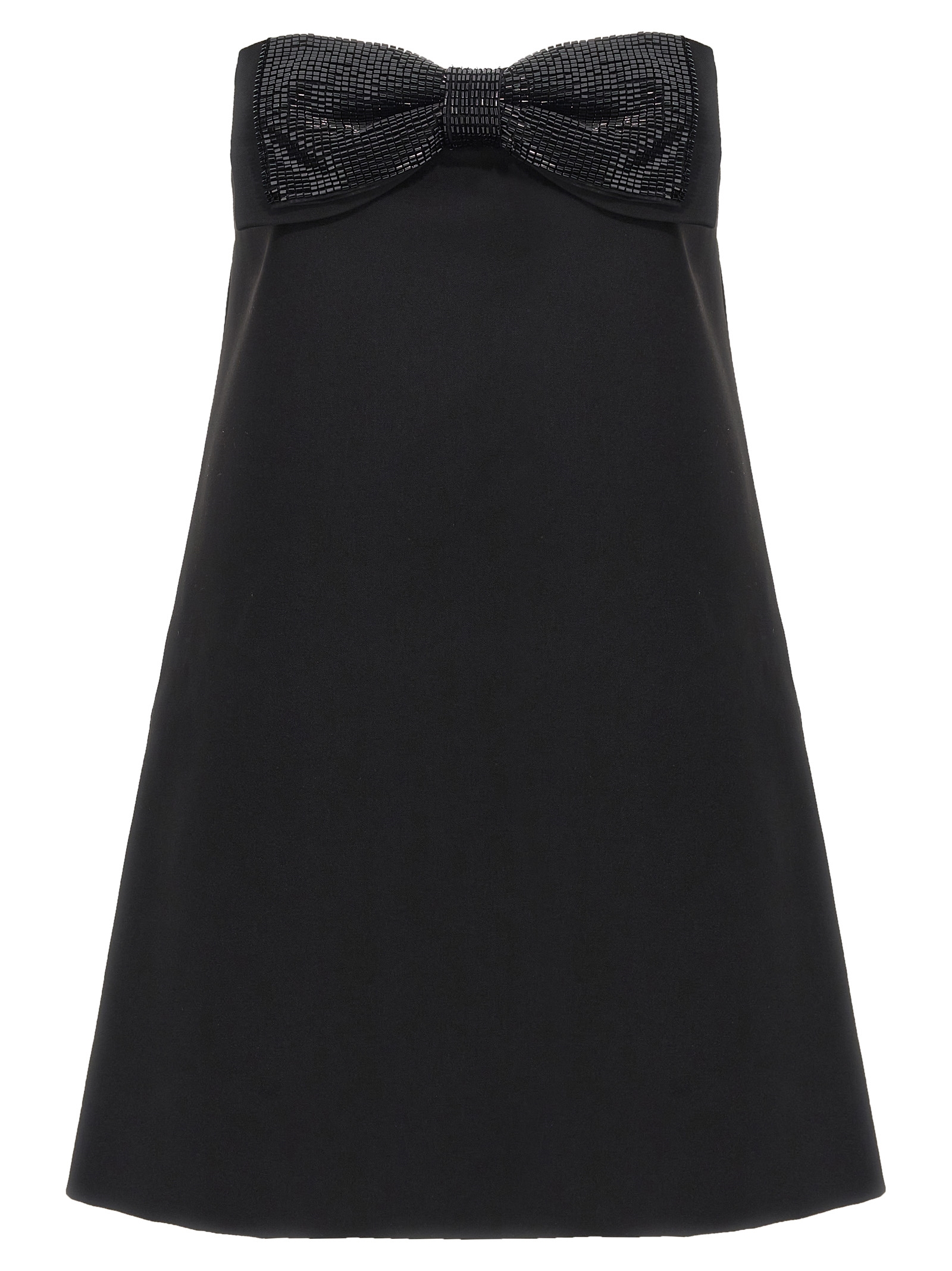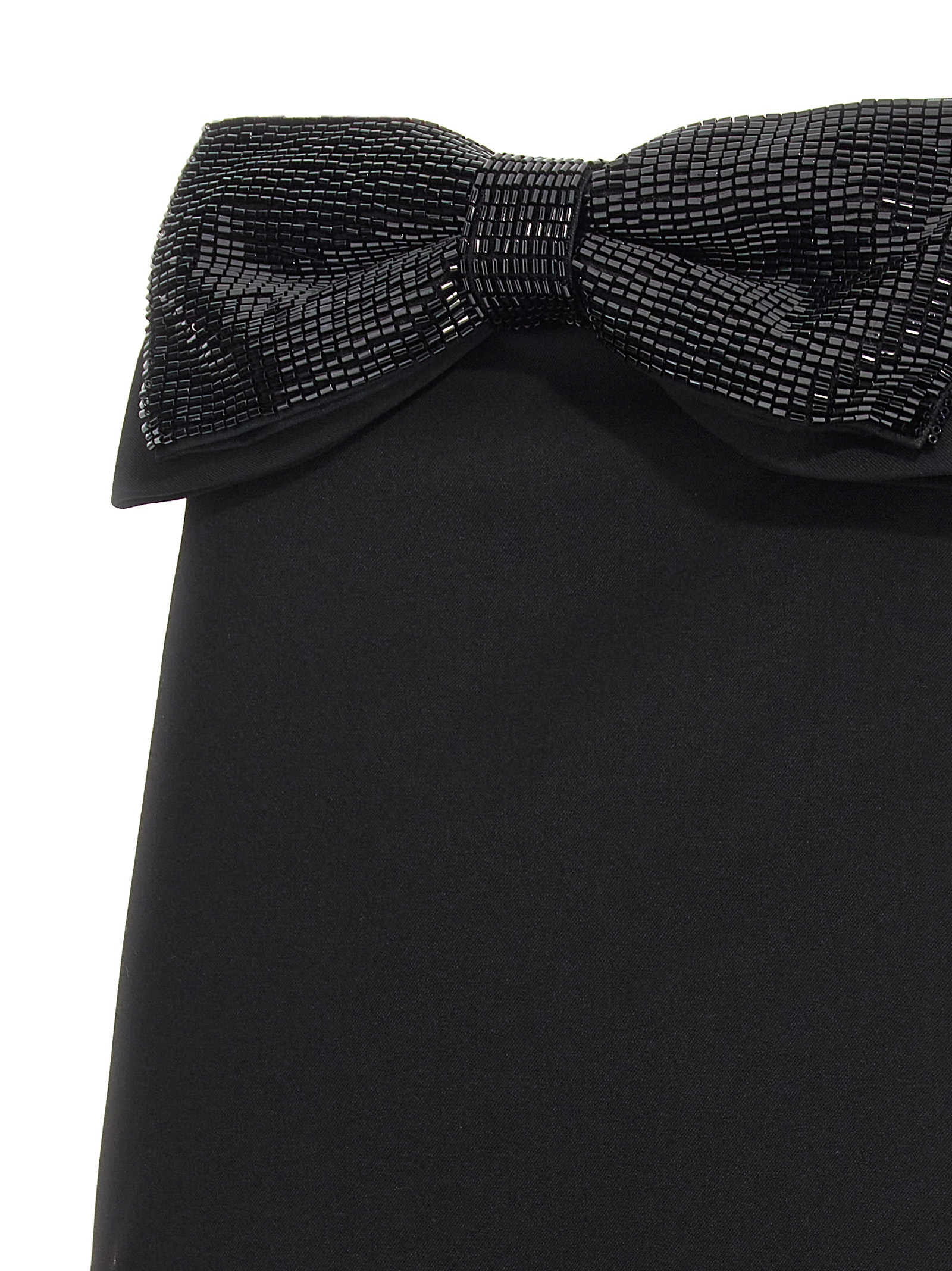 Black Crepe Bandeau Mini’ crêpe dress with bow appliqué with front beads, off-the-shoulder style with corset, and back zip closure.