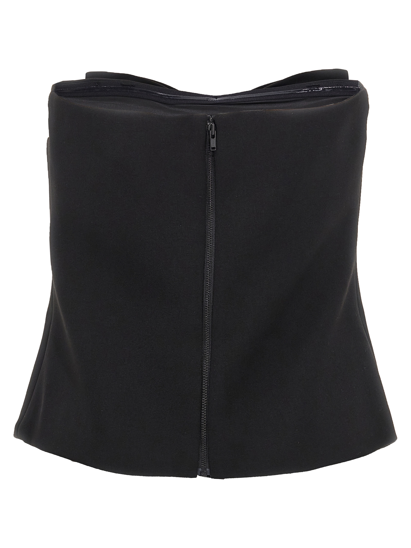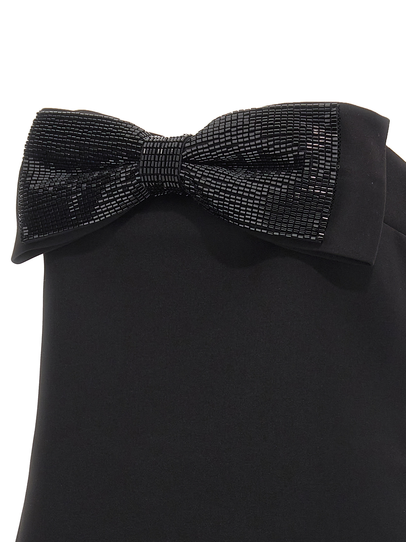 ‘Black Crepe Bandeau’ crêpe top with bow application with front beads, off-the-shoulder model, back zip closure.