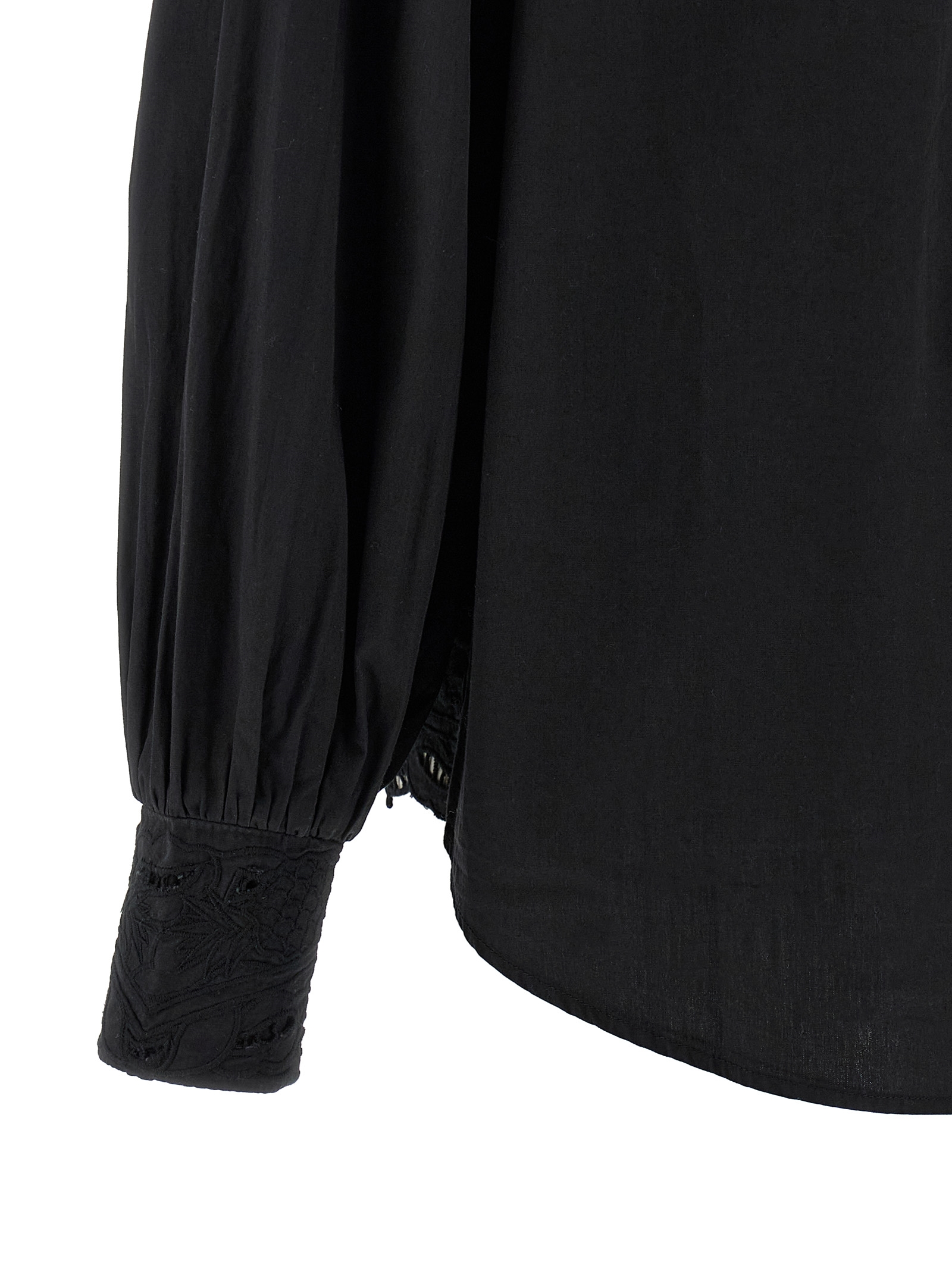 ‘Black embroidered’ cotton shirt with front perforated floral embroidery, front button closure, double wide collar with embroidery inserts on the edges, wide sleeves with curls, embroidered cuffs and an inner smock stitch insert.