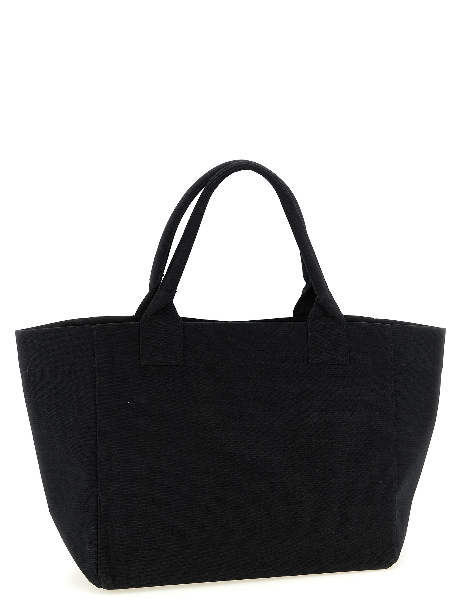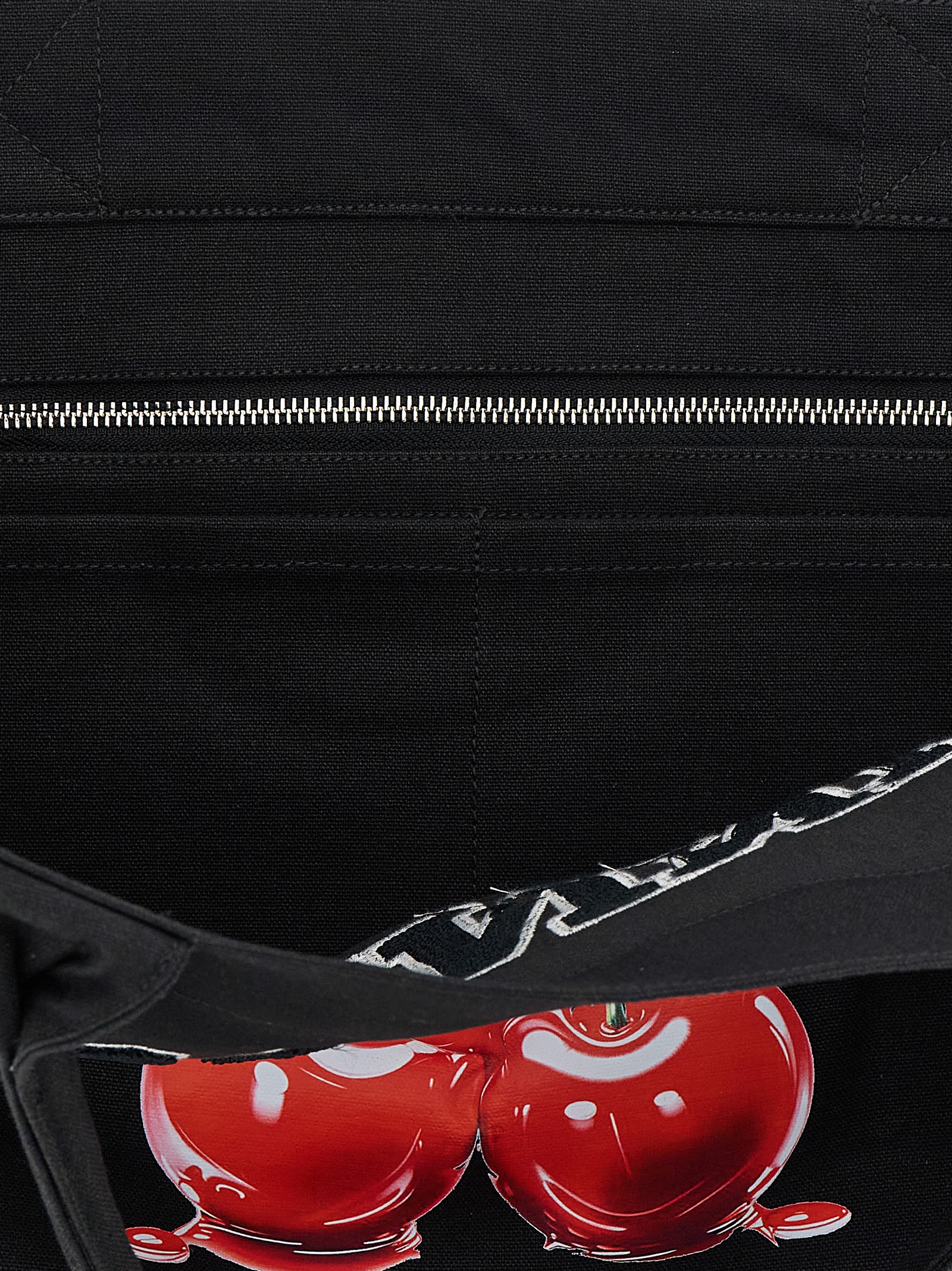 ‘Black Medium Cherry Tote’ canvas shopping bag with front graphic print, double fixed handle.