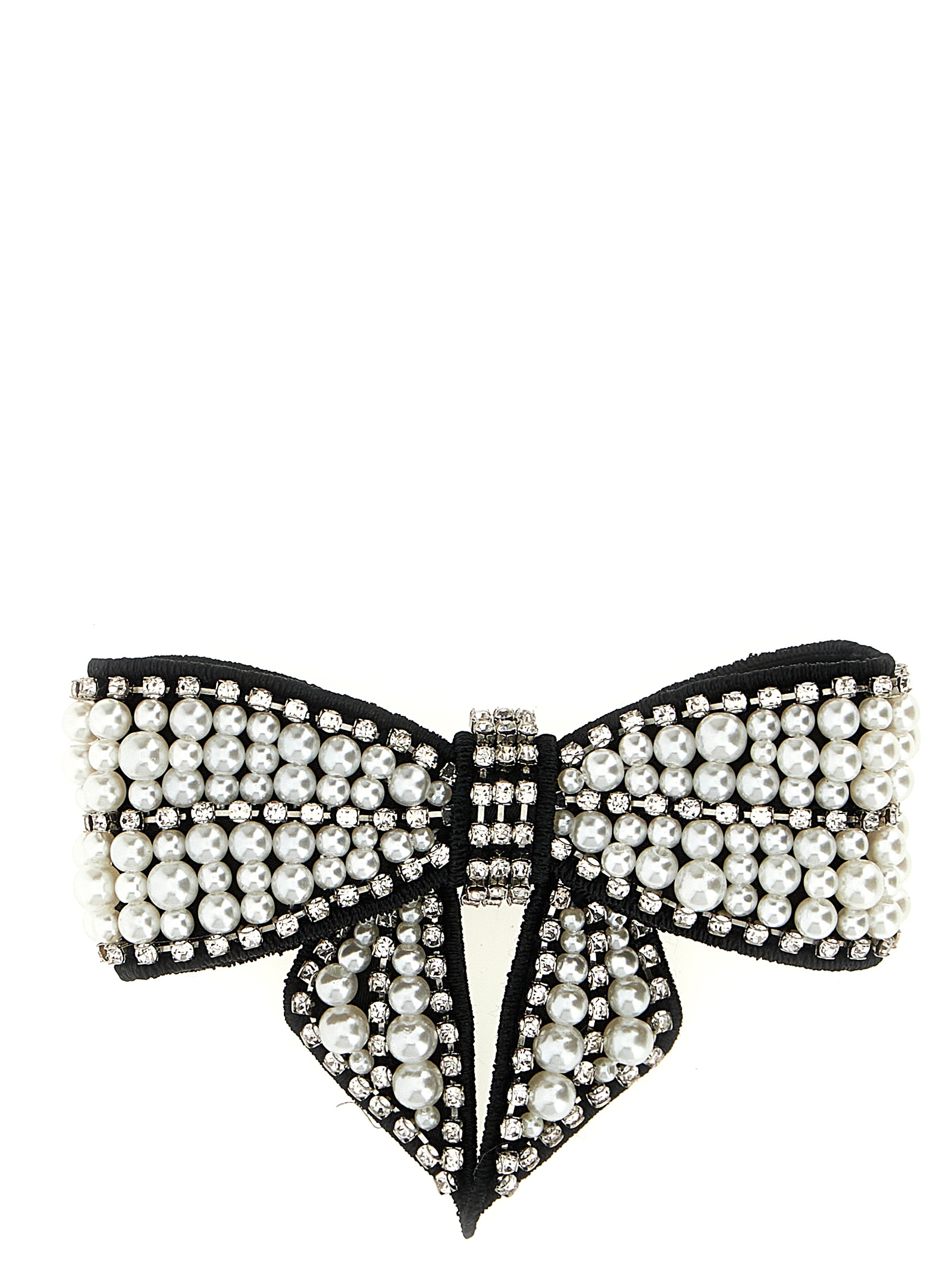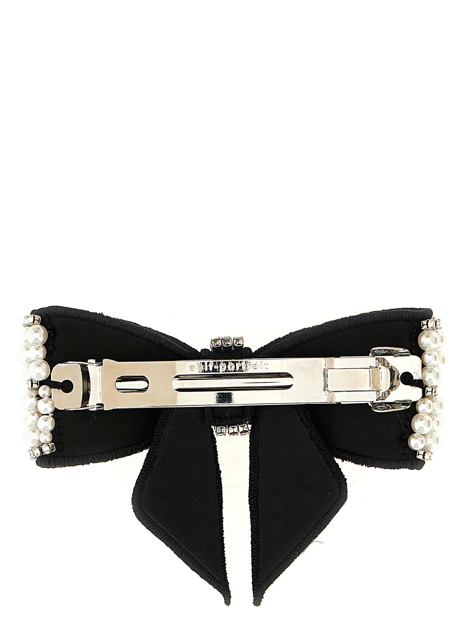 ‘Black Pearl Satin Bow’ black satin hair clip coupled with all-over crystal and pearl application, bow shape, back clip closure.