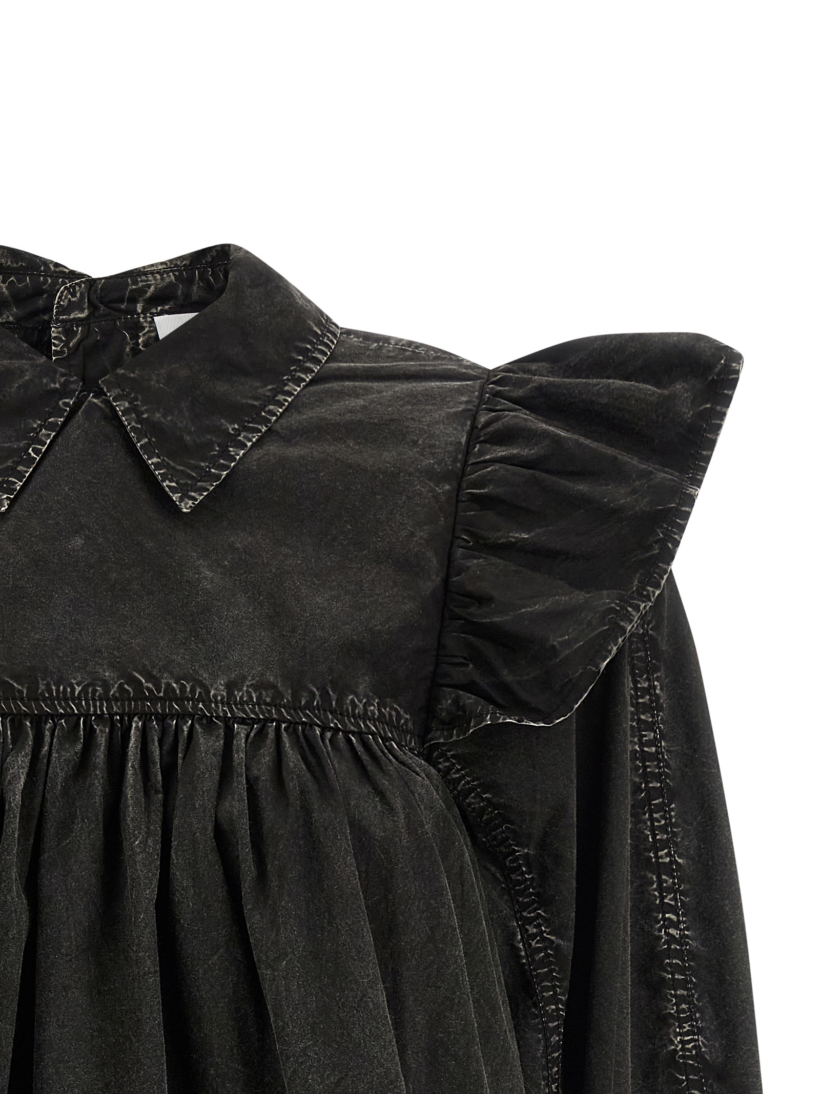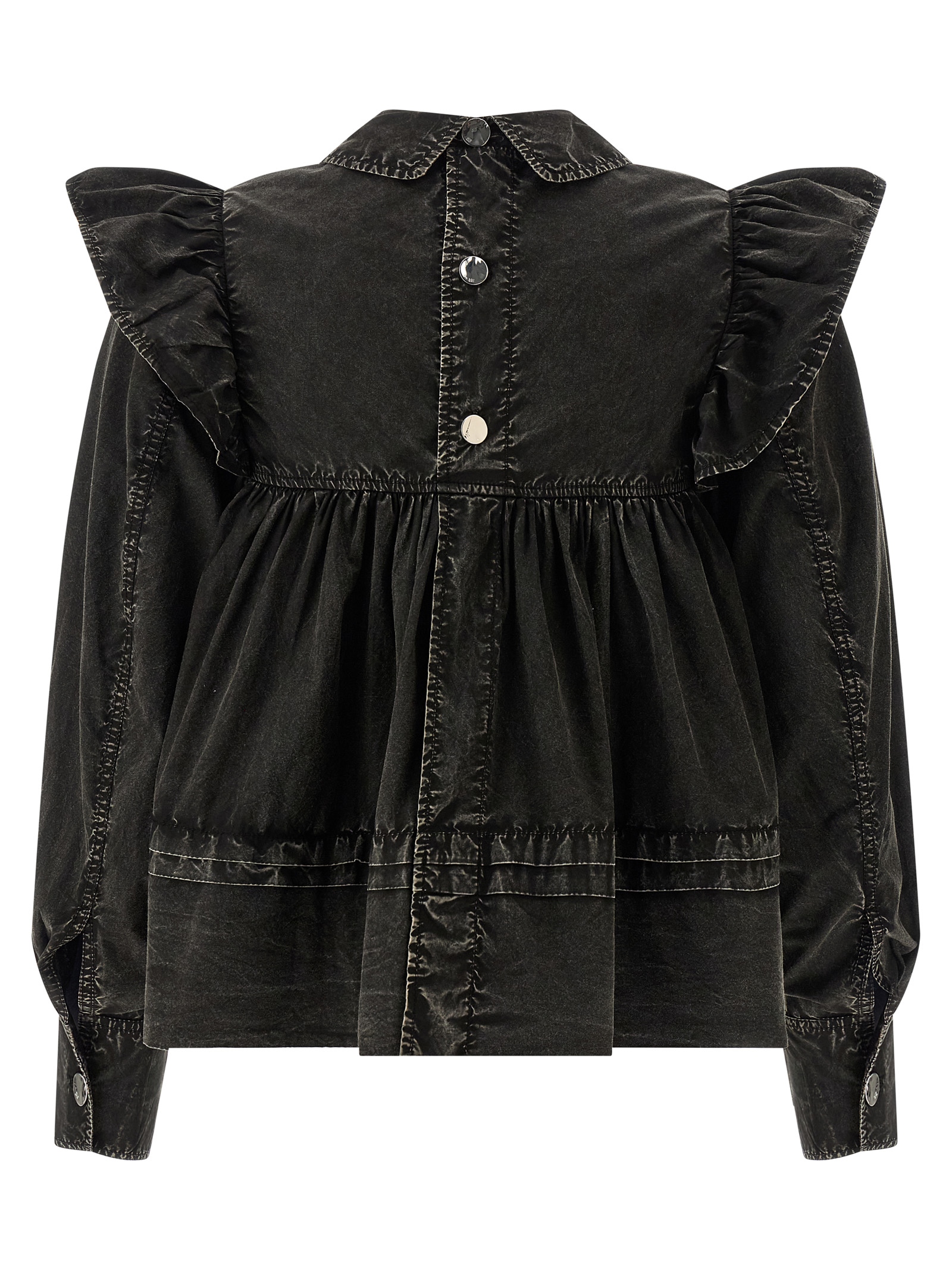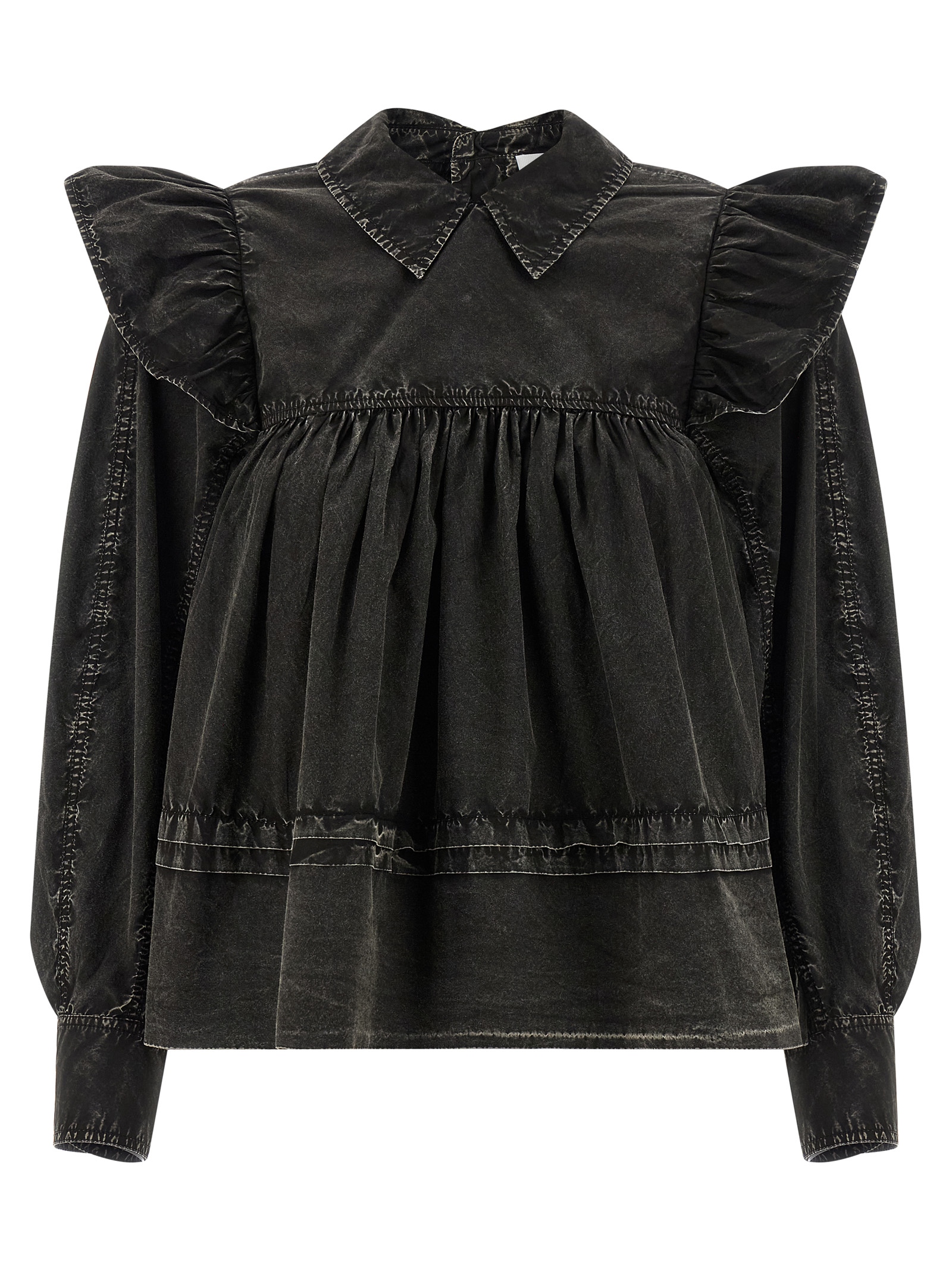 ‘Black Washed Frill’ cotton blouse dyed in a délavé effect garment, model with curls and mini flounces on the front and back, long wide sleeves with cuffs and maxi ruffles on the shoulder, back button closure.