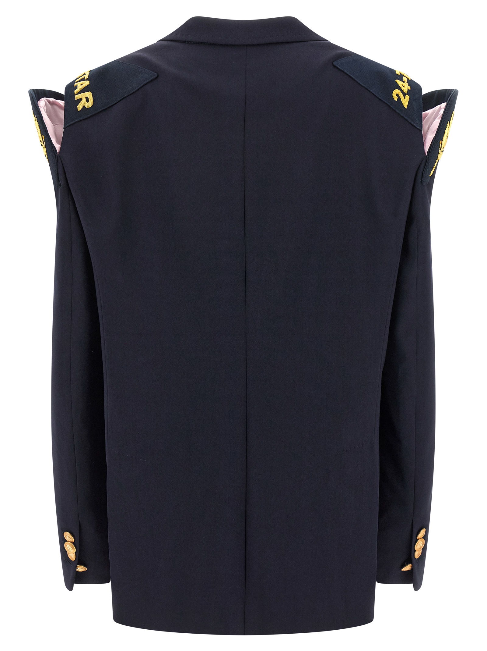 Bettter x Dsquared2 double-breasted wool blazer with front metal button closure, peak lapels, pocket, flap pockets, hard shoulder strap with embroidery and cut-out, long sleeves, back slits, monogram canvas lining.