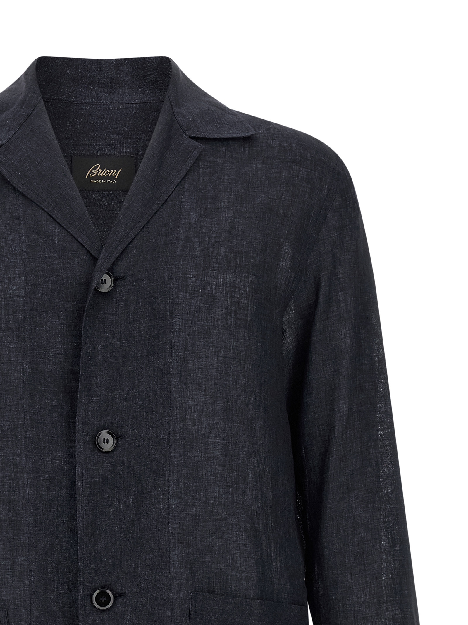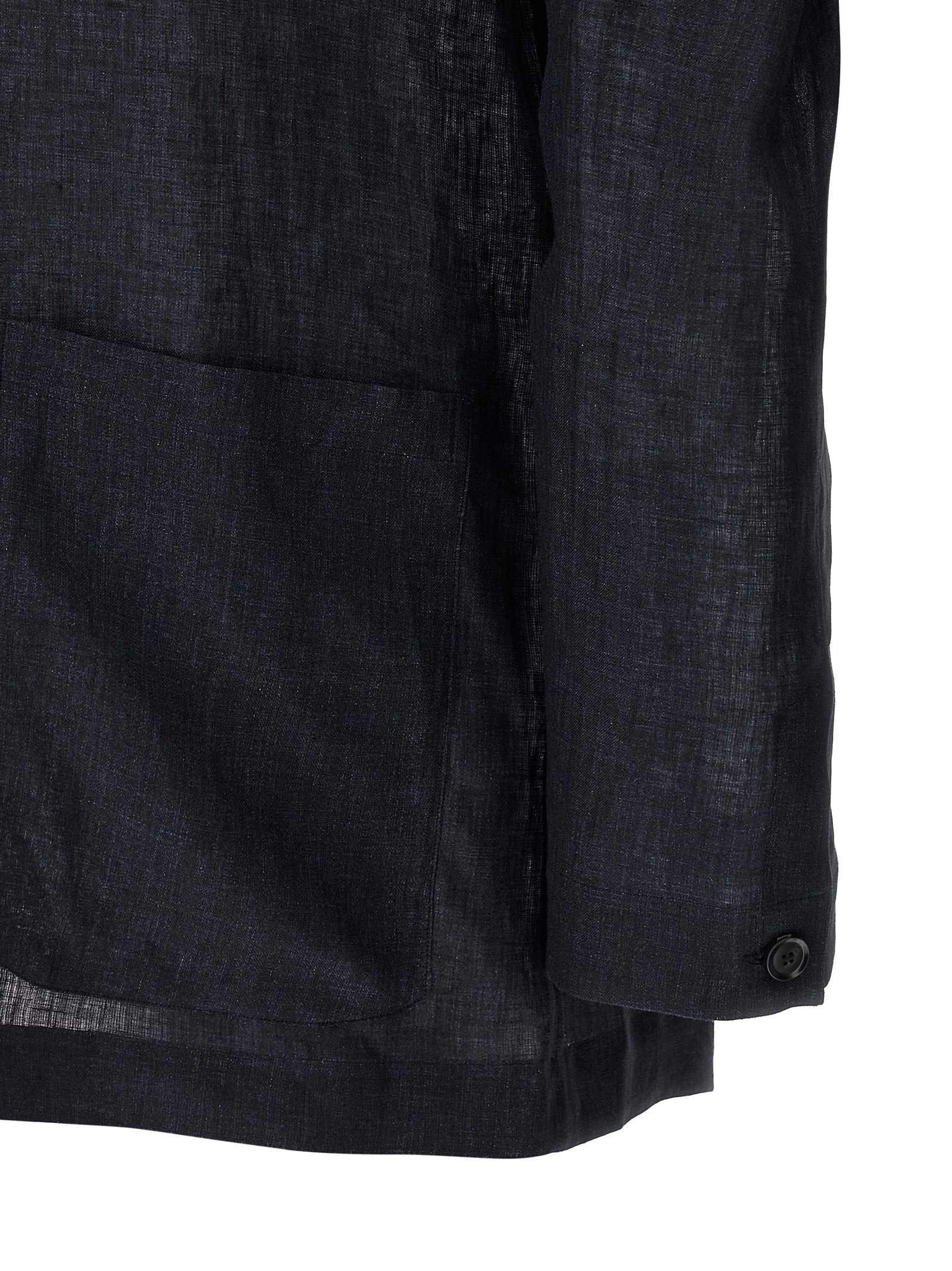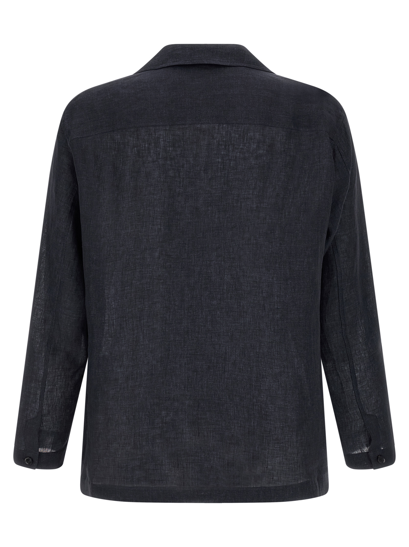 Blazer-inspired linen shirt, front button closure, patch pockets, long cuffed sleeves.