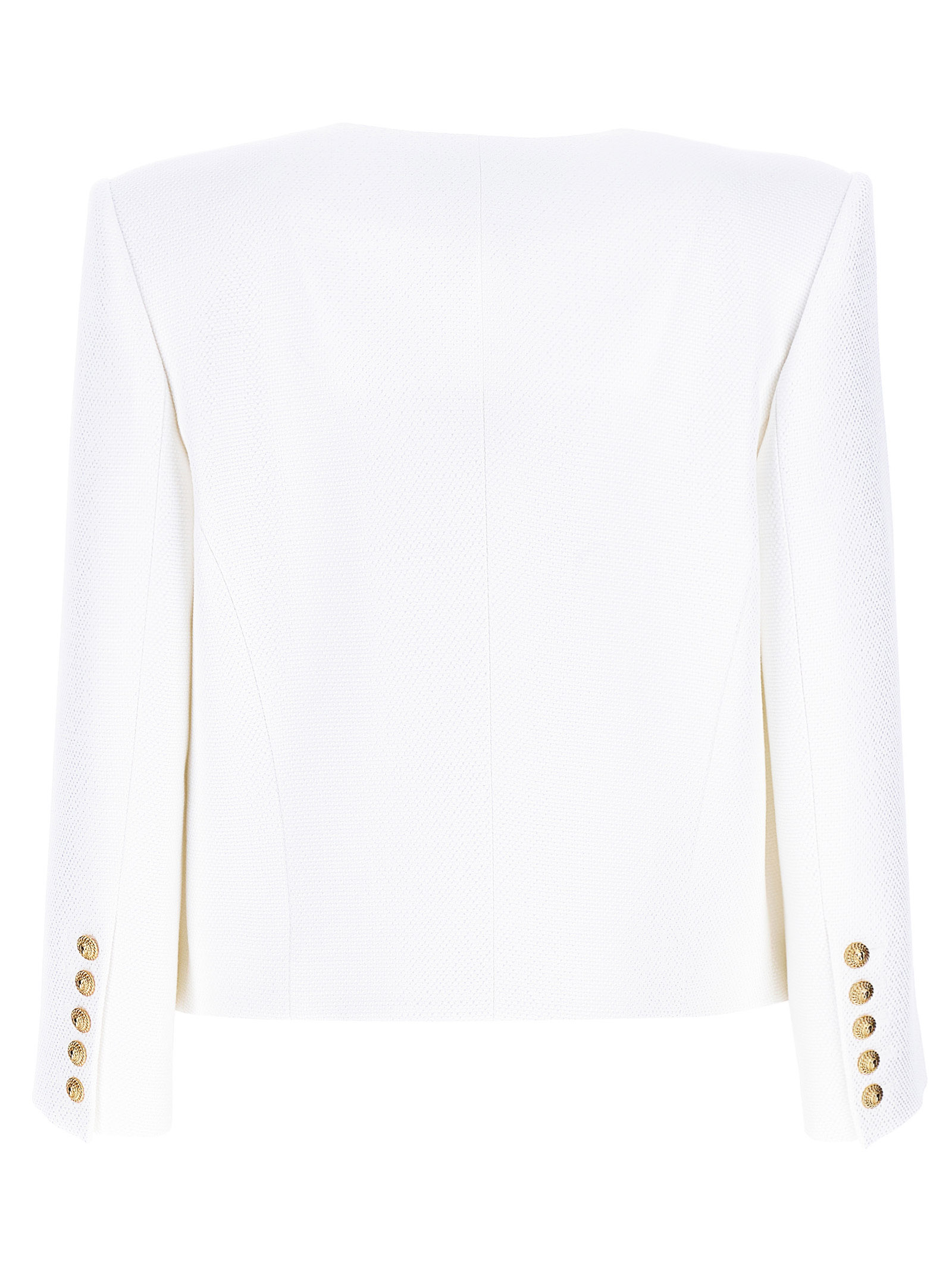 Viscose blazer with ‘Leone doppia catena’ logo buttons, round neckline with cut-out Italian tailored collar, Spencer style peak lapels, padded structured shoulders, 3/4 sleeves.