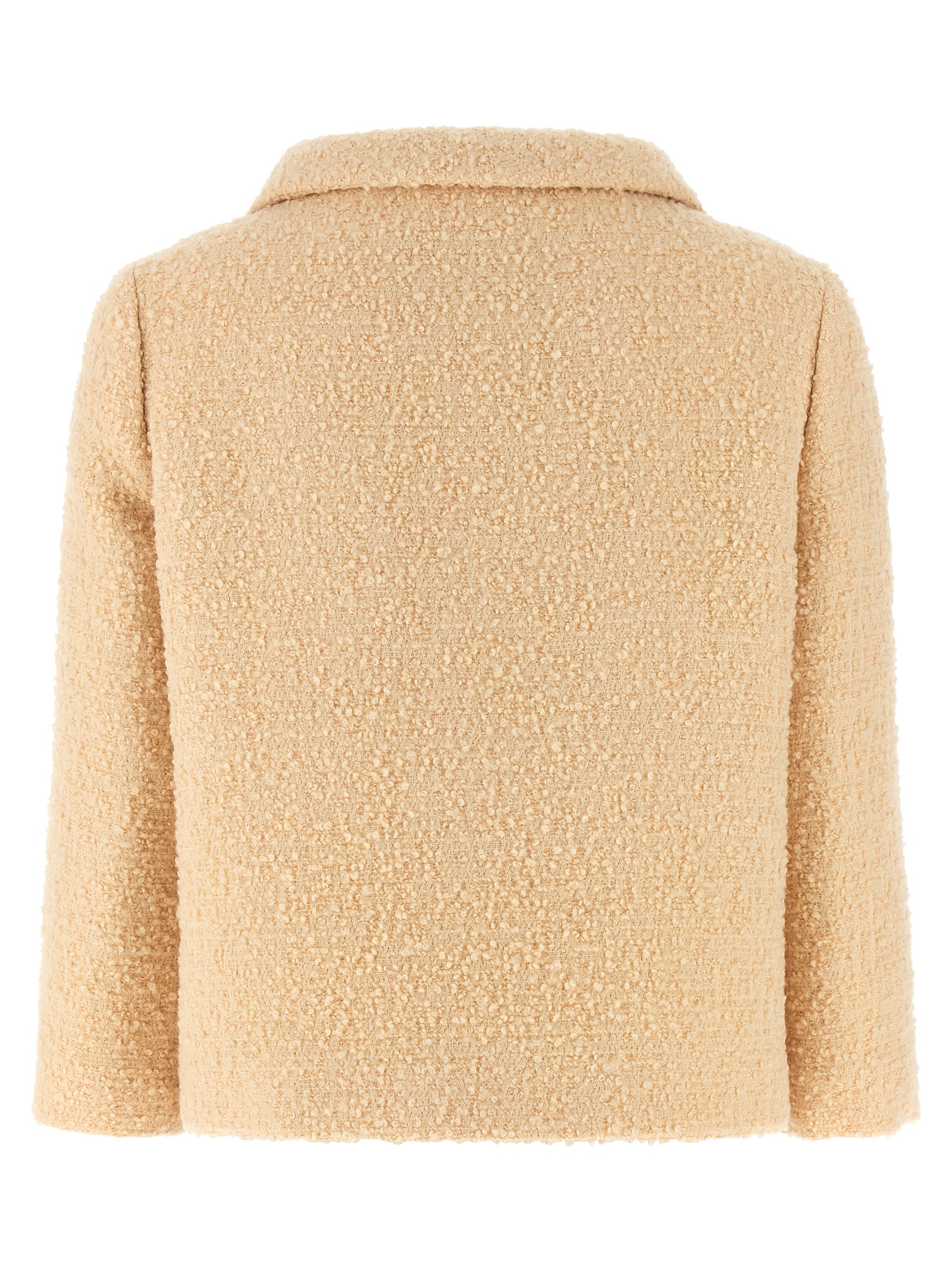 Wool Tweed blazer with round neckline with collar, central jewel button detail with beads appliqué, front button closure, pockets with antique brass ‘VLogo Signature’ metal application, 3/4 sleeves.