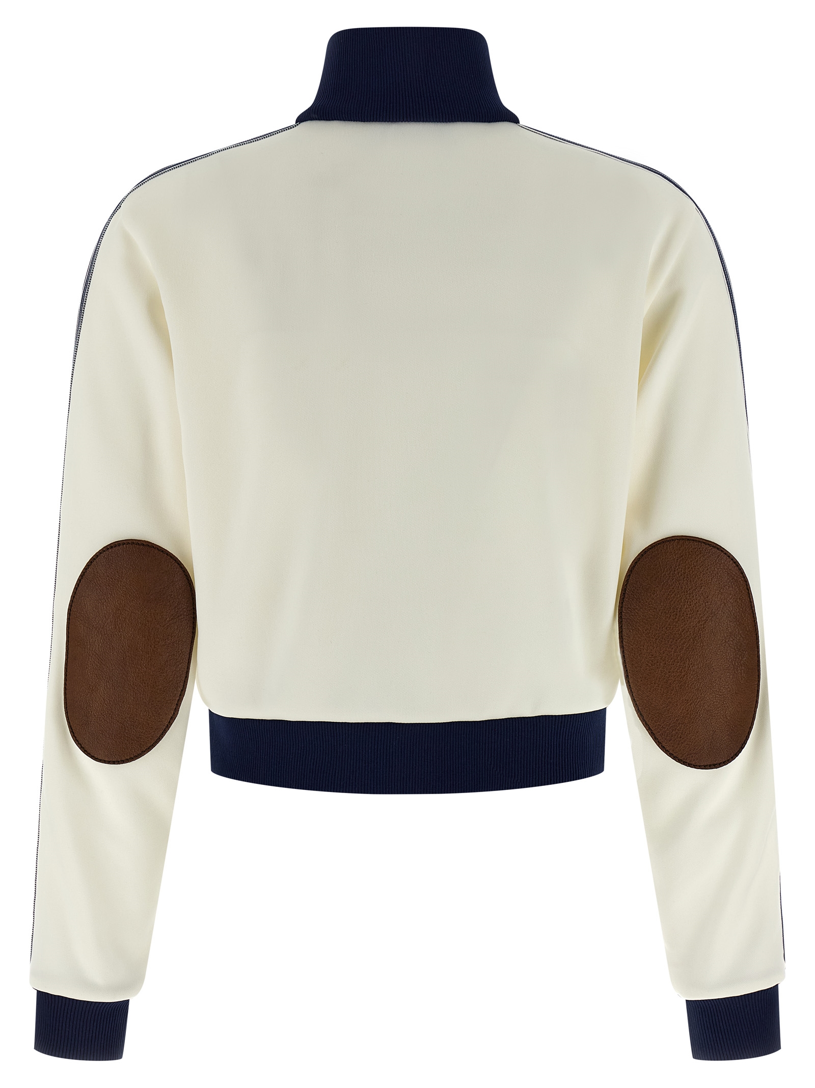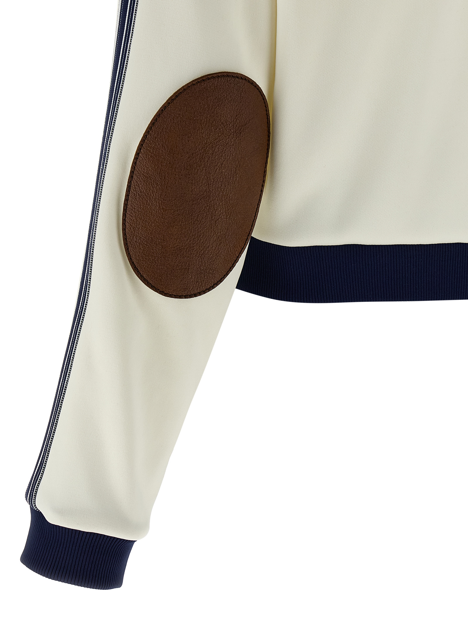 Tech fabric fleece blouson with contrast ribbed stretch knit details, crop style, logo patch and front zip closure, high neck, pockets, long cuffed sleeves, striped ribbon band and leather elbow patch.