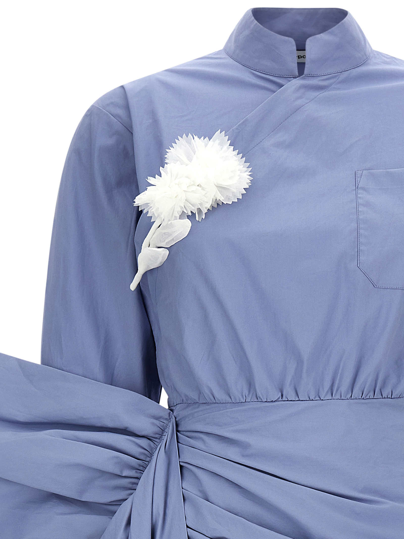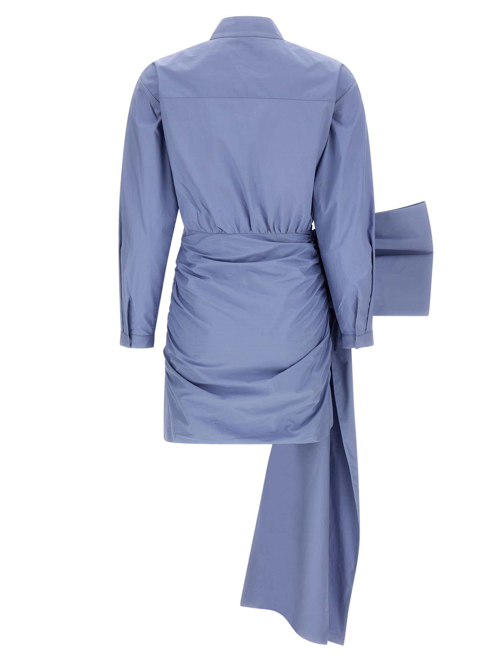 ‘Blue Cotton Tie Side Mini’ cotton dress with front asymmetrical snap button closure, high neck, breast pocket, removable corsage brooch, long cuffed sleeves, side zip closure, front and back ruffled skirt, maxi bow detail, asymmetrical hem.