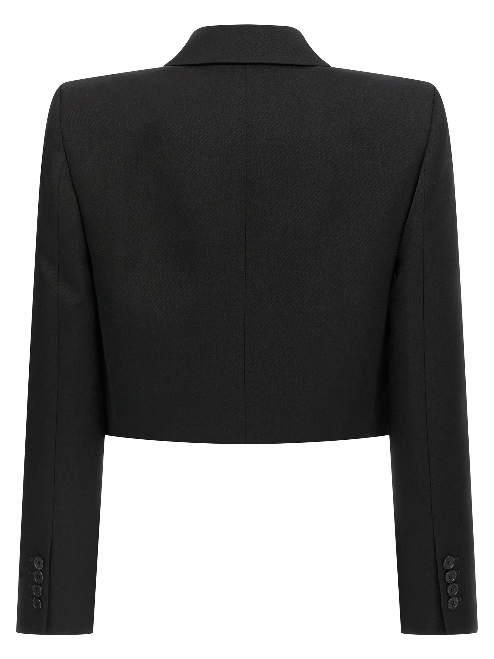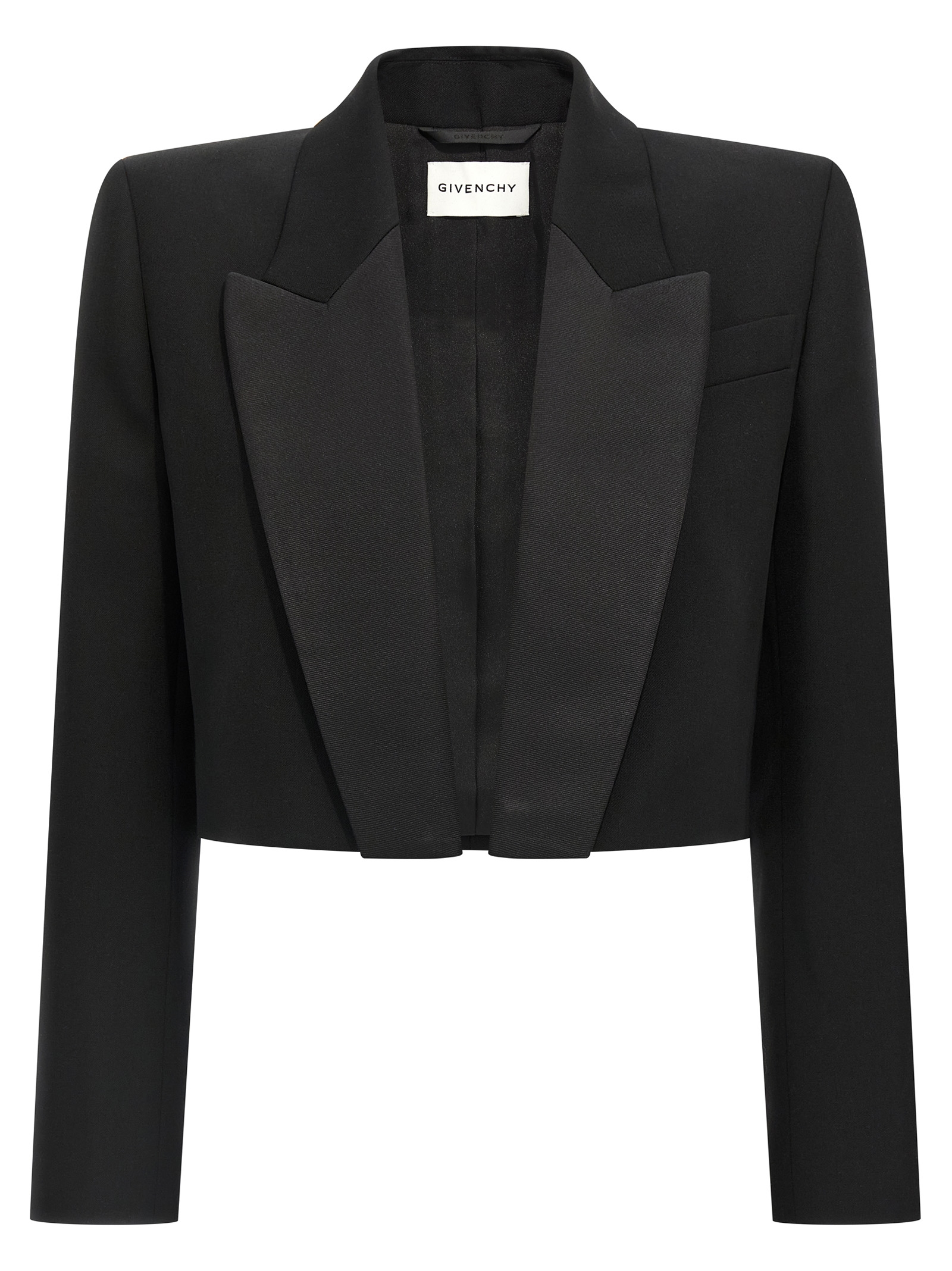 Blazer in wool grain de poudre, bolero model, peak lapels, maxi padded shoulder, long sleeves, chest pocket, satin lining.