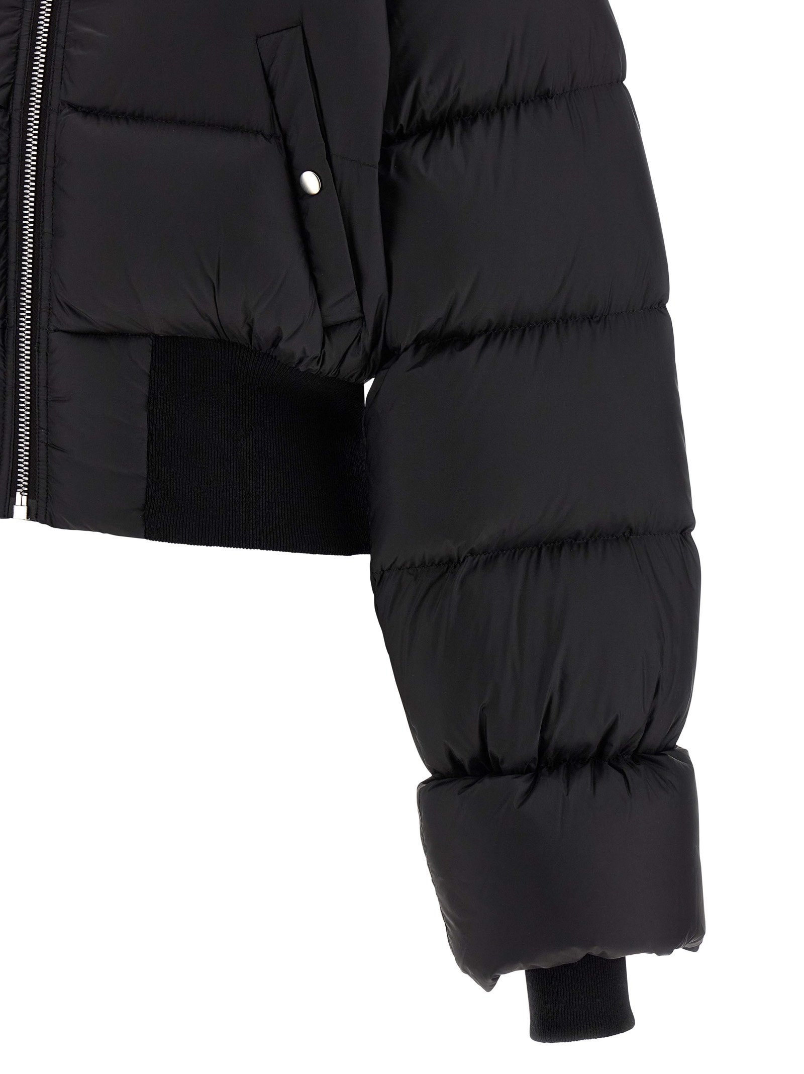 Quilted nylon down jacket with goose feather padding, bomber jacket, hood, front zip closure, pockets, long cuffed sleeves, stretch ribbed knit hem, cotton strap with rivets on the back rack.