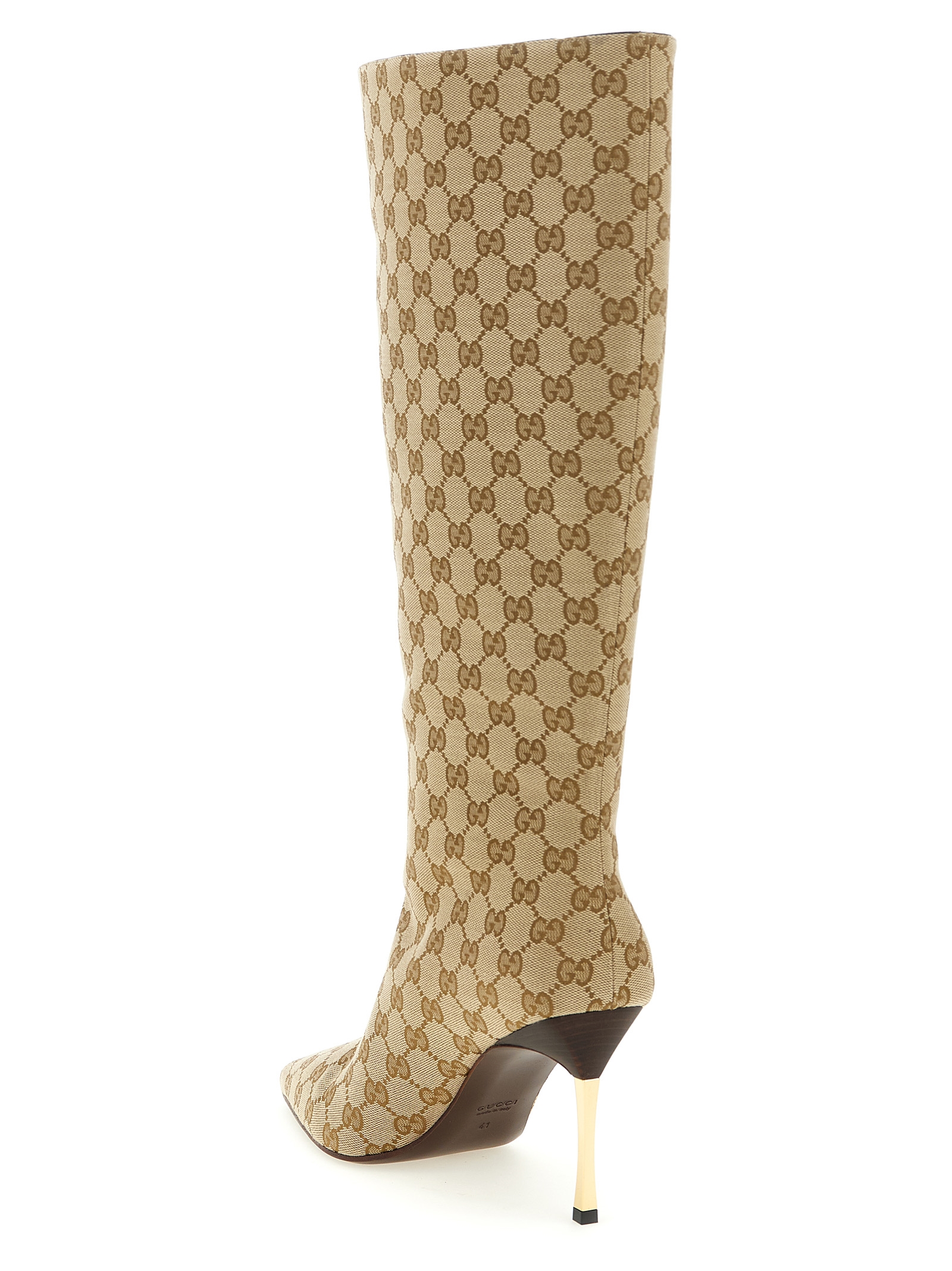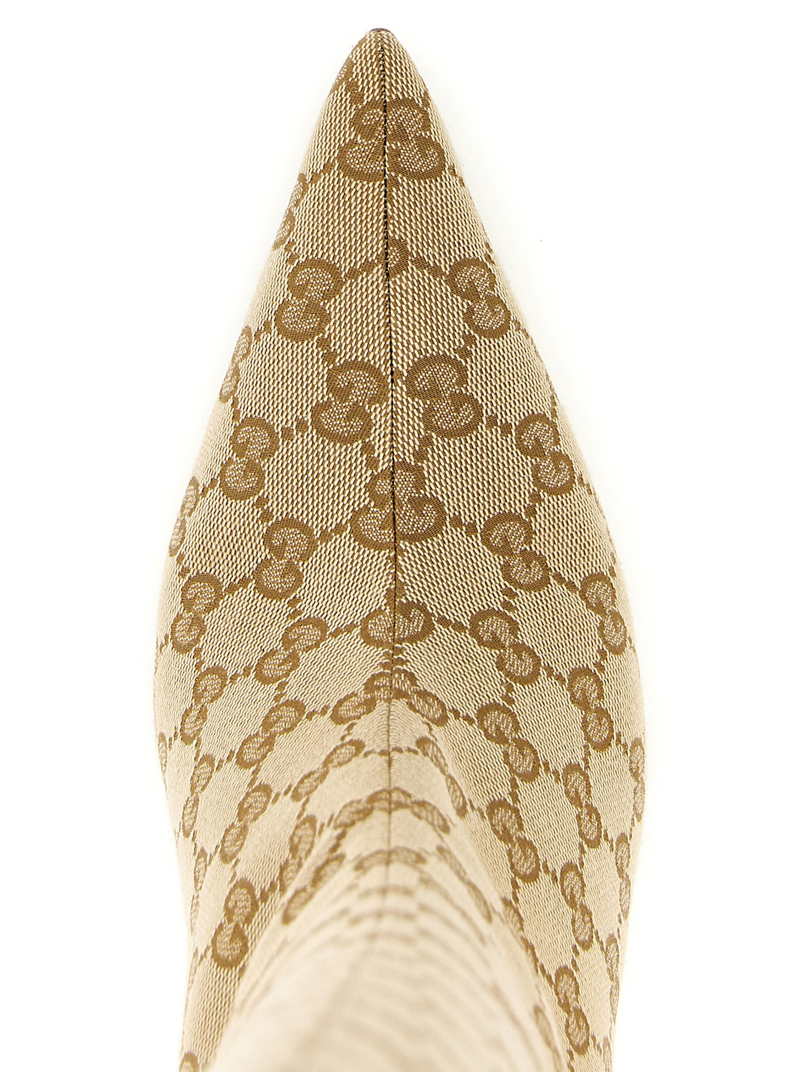 ‘Bombshell’ boots in light and structured GG fabric, leather lining, pointed toe, tubular leg, sculptural steel stiletto heel, leather sole.