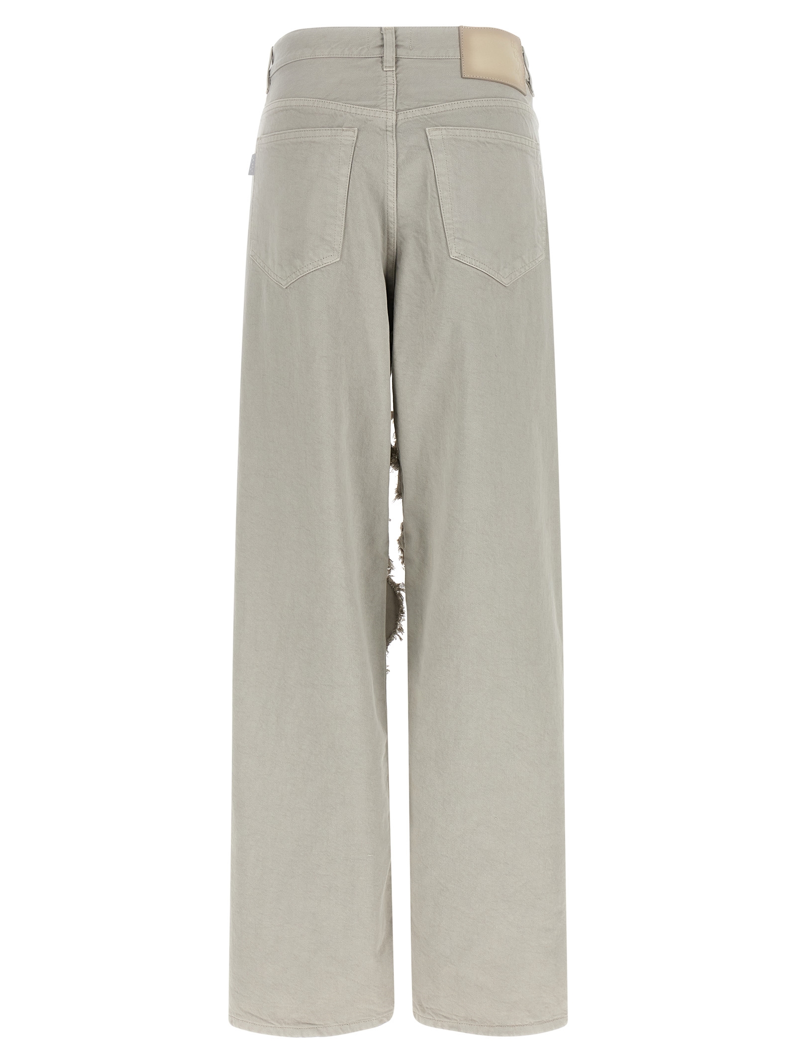 Bull ‘Bonnie’ cotton denim jeans, front breaks and rips with tonal satin insert, wide flared leg, front zip and button closure, five pockets, back logo tag, and asymmetric leg bottom.