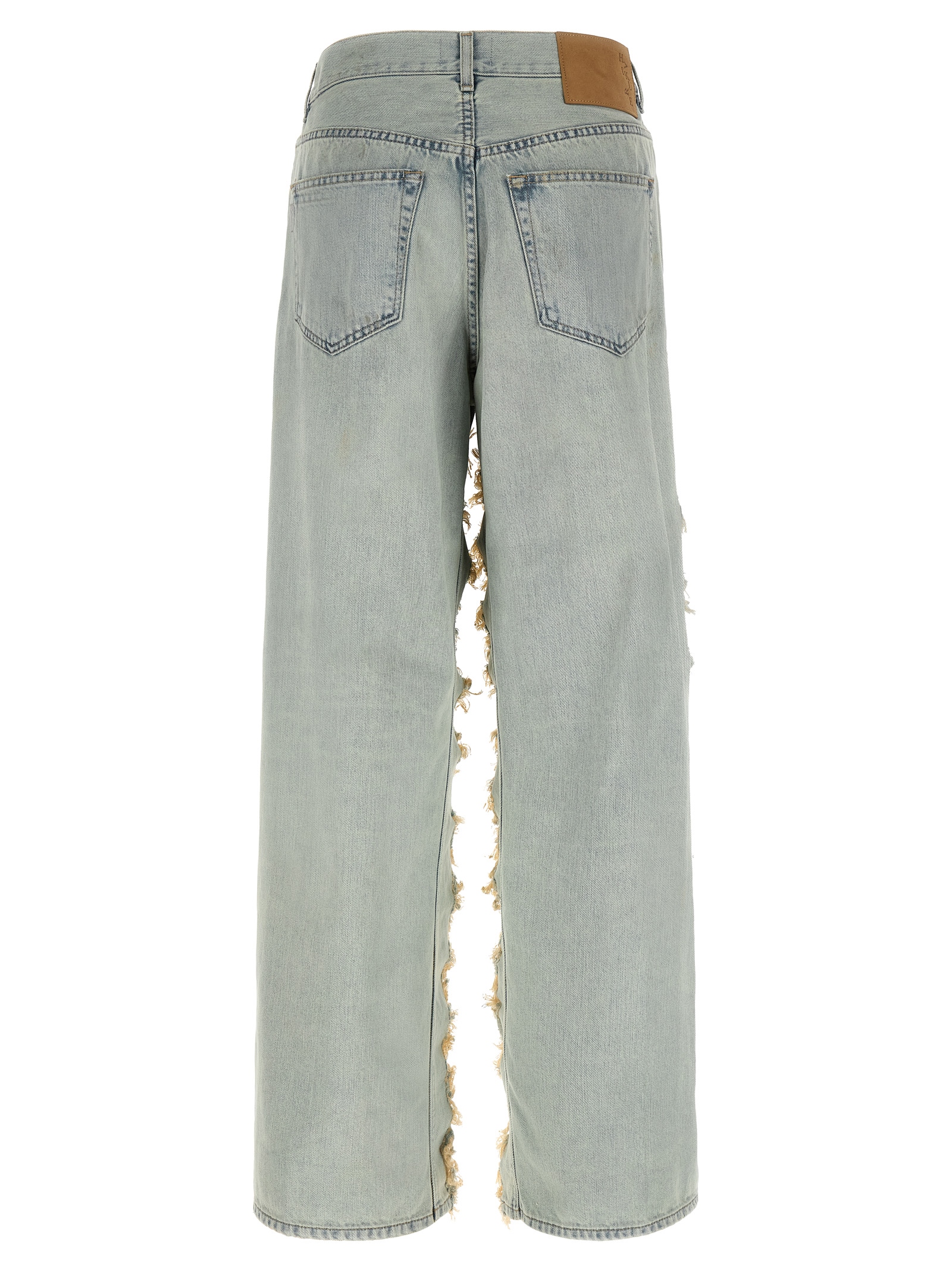 Bull ‘Bonnie’ used-effect cotton denim jeans with front breaks and rips with tonal satin insert, wide flared leg, front zip and button closure, five pockets, back logo tag, and asymmetric leg bottom.