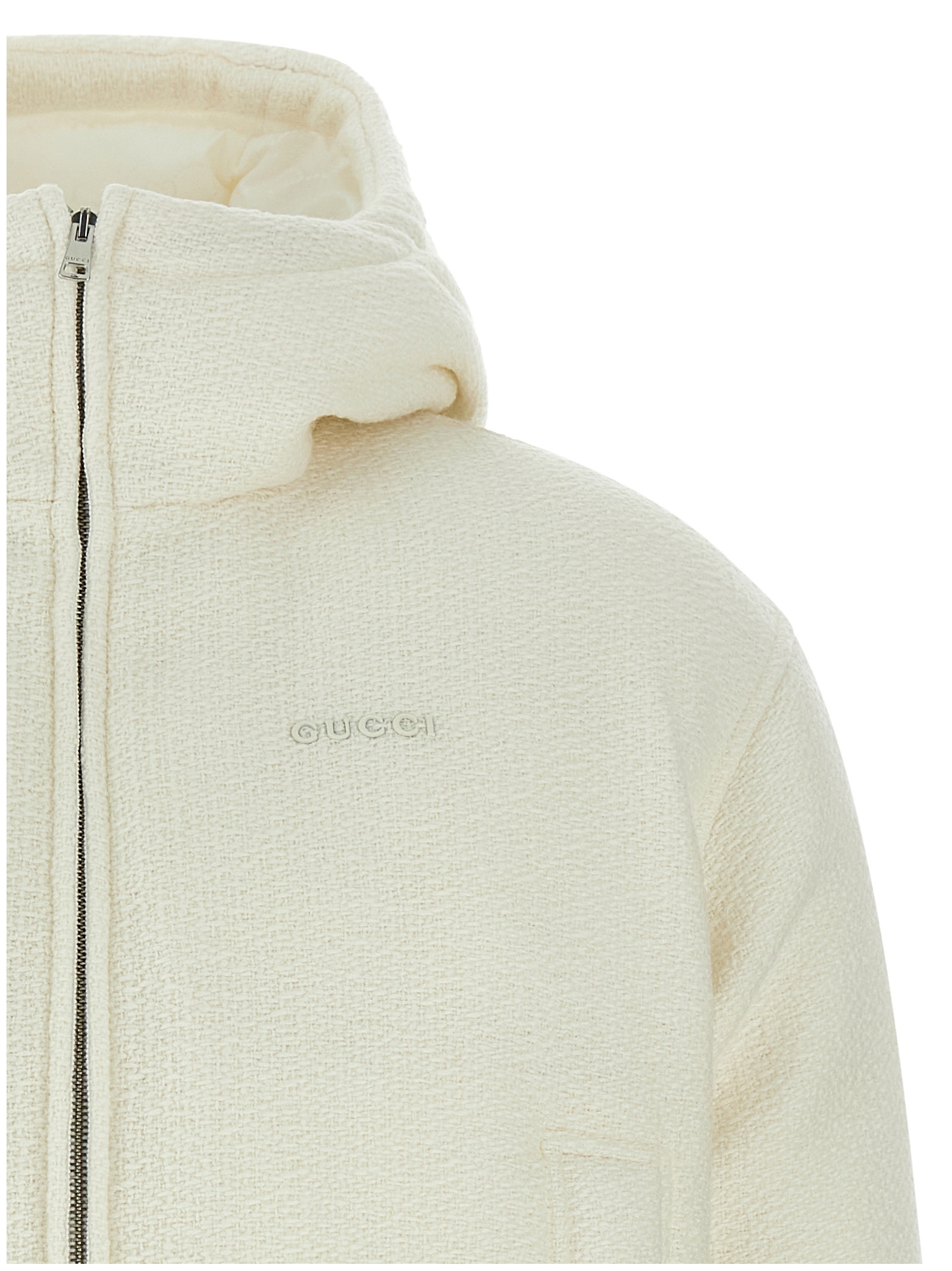 Bouclé wool jacket, GG monogram quilted nylon lining and goose down padding, crop style, adjustable hood, tone-on-tone lettering logo and front zip closure, pockets, long cuffed sleeves.