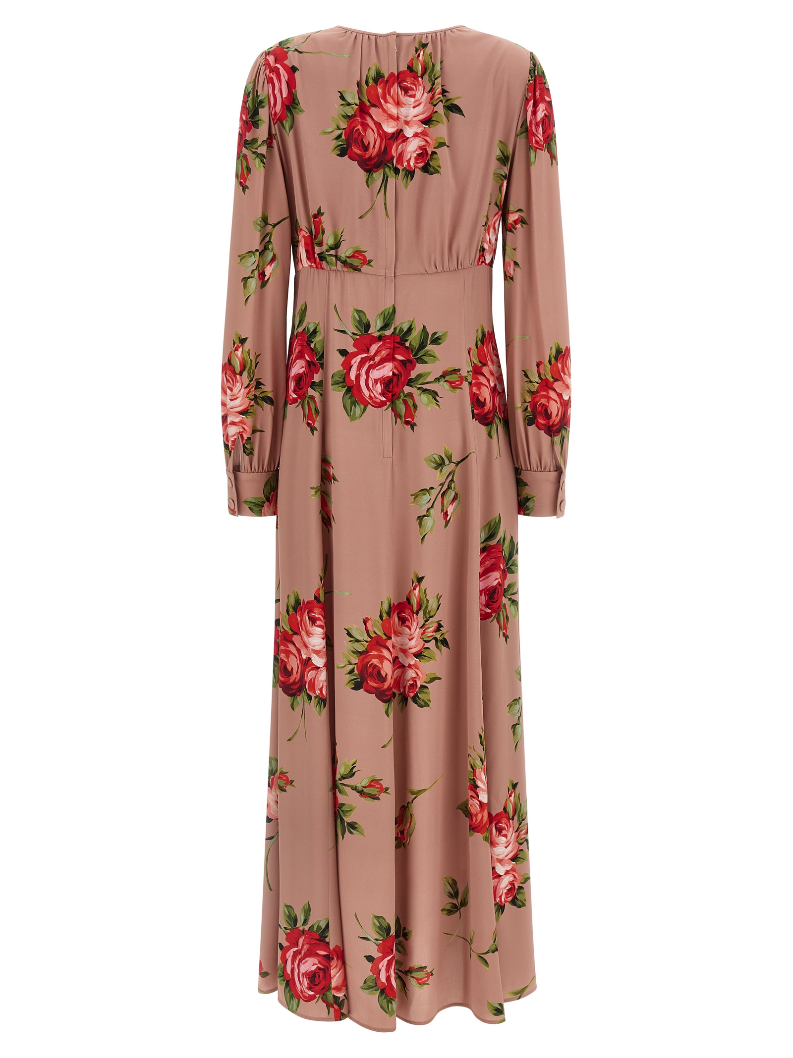 All-over long dress in silk crรชpe with all-over ‘Bouquet Rose’ print, hourglass silhouette with flared wide skirt, crew neck, front bust pleats, back zip closure, long cuffed sleeves, unlined.